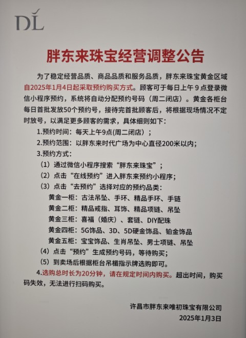 1月3日,胖東來(lái)唯初珠寶有限公司發(fā)布調(diào)整公告,胖東來(lái)珠寶黃金區(qū)域自2025年1月4日起采取預(yù)約購(gòu)買(mǎi)方式。 公告顯示,每日上午9點(diǎn)首批發(fā)放50個(gè)預(yù)約號(hào),接待完首批顧客后,將根據(jù)現(xiàn)場(chǎng)情況不定時(shí)放號(hào)。此次調(diào)整,是繼1月1日起不再提供免費(fèi)調(diào)換服務(wù)后的又一重大舉措。 據(jù)悉,預(yù)約要在商場(chǎng)200米范圍內(nèi)預(yù)約,并且只能預(yù)約當(dāng)日。 此前,在2024年12月27日,胖東來(lái)唯初珠寶有限公司發(fā)布珠寶部商品調(diào)換政策調(diào)整公告,對(duì)商品免費(fèi)調(diào)換標(biāo)準(zhǔn)進(jìn)行調(diào)整。公告顯示,自2025年1月1日起,首飾購(gòu)買(mǎi)后將不再提供免費(fèi)調(diào)換服務(wù);2025年1月1日之前已購(gòu)買(mǎi)商品的顧客,將繼續(xù)按照原有的調(diào)換標(biāo)準(zhǔn)享受服務(wù)。 據(jù)了解,胖東來(lái)取消自營(yíng)黃金珠寶首飾“免調(diào)”服務(wù),一方面是為了倡導(dǎo)顧客健康、理性的消費(fèi)觀(guān)念,另一方面是保障顧客的消費(fèi)安全和品質(zhì)安全。 |