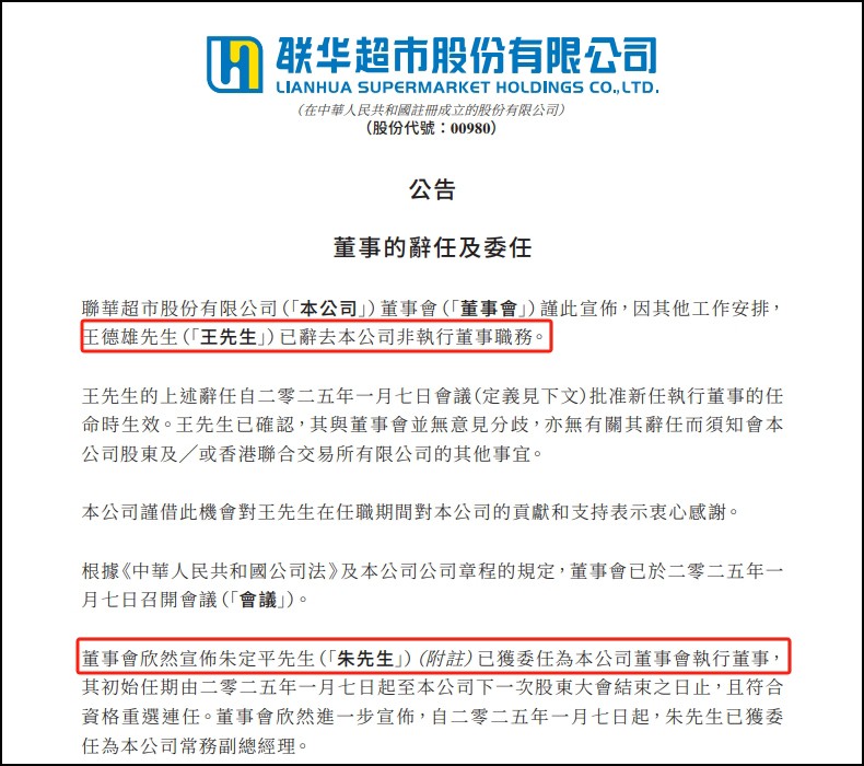 1月7日,聯(lián)華超市股份有限公司(簡稱“聯(lián)華超市”)發(fā)布董事變動公告,宣布王德雄先生因其他工作安排辭去公司非執(zhí)行董事職務(wù),同時任命朱定平先生為新的執(zhí)行董事及常務(wù)副總經(jīng)理。 聯(lián)華超市在公告中指出,因其他工作安排,王德雄先生已辭去公司非執(zhí)行董事職務(wù),該辭任自2025年1月7日會議批準(zhǔn)新任執(zhí)行董事的任命時生效。王德雄先生確認(rèn)與董事會無意見分歧,且無須通知股東其他事項。 與此同時,聯(lián)華超市董事會宣布,朱定平先生已被委任為公司執(zhí)行董事,任期自2025年1月7日起至下一次股東大會結(jié)束之日止,且符合資格重選連任。此外,朱定平先生還被任命為公司常務(wù)副總經(jīng)理,自2025年1月7日起生效。 朱定平先生,48歲,擁有暨南大學(xué)高級管理人員工商管理專業(yè)工商管理碩士學(xué)位,具備豐富的管理經(jīng)驗。他的職業(yè)生涯涵蓋了多個知名企業(yè)和重要職務(wù),包括在廣東明林藥業(yè)有限公司負(fù)責(zé)香港京都念慈庵中國市場品牌推廣和銷售工作,歷任區(qū)域、大區(qū)、總部銷售總監(jiān);在健合(H&H)國際控股有限公司歷任多個高管職位,包括合生元全國高級銷售總監(jiān)、合生元品牌事業(yè)部總經(jīng)理、中國區(qū)總經(jīng)理以及嬰幼兒營養(yǎng)與護(hù)理用品及中國區(qū)執(zhí)行總裁;在杭州可靠護(hù)理用品股份有限公司擔(dān)任首席執(zhí)行官;在美贊臣中國業(yè)務(wù)集團(tuán)歷任多家公司的董事長、總經(jīng)理以及美贊臣中國業(yè)務(wù)集團(tuán)總裁等。 |