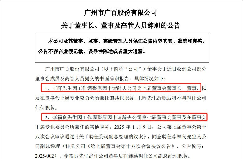 1月9日晚間,廣州市廣百股份有限公司發(fā)布公告稱,董事會于近日收到公司部分董事會成員及高管人員提交的書面辭職報告,具體情況如下: 王暉因工作調(diào)整原因申請辭去公司第七屆董事會董事長、董事,以及在董事會下屬專業(yè)委員會所兼任的其他職務(wù);王暉辭職后將不再擔(dān)任公司任何職務(wù)。 李福良因工作調(diào)整原因申請辭去公司第七屆董事會董事及在董事會下屬專業(yè)委員會所兼任的其他職務(wù)。 2025年1月9日,公司第七屆董事會第十八次會議審議通過《關(guān)于聘任公司副總經(jīng)理的議案》,同意聘任李福良先生為公司副總經(jīng)理,李福良先生辭任公司董事后將繼續(xù)擔(dān)任公司副總經(jīng)理職務(wù)。 根據(jù)《公司法》和《公司章程》的有關(guān)規(guī)定,王暉和李福良辭職不會導(dǎo)致公司董事會成員低于法定人數(shù),其辭職報告自送達董事會之日起生效。為保障公司的日常經(jīng)營不受影響,公司董事會征得王暉本人同意,在公司按照法定程序選舉產(chǎn)生新任董事長之前,其將繼續(xù)履行公司董事長、法定代表人職責(zé)。 公司將盡快按照法定程序完成補選董事及選舉董事長工作。 鐘勇因工作調(diào)整原因申請辭去公司副總經(jīng)理職務(wù)。其辭職報告自送 達董事會之日起生效。鐘勇辭職后將不再擔(dān)任公司任何職務(wù)。 謝安賢因工作調(diào)整原因申請辭去公司副總經(jīng)理職務(wù)。其辭職報告自送達董事會之日起生效。謝安賢辭職后將不再擔(dān)任公司任何職務(wù)。 根據(jù)廣百股份披露2024年第三季度報告。前三季度公司實現(xiàn)營業(yè)收入40.74億元,同比下降5.76%;歸母凈利潤5252.93萬元,同比增長73.58%;扣非凈利潤2573.92萬元,同比增長56.17%。 |