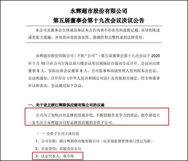 1月10日,永輝超市股份有限公司發(fā)布公告,披露了第五屆董事會第十九次會議的決議情況。 公告顯示,永輝超市于2025年1月10日在公司左?偛苛鶚菚h室以現(xiàn)場結(jié)合通訊方式召開了第五屆董事會第十九次會議,會議應(yīng)出席董事9人,實際出席董事9人。會議審議并通過了關(guān)于設(shè)立浙江輝聯(lián)供應(yīng)鏈有限公司的議案,旨在加快公司自有品牌的發(fā)展,挖掘具有競爭力的商品。 浙江輝聯(lián)供應(yīng)鏈有限公司為永輝超市的全資子公司,企業(yè)類型為有限責(zé)任公司,法定代表人為龐小偉,注冊資本為實繳人民幣2000萬元。該公司的經(jīng)營范圍廣泛,包括供應(yīng)鏈管理服務(wù)、各類商品銷售、財務(wù)咨詢、信息咨詢服務(wù)、普通貨物倉儲服務(wù)等。 |