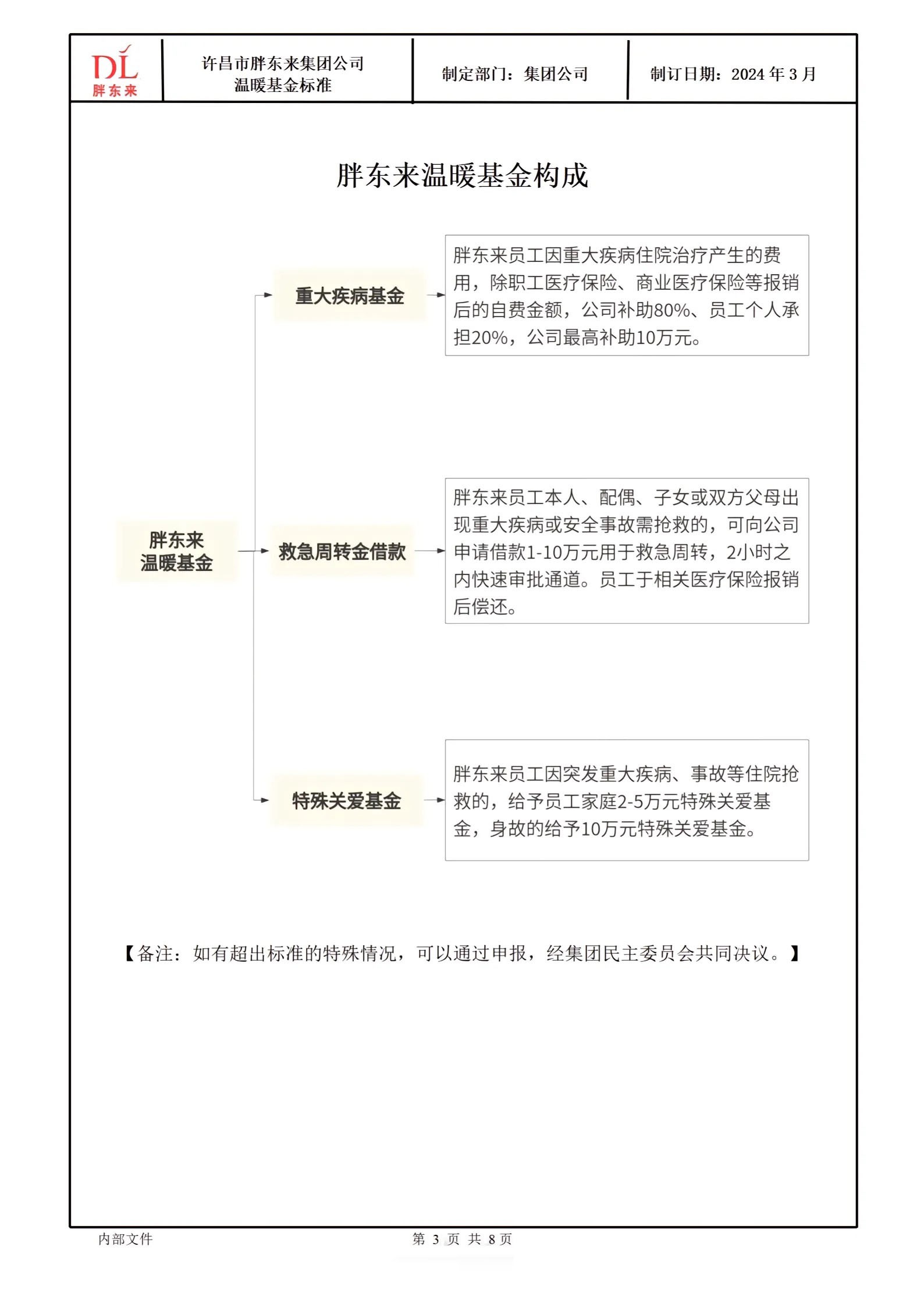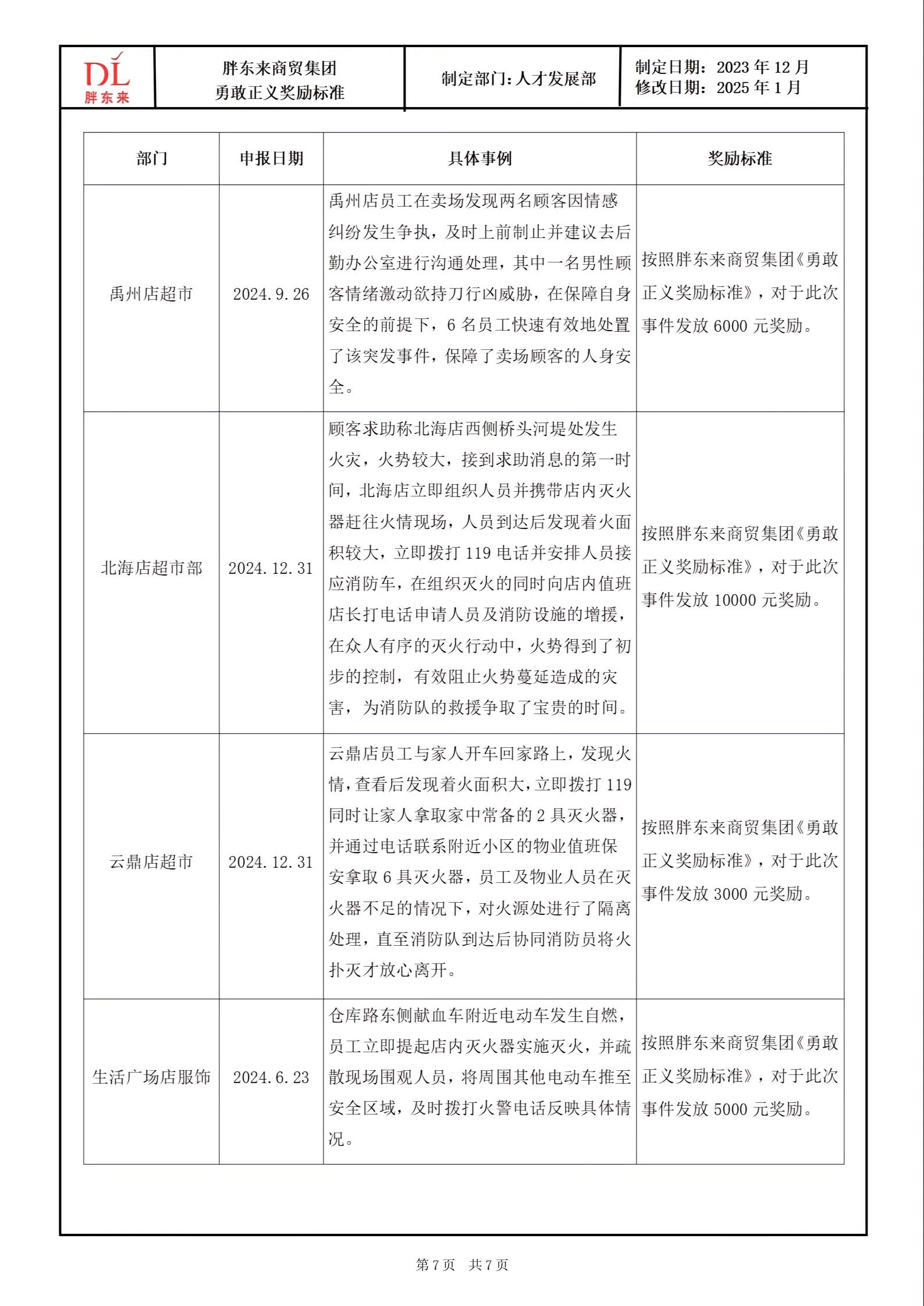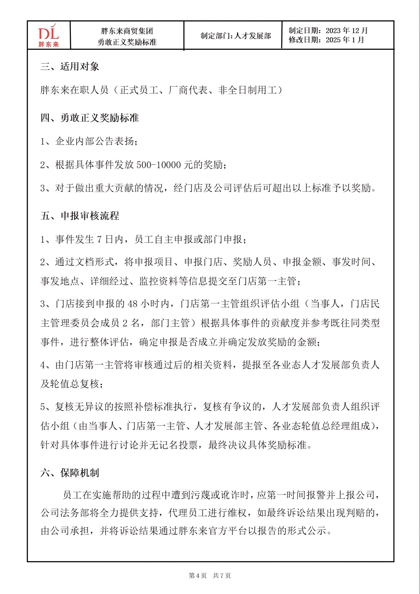 1月13日,胖東來創(chuàng)始人于東來在其社媒發(fā)布胖東來商貿(mào)集團溫暖基金標準和勇敢正義獎勵標準。 《胖東來商貿(mào)集團溫暖基金標準》的發(fā)布,是為了更好地引導(dǎo)每一位胖東來人懂得用科學(xué)的方法安排規(guī)劃人生,不因為缺乏抵抗風(fēng)險的意識和能力,給自己和家庭帶來沉重的負擔及痛苦,在基本生活得到后盾保障的基礎(chǔ)上,實現(xiàn)輕松、陽光、從容的生命品質(zhì)。 胖東來通過規(guī)范員工基礎(chǔ)保險,提升員工抵抗風(fēng)險的意識和能力,面對突如其來的重大疾病、意外事故等時,能夠更理性從容的面對和處理,也通過創(chuàng)立胖東來溫暖基金,讓員工面臨此類重大醫(yī)療風(fēng)險時能夠得到更加有效、有力的保障,減輕心理負擔、解決后顧之憂。 胖東來溫暖基金一共分為重大疾病基金、救急周轉(zhuǎn)金借款以及特殊關(guān)愛基金。其中,重大疾病基金一欄顯示,胖東來員工因重大疾病住院治療產(chǎn)生的費用,除職工醫(yī)療保險、商業(yè)醫(yī)療保險等報銷后的自費金額,公司補助80%、員工個人承擔20%,公司最高補助10萬元。 而《胖東來商貿(mào)集團勇敢正義獎勵標準》則是為了更好地成就每一位胖東來人勇敢、正義、向善的美好品質(zhì),真正釋放內(nèi)心的愛與善良,讓更多人感受和回歸人性的美好,彼此信任和友善。 同時,通過胖東來勇敢正義獎勵標準的建立及執(zhí)行,鼓勵大家面對意外事故、公共危險或他人處于困境需要救助的情形時,在保護好自身安全的前提下,勇敢地為他人提供幫助或救援。 具體來看,胖東來勇敢正義獎勵標準分為三種:1、企業(yè)內(nèi)部公告表揚;2、根據(jù)具體事件發(fā)放500-10000元的獎勵;3、對于做出重大貢獻的情況,經(jīng)門店及公司評估后可超出以上標準予以獎勵。 勇敢正義的行為包括:1、對于處于危險中的他人,在保護自己的基礎(chǔ)上采取救助行動或報警、叫救護車等;2、在發(fā)生災(zāi)害的場合,個人能力范圍內(nèi)的搶險、救災(zāi)、救人或協(xié)助專業(yè)人員救援的行為;3、意識到危險情況,采取個人行動提前規(guī)避危及生命安全、財產(chǎn)安全等的因素。 |