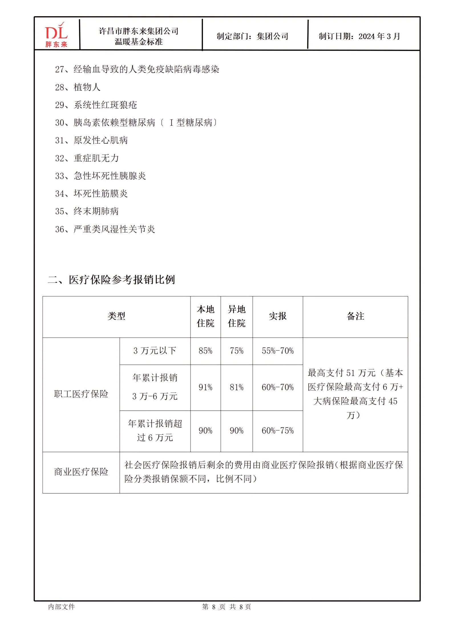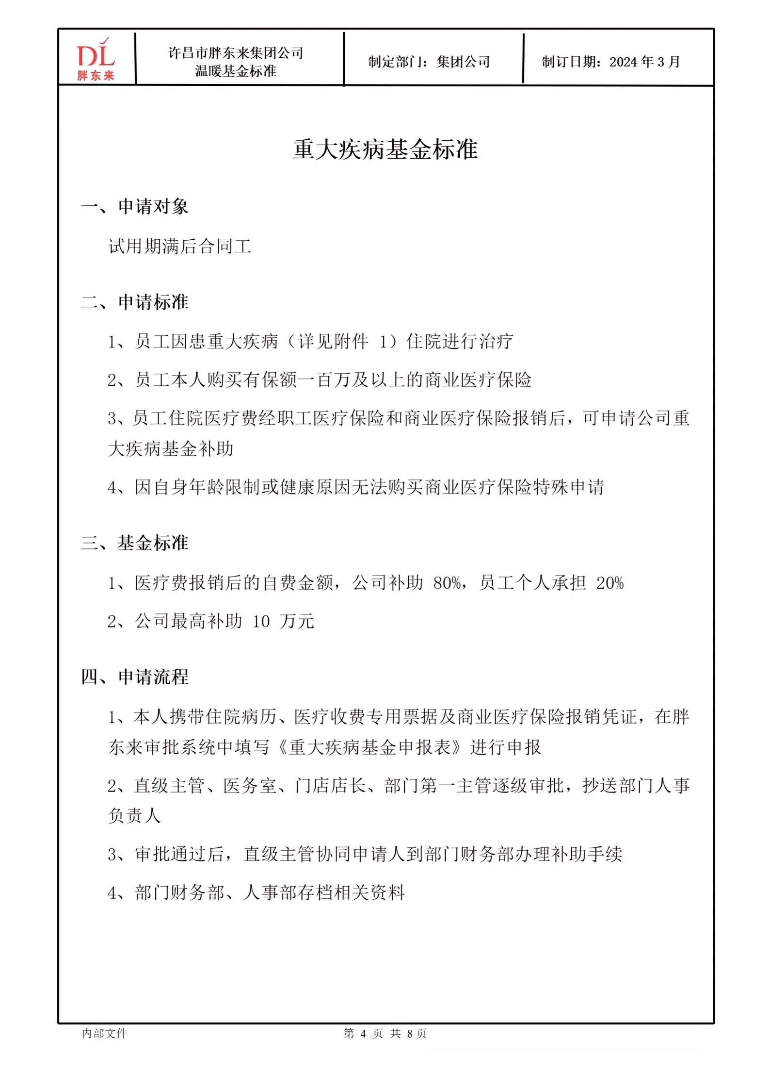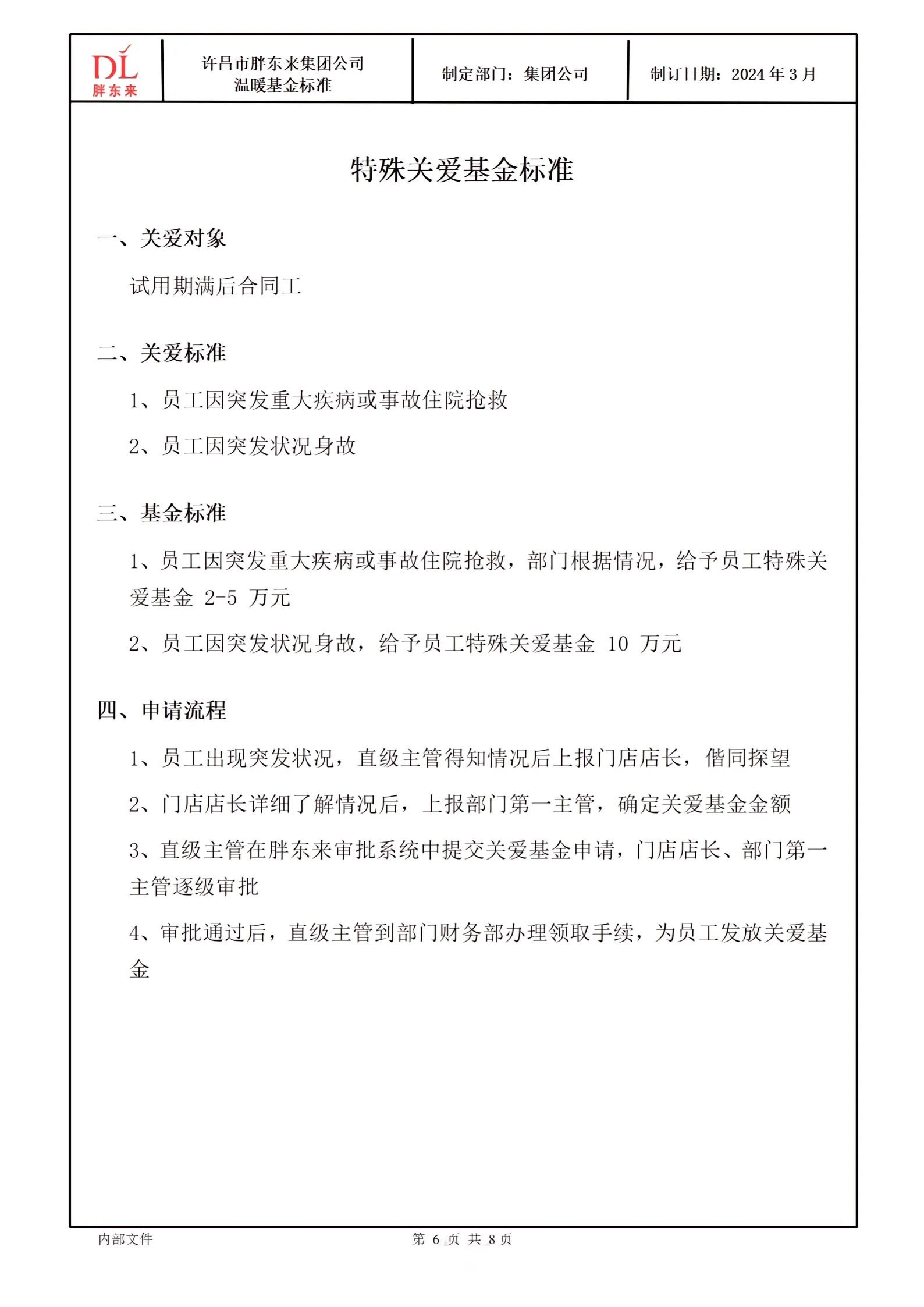 1月13日,胖東來創(chuàng)始人于東來在其社媒發(fā)布胖東來商貿(mào)集團溫暖基金標準和勇敢正義獎勵標準。 《胖東來商貿(mào)集團溫暖基金標準》的發(fā)布,是為了更好地引導(dǎo)每一位胖東來人懂得用科學(xué)的方法安排規(guī)劃人生,不因為缺乏抵抗風(fēng)險的意識和能力,給自己和家庭帶來沉重的負擔及痛苦,在基本生活得到后盾保障的基礎(chǔ)上,實現(xiàn)輕松、陽光、從容的生命品質(zhì)。 胖東來通過規(guī)范員工基礎(chǔ)保險,提升員工抵抗風(fēng)險的意識和能力,面對突如其來的重大疾病、意外事故等時,能夠更理性從容的面對和處理,也通過創(chuàng)立胖東來溫暖基金,讓員工面臨此類重大醫(yī)療風(fēng)險時能夠得到更加有效、有力的保障,減輕心理負擔、解決后顧之憂。 胖東來溫暖基金一共分為重大疾病基金、救急周轉(zhuǎn)金借款以及特殊關(guān)愛基金。其中,重大疾病基金一欄顯示,胖東來員工因重大疾病住院治療產(chǎn)生的費用,除職工醫(yī)療保險、商業(yè)醫(yī)療保險等報銷后的自費金額,公司補助80%、員工個人承擔20%,公司最高補助10萬元。 而《胖東來商貿(mào)集團勇敢正義獎勵標準》則是為了更好地成就每一位胖東來人勇敢、正義、向善的美好品質(zhì),真正釋放內(nèi)心的愛與善良,讓更多人感受和回歸人性的美好,彼此信任和友善。 同時,通過胖東來勇敢正義獎勵標準的建立及執(zhí)行,鼓勵大家面對意外事故、公共危險或他人處于困境需要救助的情形時,在保護好自身安全的前提下,勇敢地為他人提供幫助或救援。 具體來看,胖東來勇敢正義獎勵標準分為三種:1、企業(yè)內(nèi)部公告表揚;2、根據(jù)具體事件發(fā)放500-10000元的獎勵;3、對于做出重大貢獻的情況,經(jīng)門店及公司評估后可超出以上標準予以獎勵。 勇敢正義的行為包括:1、對于處于危險中的他人,在保護自己的基礎(chǔ)上采取救助行動或報警、叫救護車等;2、在發(fā)生災(zāi)害的場合,個人能力范圍內(nèi)的搶險、救災(zāi)、救人或協(xié)助專業(yè)人員救援的行為;3、意識到危險情況,采取個人行動提前規(guī)避危及生命安全、財產(chǎn)安全等的因素。 |