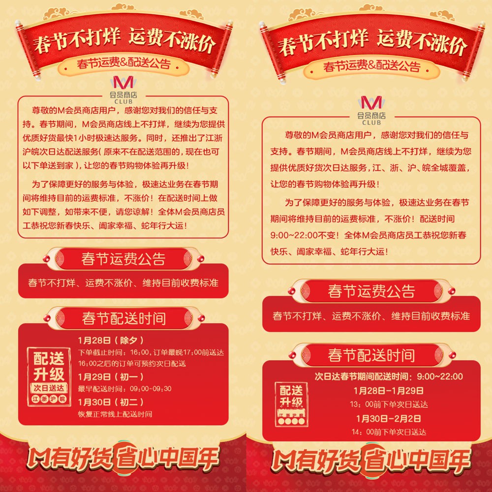 隨著春節(jié)即將到來,大潤發(fā)M會員店新春系列商品火爆熱賣,并宣布新春運費不漲價、線上線下不打烊;上線春節(jié)好禮次日達(dá)、好禮代寄全國送等配送服務(wù)。M會員店還于春節(jié)前推出寵物進(jìn)店系列友好服務(wù),成為首家寵物友好會員制商店。 新春運費不漲價 線上線下不打烊 M會員店宣布,春節(jié)線上線下不打烊,并承諾運費不漲價,繼續(xù)為會員提供全渠道優(yōu)質(zhì)服務(wù),春節(jié)期間堅守崗位的配送員春節(jié)加班補貼由公司承擔(dān)。 M會員店全部門店提供極速達(dá)、半日達(dá)、次日達(dá)、線下購物代寄服務(wù)等多種配送服務(wù)。最快一小時“極速達(dá)”涵蓋超2000種會員日常高頻采買的商品。 線上江浙滬皖次日達(dá) 線下購物全國送 在商品熱賣的同時,大潤發(fā)M會員店滿足消費者的購物需求,線上服務(wù)再升級。在原有的“極速達(dá)”、“半日達(dá)”的基礎(chǔ)上,新增“次日達(dá)”配送服務(wù),配送范圍覆蓋江蘇、浙江、安徽、上海地區(qū)。會員在M會員商店APP每天16:00前下單,超2000款常溫商品次日即可送達(dá),滿199元且10kg以內(nèi)還能享受包郵服務(wù)。 今年春節(jié),大潤發(fā)M會員店還貼心推出線下“好禮全國送”服務(wù)。在店內(nèi)選購的心意好禮,門店可提供全國快遞代寄服務(wù),由京東物流配送,將濃濃的年節(jié)祝福送到親朋好友手中,讓大家過個省心年。 帶著寵物逛超市 打造寵物友好購物環(huán)境 大潤發(fā)M會員店不斷推出友好貼心服務(wù)。近期增設(shè)了一系列寵物友好服務(wù),成為全國首家寵物可進(jìn)店的寵物友好會員制商店。店內(nèi)提供寬敞、舒適的寵物專用購物車,讓“毛孩子”家長們能與愛寵一同享受逛店的樂趣。 圖:M會員店推出寵物進(jìn)店友好服務(wù),寵物專屬推車整齊陳列 除了寵物可進(jìn)店,M會員店還提供寵物寄存服務(wù),以及一次性寵物尿墊等日常所需物品。同時,店內(nèi)還設(shè)有系列寵物商品專區(qū),為寵物的衣食住行提供全方位的選擇。 大潤發(fā)M會員店開展多種暖心服務(wù)舉措,為會員在繁忙的節(jié)日籌備中提供貼心關(guān)懷,為春節(jié)增添了一份別樣的溫暖與便捷,助力大家度過一個歡樂無憂的新春佳節(jié)。 |