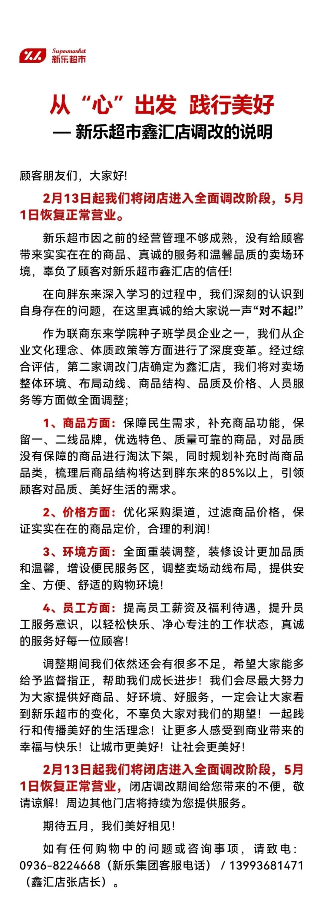 2月13日,新樂超市鑫匯店正式啟動閉店調(diào)改,將于5月1日恢復營業(yè)。 作為聯(lián)商東來商業(yè)研究院種子班學員企業(yè)之一,新樂超市學習胖東來這三年來,從企業(yè)文化、經(jīng)營理念、體制政策等方面進行了全方位的變革。在門店端,從2024年下半年開始啟動新一輪全面調(diào)改,鑫匯店便是第二家深度調(diào)改門店。 該店位于甘肅省張掖市甘州區(qū)鑫匯國際負一層,于2018年11月28日開業(yè),經(jīng)營面積8800平方米,擁有約17000個SKU。本次調(diào)改,門店將從整體裝修、賣場環(huán)境、動線布局、商品結(jié)構(gòu)、品質(zhì)和價格、服務質(zhì)量、員工待遇等方面進行全方位優(yōu)化升級。 商品方面:保障民生需求,補充商品功能,保留一、二線品牌,對品質(zhì)沒有保障的三、四線品牌商品進行淘汰下架,同時規(guī)劃補充時尚商品品類,梳理后商品結(jié)構(gòu)將達到胖東來的85%以上。 鑫匯店本次調(diào)改將著重提升熟食、烘焙、面點等現(xiàn)場加工品類的商品能力,擴大生鮮品類的經(jīng)營占比,提升賣場煙火氣。比如,門店將擴大熟食區(qū),由目前的2個島增加至4個島,品類將更加豐富。此外,門店還將專門設(shè)置堂食區(qū),滿足消費者“可見即可享”的美食體驗。 價格方面:新樂超市將以保障顧客利益為先,通過科學合理地規(guī)劃商品,制定相應的定價策略,優(yōu)化采購渠道,精準成本核算,實實在在定價,讓商品價格更合理,同時也保持合理的利潤。 環(huán)境方面:門店將進行全面的重裝升級,參照胖東來門店的裝修風格與色彩,結(jié)合燈光設(shè)計,通過巧妙的燈光角度和亮度調(diào)節(jié),結(jié)合低貨架設(shè)置,更加聚焦商品細節(jié),帶給顧客更加強烈的商品陳列層次感和良好的視覺感受,全面提升賣場環(huán)境和品質(zhì)。 與此同時,門店將取消行業(yè)慣用的強制動線,設(shè)置寬敞的賣場通道、流暢的動線以及清晰合理的賣場布局,同時增加收銀設(shè)備和人員配備,并打改造全新便民服務區(qū)、顧客休息區(qū)和高品質(zhì)衛(wèi)生間,為顧客提供舒適、便利的購物環(huán)境。 員工福利待遇方面:新樂超市自加入聯(lián)商東來商業(yè)研究院種子班以來,就一直遵循“讓員工更幸!钡哪繕耍隗w制政策、薪酬待遇、人文關(guān)懷等方面都在不斷優(yōu)化提升。 本次調(diào)改,新樂超市將進一步提高員工薪資及福利待遇,提升員工服務意識,以輕松快樂、凈心專注的工作狀態(tài),真誠的服務好每一位顧客。 作為本輪深度調(diào)改的首店,新樂超市西關(guān)店自2024年10月1日恢復營業(yè)至今,銷售額同比增長101%,翻了一倍多,這也為鑫匯店的調(diào)改注入了強勁的信心。正如東來哥所言,堅持真誠與品質(zhì),自然會收獲美好。 |