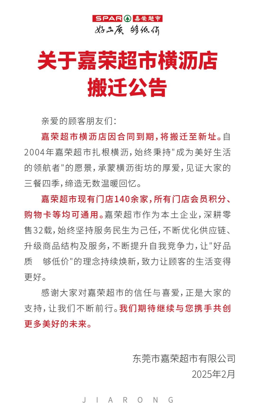 近日,東莞嘉榮超市發(fā)布公告,宣布嘉榮超市橫瀝店因合同到期,將搬遷至新址。 公告中提到,嘉榮超市現(xiàn)有門店140余家,所有門店的會員積分、購物卡等均可通用。這一安排旨在確保顧客在搬遷過渡期間能夠無縫銜接,繼續(xù)享受嘉榮超市的優(yōu)質服務。 |