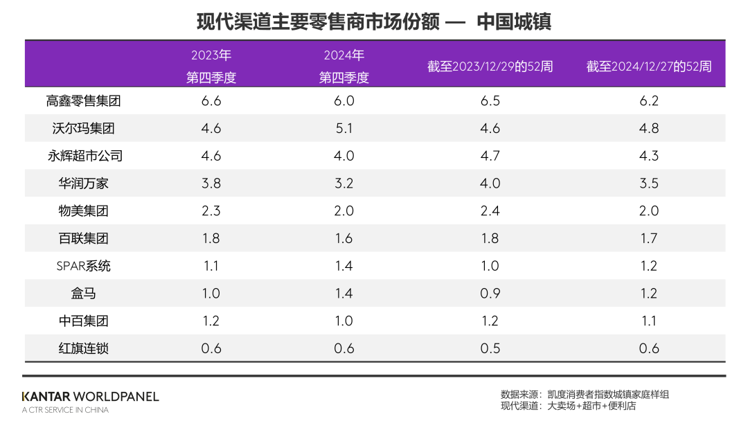 凱度消費(fèi)者指數(shù)的最新報(bào)告顯示,中國(guó)城鎮(zhèn)快速消費(fèi)品市場(chǎng)四季度銷售額同比增長(zhǎng)1.2%,2024全年銷額同比增長(zhǎng)1.7%,整體發(fā)展處于平穩(wěn)態(tài)勢(shì)。 品類方面,飲料品類增長(zhǎng)顯著,全年銷售額增長(zhǎng)超7%。個(gè)護(hù)類依然處于下行階段,但在第四季度的降幅有所收窄;乳制品仍面臨著顯著增長(zhǎng)壓力。 從區(qū)域看,2024年全年,除南區(qū)外,東區(qū)、西區(qū)和北區(qū)均有所增長(zhǎng)。從不同城市級(jí)別來(lái)看,下線城市特別是縣級(jí)市和鎮(zhèn)級(jí)市場(chǎng),成為快速消費(fèi)品市場(chǎng)增長(zhǎng)的關(guān)鍵。隨著城鎮(zhèn)化率的提升,消費(fèi)市場(chǎng)規(guī)模和需求也將進(jìn)一步釋放。 現(xiàn)代渠道(大賣場(chǎng)、超市、便利店)在四季度出現(xiàn)0.4%的輕微降幅。其中,大型業(yè)態(tài)如大賣場(chǎng)、大超市仍為主要影響因素。小型業(yè)態(tài)中,便利店在四季度出現(xiàn)下滑。南區(qū)作為便利店發(fā)展的重要區(qū)域,在四季度明顯下滑。 凱度消費(fèi)者指數(shù)的數(shù)據(jù)顯示,四季度南區(qū)便利店的滲透率減少3.7個(gè)百分點(diǎn)。一方面是受到折扣業(yè)態(tài)的沖擊,折扣店吸引了大量原本便利店的客源;另一方面,也受到線上渠道的分流影響。即時(shí)零售平臺(tái)以及電商平臺(tái)的小時(shí)達(dá)服務(wù)持續(xù)完善,削弱了便利店的便利性優(yōu)勢(shì)。 前十位零售商中,盒馬的增速最為亮眼。憑借著積極的門(mén)店擴(kuò)張以及業(yè)務(wù)范圍拓展,四季度中,盒馬的銷額占比相比去年同期增長(zhǎng)0.4個(gè)百分點(diǎn)。沃爾瑪、SPAR系統(tǒng)的市場(chǎng)份額也均有所提升。 |
