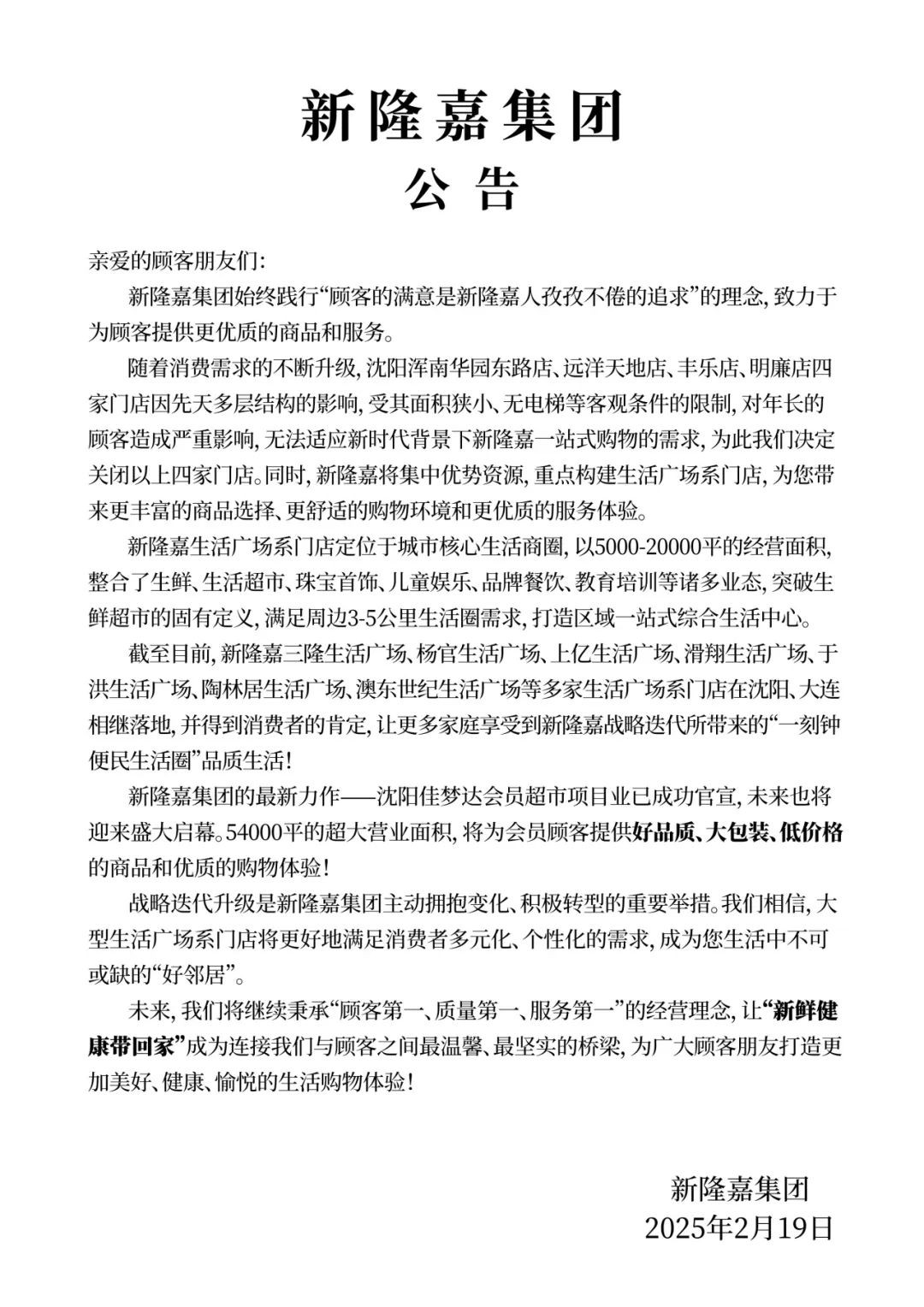 新隆嘉集團近日發(fā)布公告,宣布其戰(zhàn)略升級計劃,其中包括關閉部分門店,并推出生活廣場系門店及佳夢達會員超市。 《職業(yè)零售網》獲悉,2月19日,新隆嘉集團官方公眾號發(fā)布一則重要公告。公告中稱,隨著消費需求的不斷升級,集團將對旗下部分門店進行調整。據悉,沈陽地區(qū)的渾南華園東路店、遠洋天地店、豐樂店、明廉店四家門店,由于先天多層結構限制,面積狹小且缺乏電梯等基礎設施,給年長顧客帶來諸多不便,已無法適應新時代背景下新隆嘉一站式購物的需求。因此,新隆嘉集團決定關閉以上四家門店。 與此同時,新隆嘉集團將集中優(yōu)勢資源,全力打造生活廣場系門店。這些門店將為顧客提供更豐富的商品選擇、更舒適的購物環(huán)境以及更優(yōu)質的服務體驗。生活廣場系門店定位于城市核心生活商圈,經營面積在5000-20000平方米之間,整合了生鮮、生活超市、珠寶首飾、兒童娛樂、品牌餐飲、教育培訓等諸多業(yè)態(tài),突破了傳統(tǒng)生鮮超市的固有定義,滿足周邊3-5公里生活圈內消費者的多元化需求,致力于打造區(qū)域一站式綜合生活中心。 截至目前,新隆嘉三隆生活廣場、楊官生活廣場、上億生活廣場、滑翔生活廣場、于洪生活廣場、陶林居生活廣場、澳東世紀生活廣場等多家生活廣場系門店已在沈陽、大連等地相繼開業(yè),并獲得了消費者的廣泛認可。這些門店讓更多家庭享受到了新隆嘉戰(zhàn)略迭代所帶來的“一刻鐘便民生活圈”品質生活。 此外,新隆嘉集團的最新力作——沈陽佳夢達會員超市項目也已成功官宣,即將迎來盛大開業(yè)。該超市擁有54000平方米的超大營業(yè)面積,將為會員顧客提供高品質、大包裝、低價格的商品以及優(yōu)質的購物體驗。 新隆嘉集團表示,此次戰(zhàn)略迭代升級是公司主動擁抱變化、積極轉型的重要舉措。他們堅信,大型生活廣場系門店將更好地滿足消費者多元化、個性化的需求,成為消費者生活中不可或缺的“好鄰居”。 未來,新隆嘉集團將繼續(xù)秉承“顧客第一、質量第一、服務第一”的經營理念,讓“新鮮健康帶回家”成為連接公司與顧客之間最溫馨、最堅實的橋梁,為廣大顧客打造更加美好、健康、愉悅的生活購物體驗。 |