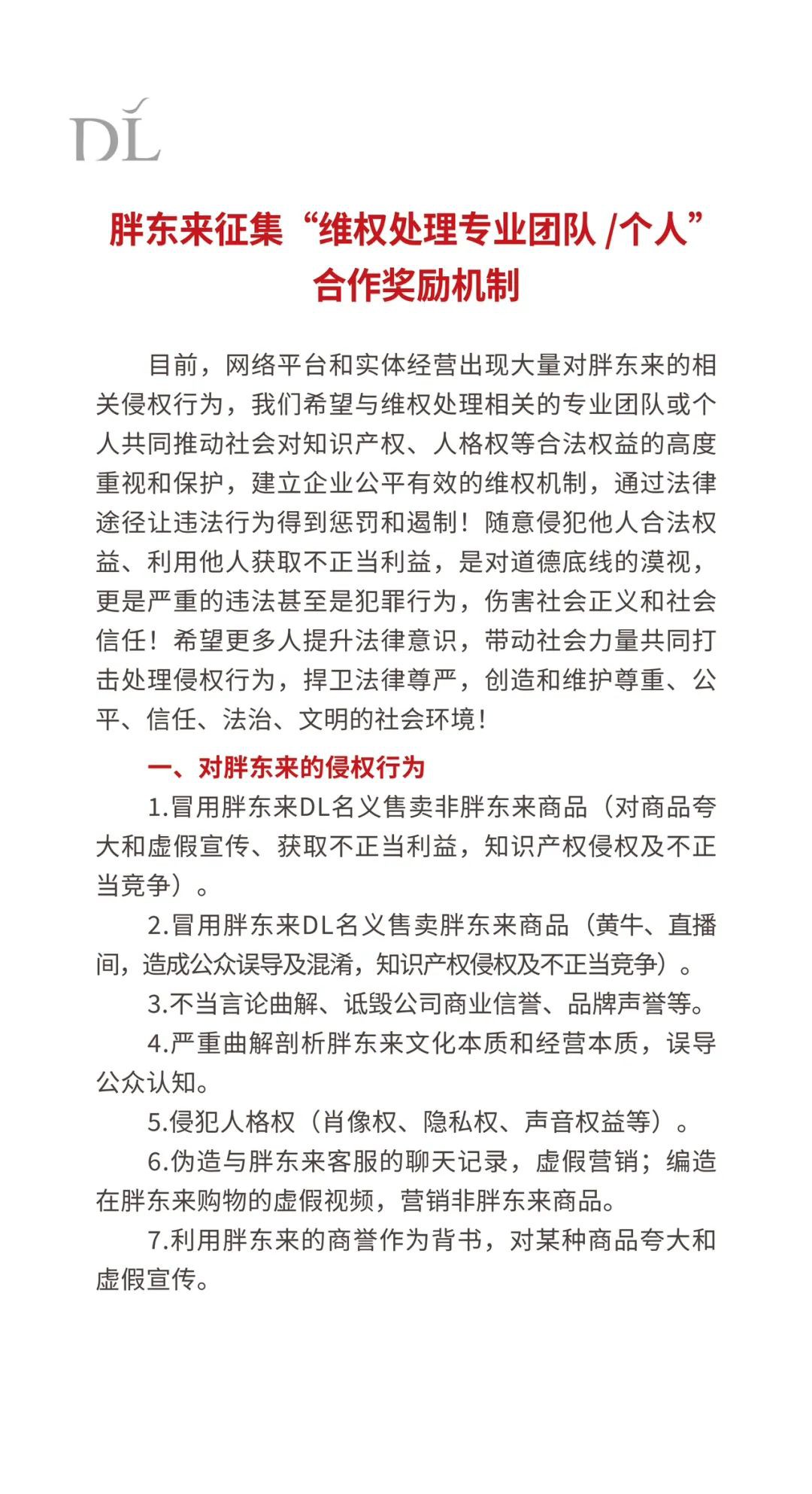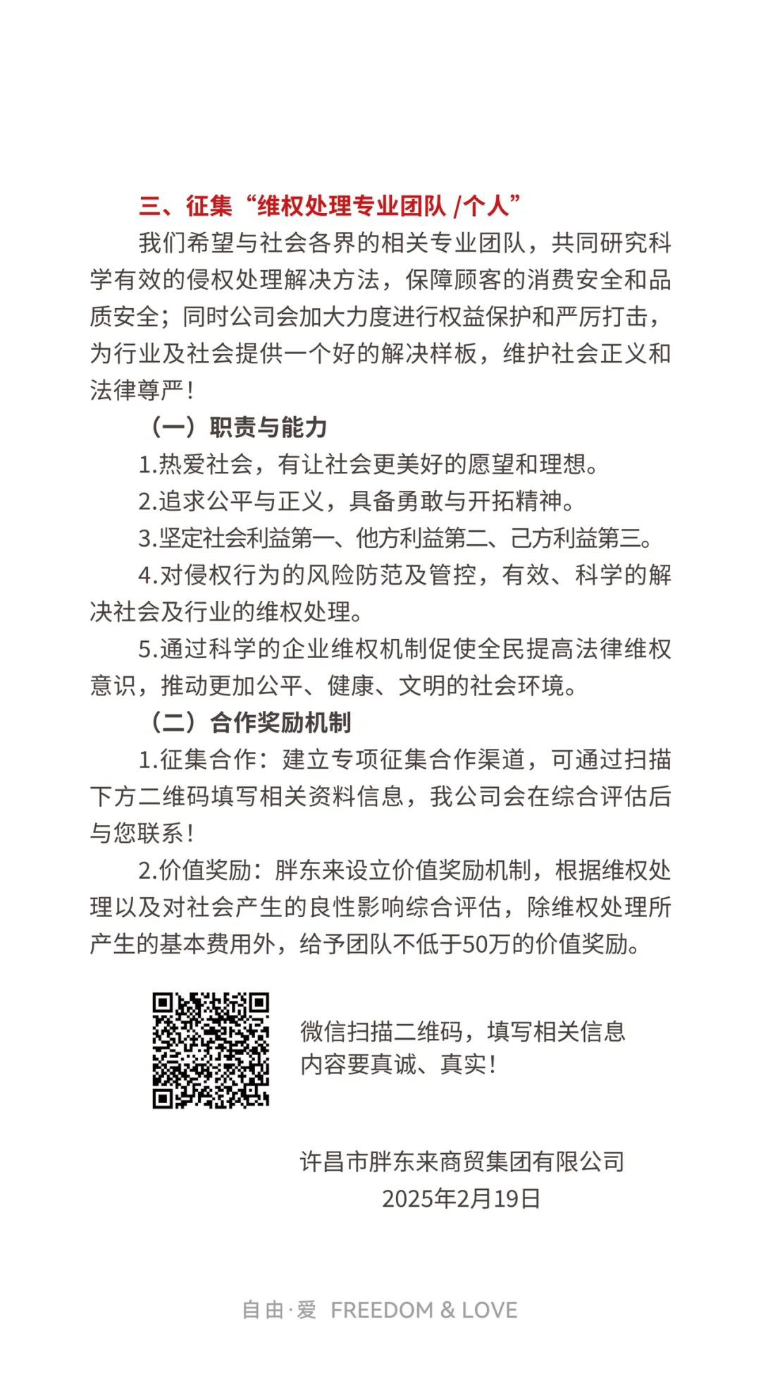 2月19日,胖東來官方賬號(hào)發(fā)布一則“胖東來征集‘維權(quán)處理專業(yè)團(tuán)隊(duì)/個(gè)人’合作獎(jiǎng)勵(lì)機(jī)制”信息。 其中提到,當(dāng)前,網(wǎng)絡(luò)平臺(tái)和實(shí)體經(jīng)營中存在大量針對(duì)胖東來的侵權(quán)行為,包括冒用名義售假、詆毀商業(yè)信譽(yù)、侵犯人格權(quán)等多種形式,侵犯了消費(fèi)者的權(quán)益,破壞了法治環(huán)境,傷害了社會(huì)的正義和誠信,對(duì)侵權(quán)者自身也會(huì)造成嚴(yán)重后果。為此,胖東來希望與專業(yè)團(tuán)隊(duì)或個(gè)人合作,共同打擊侵權(quán)。該則信息中要求,合作方需熱愛社會(huì)、追求公平正義,具備侵權(quán)風(fēng)險(xiǎn)防范和管控能力。 為吸引專業(yè)力量參與,胖東來設(shè)立價(jià)值獎(jiǎng)勵(lì)機(jī)制,參與合作的團(tuán)隊(duì),除維權(quán)處理所產(chǎn)生的基本費(fèi)用外,還將根據(jù)維權(quán)處理以及對(duì)社會(huì)產(chǎn)生的良性影響進(jìn)行綜合評(píng)估,給予團(tuán)隊(duì)不低于50萬的價(jià)值獎(jiǎng)勵(lì)。 此前,針對(duì)侵權(quán)行為,胖東來曾在2024年11月24日、2024年12月1日發(fā)布譴責(zé)并打擊侵權(quán)行為的聲明。 2025年1月3日,胖東來通過公眾號(hào)發(fā)布了“胖東來關(guān)于侵權(quán)行為的處理公示”,公告了包括各種已訴訟侵權(quán)案件的結(jié)果及已取證起訴的侵權(quán)賬號(hào)。 此次發(fā)布征集“維權(quán)處理專業(yè)團(tuán)隊(duì)/個(gè)人”合作獎(jiǎng)勵(lì)機(jī)制,將有利于通過社會(huì)力量,共同研究科學(xué)有效的侵權(quán)處理解決方法;為行業(yè)及社會(huì)提供一個(gè)好的解決樣板,維護(hù)社會(huì)正義和法律尊嚴(yán)! 胖東來始終堅(jiān)定圍繞文化發(fā)展方向,為行業(yè)、社會(huì)提供真誠、公平、健康的經(jīng)營管理模式和運(yùn)營體系樣板,加強(qiáng)文明建設(shè)、踐行和落實(shí),希望與大家一起推動(dòng)社會(huì)文明的進(jìn)步和發(fā)展,實(shí)現(xiàn)更多人輕松、美好的生命狀態(tài),共同為社會(huì)創(chuàng)造更多信任、友善的人文環(huán)境,讓人們更幸福、讓社會(huì)更文明、讓國家更美好! 以下是征集公告全文: 胖東來征集“維權(quán)處理專業(yè)團(tuán)隊(duì) /個(gè)人”合作獎(jiǎng)勵(lì)機(jī)制 目前,網(wǎng)絡(luò)平臺(tái)和實(shí)體經(jīng)營出現(xiàn)大量對(duì)胖東來的相關(guān)侵權(quán)行為,我們希望與維權(quán)處理相關(guān)的專業(yè)團(tuán)隊(duì)或個(gè)人共同推動(dòng)社會(huì)對(duì)知識(shí)產(chǎn)權(quán)、人格權(quán)等合法權(quán)益的高度重視和保護(hù),建立企業(yè)公平有效的維權(quán)機(jī)制,通過法律途徑讓違法行為得到懲罰和遏制!隨意侵犯他人合法權(quán)益、利用他人獲取不正當(dāng)利益,是對(duì)道德底線的漠視,更是嚴(yán)重的違法甚至是犯罪行為,傷害社會(huì)正義和社會(huì)信任!希望更多人提升法律意識(shí),帶動(dòng)社會(huì)力量共同打擊處理侵權(quán)行為,捍衛(wèi)法律尊嚴(yán),創(chuàng)造和維護(hù)尊重、公平、信任、法治、文明的社會(huì)環(huán)境! 一、對(duì)胖東來的侵權(quán)行為 1.冒用胖東來DL名義售賣非胖東來商品(對(duì)商品夸大和虛假宣傳、獲取不正當(dāng)利益,知識(shí)產(chǎn)權(quán)侵權(quán)及不正當(dāng)競爭)。 2.冒用胖東來DL名義售賣胖東來商品(黃牛、直播間,造成公眾誤導(dǎo)及混淆,知識(shí)產(chǎn)權(quán)侵權(quán)及不正當(dāng)競爭)。 3.不當(dāng)言論曲解、詆毀公司商業(yè)信譽(yù)、品牌聲譽(yù)等。 4.嚴(yán)重曲解剖析胖東來文化本質(zhì)和經(jīng)營本質(zhì),誤導(dǎo)公眾認(rèn)知。 5.侵犯人格權(quán)(肖像權(quán)、隱私權(quán)、聲音權(quán)益等)。 6.偽造與胖東來客服的聊天記錄,虛假營銷;編造在胖東來購物的虛假視頻,營銷非胖東來商品。 7.利用胖東來的商譽(yù)作為背書,對(duì)某種商品夸大和虛假宣傳。 二、侵權(quán)行為造成的影響和傷害 (一)侵犯消費(fèi)者權(quán)益 1.對(duì)消費(fèi)者造成誤導(dǎo)和混淆,嚴(yán)重?fù)p害顧客的消費(fèi)安全和消費(fèi)權(quán)益。 2.可能存在商品品質(zhì)及安全隱患,對(duì)消費(fèi)者造成健康或安全問題。 3.造成直接經(jīng)濟(jì)損失,消費(fèi)者超出商品價(jià)值的金額購買同等商品。 (二)破壞法治環(huán)境 1.侵權(quán)行為的普遍存在會(huì)削弱法律權(quán)威,導(dǎo)致人們漠視法律,形成惡性循環(huán)。 2.對(duì)法律意識(shí)薄弱的群體有不良引導(dǎo)和影響。 (三)傷害社會(huì)正義和誠信 1.利用消費(fèi)者的信任獲取不正當(dāng)利益,傷害人與人之間的尊重、信任和友善。 2.當(dāng)侵權(quán)行為發(fā)生時(shí),處理侵權(quán)事件的法律訴訟會(huì)增加司法系統(tǒng)負(fù)擔(dān),浪費(fèi)人力和社會(huì)資源。 3.破壞社會(huì)秩序,相互侵權(quán)、相互傷害,不能產(chǎn)生更加科學(xué)的創(chuàng)造力。 4.社會(huì)道德底線下降,人們不懂得尊重他人勞動(dòng)成果及權(quán)利。 5.誤導(dǎo)人們對(duì)先進(jìn)文化理念的認(rèn)知,影響幸福生命品質(zhì)。 (四)對(duì)侵權(quán)者自身造成嚴(yán)重后果 1.侵害他人權(quán)利,不道德,品格缺失。 2.因法律意識(shí)