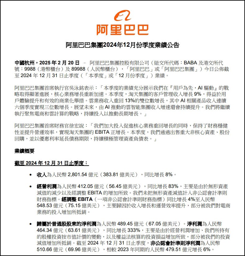 2月20日,阿里巴巴發(fā)布2025財年第三季度(截至2024年12月份季度)業(yè)績,總營收2801.5億元,同比增長8%,市場預(yù)估2773.7億元;調(diào)整后EBITDA(息稅折舊攤銷前利潤)為620.5億元,同比增長4%;歸屬于普通股股東的凈利潤為489.45億元,同比增加239%。 該季度,作為阿里業(yè)務(wù)基本盤的國內(nèi)電商板塊重回利潤增長趨勢。淘天集團收入同比增長5%至1360.91億元,其中客戶管理收入同比增長9%。阿里稱,主要由在線GMV(商品交易總額)增長和Take rate(抽傭)同比提升所帶動。 該季度,淘天集團經(jīng)調(diào)整EBITA(利息、稅項和攤銷前利潤)實現(xiàn)2%的正向增長,達610.83億元。該季度,阿里云智能集團實現(xiàn)收入317.42億元,同比增長13%,相比上一季度7%大幅提升。阿里表示,云業(yè)務(wù)重回兩位數(shù)增速,得益于AI相關(guān)產(chǎn)品推動的公共云收入增長 。據(jù)介紹,AI收入已連續(xù)六個季度實現(xiàn)三位數(shù)增長,阿里云對外商業(yè)化收入同比增長11%。阿里巴巴集團首席執(zhí)行官吳泳銘說:“展望未來,由AI推動的云智能集團收入增速還會持續(xù)提升。我們將繼續(xù)執(zhí)行聚焦電商和云計算的戰(zhàn)略,持續(xù)投入以推動長期增長!眳怯俱懕硎荆⒗飳⒎e極投資AI基礎(chǔ)設(shè)施建設(shè),未來三年在云和AI的基礎(chǔ)設(shè)施投入預(yù)計將超越過去十年的總和。 |