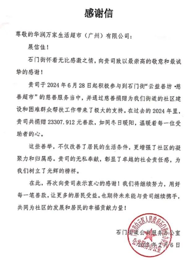 近日,華潤(rùn)萬(wàn)家華南大區(qū)收到廣州市白云區(qū)石門(mén)街道發(fā)來(lái)的感謝信。信中回顧了華南大區(qū)在過(guò)去一年中積極參與慈善超市項(xiàng)目的具體舉措,對(duì)華南大區(qū)在慈善超市項(xiàng)目中所作出的突出貢獻(xiàn)表示衷心的感謝與認(rèn)可。 慈善超市項(xiàng)目于2024年6月正式啟動(dòng),該項(xiàng)目由華南大區(qū)與白云區(qū)慈善會(huì)、石門(mén)街道攜手創(chuàng)辦,項(xiàng)目采用公益+商業(yè)運(yùn)營(yíng)模式,將部分營(yíng)業(yè)額捐贈(zèng)到石門(mén)街道,用于幫助社區(qū)“心青年”。2024年,華南大區(qū)共通過(guò)該項(xiàng)目捐贈(zèng)善款2萬(wàn)多元,為社區(qū)建設(shè)和困難群眾幫扶工作提供了充分支持與幫助。這一善舉也進(jìn)一步彰顯了華南大區(qū)在服務(wù)民生、助力美好生活上的堅(jiān)定決心與不懈努力。 作為民生央企,公司始終牢記初心使命,高度重視社會(huì)責(zé)任工作。2024年8月,華潤(rùn)萬(wàn)家首席財(cái)務(wù)官陽(yáng)紅霞前往慈善超市項(xiàng)目進(jìn)行實(shí)地考察,詳細(xì)了解運(yùn)營(yíng)模式、經(jīng)營(yíng)情況,并為項(xiàng)目運(yùn)營(yíng)提供了工作指導(dǎo)。 此次感謝信不僅是對(duì)華南大區(qū)企業(yè)社會(huì)責(zé)任工作的肯定,更是對(duì)華南大區(qū)未來(lái)繼續(xù)投身公益事業(yè)的鼓勵(lì)。未來(lái),華南大區(qū)將堅(jiān)持聚焦“服務(wù)大國(guó)民生”、“助力美好生活”兩大責(zé)任,將自身的資源優(yōu)勢(shì)與履行社會(huì)責(zé)任結(jié)合起來(lái),持續(xù)拓展履責(zé)邊界、以善行回饋社會(huì)的同時(shí),為華南大區(qū)業(yè)績(jī)?cè)鲩L(zhǎng)注入動(dòng)力。 |