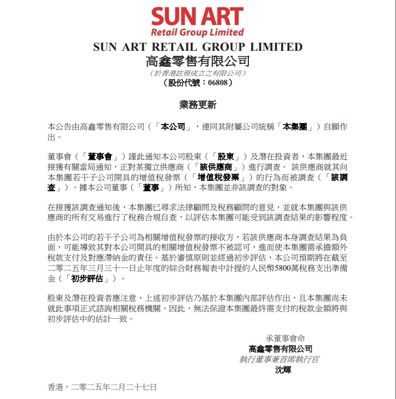 2月27日,高鑫零售有限公司發(fā)布業(yè)務(wù)更新公告。 公告顯示,高鑫零售通知公司股東及潛在投資者,集團(tuán)最近接獲有關(guān)當(dāng)局通知,正對某獨(dú)立供應(yīng)商進(jìn)行調(diào)查。該供應(yīng)商就其向高鑫零售若干子公司開具的增值稅發(fā)票的行為而被調(diào)查。 據(jù)高鑫零售所知,集團(tuán)并非該調(diào)查的對象。在接獲該調(diào)查通知后,已尋求法律顧問及稅務(wù)顧問的意見,并就集團(tuán)與該供應(yīng)商的所有交易進(jìn)行了稅務(wù)合規(guī)自查,以評估可能受到該調(diào)查結(jié)果的影響程度。 由于高鑫零售若干子公司為相關(guān)增值稅發(fā)票的接收方,若該供應(yīng)商本身調(diào)查結(jié)果為負(fù)面,可能導(dǎo)致其對高鑫零售開具的相關(guān)增值稅發(fā)票不被認(rèn)可,進(jìn)而使集團(tuán)需承擔(dān)額外稅款支付及對應(yīng)滯納金的責(zé)任。 基于審慎原則并經(jīng)過初步評估,高鑫零售預(yù)期將在截至2025年3月31日止年度的綜合財(cái)務(wù)報(bào)表中計(jì)提約人民幣5800萬元稅務(wù)支出準(zhǔn)備金。 |