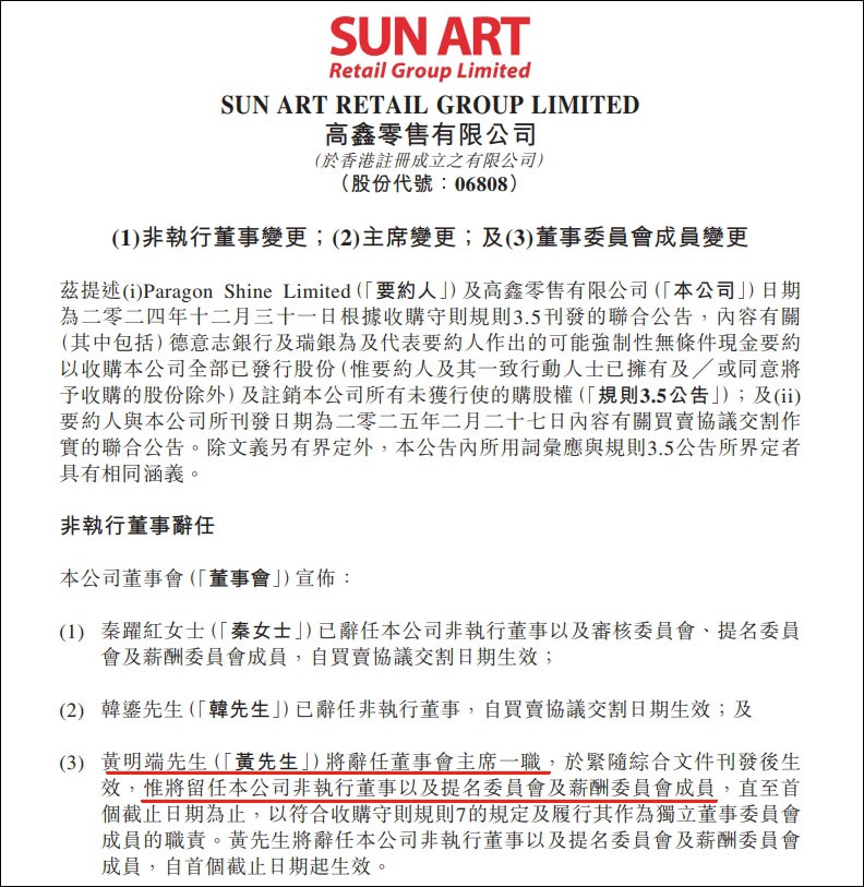 作為曾經(jīng)的中國“超市之王”,大潤發(fā)母公司高鑫零售的動向一直備受行業(yè)人士密切關(guān)注。 近日,其股權(quán)收購案終于塵埃落定,正式完成了交易交割。與此同時,一系列關(guān)鍵的人事變動也隨之而來。 接下來,我們一起來看股權(quán)變更及人事變動的具體情況。 01 大潤發(fā)母公司 高鑫零售正式易主 《職業(yè)零售網(wǎng)》獲悉,2月28日,大潤發(fā)母公司高鑫零售發(fā)布公告稱,公司及要約人Paragon Shine Limited聯(lián)合公布,買賣協(xié)議交割已于2025年2月27日在香港完成。此次交易中,要約人及Lavender Haze Limited作為買方指定實體,向賣方收購合共約75.08億股股份,占公司于本聯(lián)合公告日期的全部已發(fā)行股本約78.70%。 據(jù)了解,此次交易的代價由要約人分兩期支付。首期款項約69.07億港元已于買賣協(xié)議交割日期以現(xiàn)金支付(已扣除賣方應(yīng)付之適用印花稅)。剩余款項約34.535億港元連同每股待售股份最高利息0.20港元,將于適用的買賣協(xié)議第二次付款日期以現(xiàn)金遞延支付。 今年1月1日,阿里巴巴宣布,子公司及New Retail與德弘資本訂立協(xié)議,以最高約131.38億港元(約合123億元人民幣)出售所持大潤發(fā)母公司高鑫零售全部股權(quán),合計占其已發(fā)行股份總數(shù)約78.7%。 隨著買賣協(xié)議交割后,要約人、買方指定實體及彼等任何一致行動人士于合共約75.08億股股份中擁有權(quán)益,占公司于本聯(lián)合公告日期的全部已發(fā)行股本約78.70%。由于買賣協(xié)議交割已完成,要約人須按照根據(jù)收購守則將刊發(fā)的綜合文件所載的條款作出該等要約。 回顧這7年多時間,阿里巴巴投資高鑫零售,虧了近400億港元。2017年11月,阿里斥資224億港元,直接和間接持有高鑫零售36.16%的股份。2020年10月,再次增持大潤發(fā)母公司高鑫零售,約為279.57億港元,相當于每股約8.1港元。這也意味著,阿里前后總投資高達504億港元,與收購價約131.38億港元相比,少了近372.62億港元。 02 黃明端辭職董事會主席 德弘資本CEO華裕能接任 與此同時,大潤發(fā)母公司高鑫零售還發(fā)布了重要人事變動公告,黃明端辭任董事會主席,將由德弘資本CEO華裕能接任。 高鑫零售董事會宣布,秦躍紅已辭任非執(zhí)行董事以及審核委員會、提名委員會及薪酬委員會成員,韓鎏已辭任非執(zhí)行董事,均自買賣協(xié)議交割日期生效; 黃明端將辭任董事會主席一職,但在綜合文件刊發(fā)后仍留任非執(zhí)行董事以及提名委員會及薪酬委員會成員,直至首個截止日期為止。此外,黃明端還將辭任非執(zhí)行董事以及提名委員會及薪酬委員會成員。 同時,董事會進一步宣布,華裕能將獲委任為本公司董事會主席、非執(zhí)行董事及薪酬委員會成員;王冠男女士將獲委任為本公司非執(zhí)行董事及提名委員會成員,梅夢雪女士將獲委任為公司非執(zhí)行董事及審核委員會成員。 資料顯示,華裕能,現(xiàn)年51歲,擔任DCP Capital(德弘資本)聯(lián)合創(chuàng)始人兼首席執(zhí)行官。華裕能亦為納斯達克上市公司牛電科技(股份代號:NIU)的獨立董事。于成立DCP Capital之前,華裕能在KKR Asia Limited擔任合伙人,主管大中華地區(qū)業(yè)務(wù)。在加入KKR Asia Limited之前,華裕能曾就職于摩根士丹利的私募股權(quán)投資部門,負責中國投資業(yè)務(wù)。在此之前,彼曾任職于Lazard Freres & Co.的兼并及收購部以及Coopers &Lybrand的金融咨詢公司。 王冠男女士,36歲,擔任DCP Capital的執(zhí)行董事,負責消費零售投資。王女士亦為新加坡交易所上市公司中圣集團有限公司(股份代號:5GD.SI)的非執(zhí)行董事。于加入DCP Capital之前,王女士擔任MBK Partners的高級投資經(jīng)理,及此前擔任弘毅投資的分析師。王女士畢業(yè)于麻省理工學院斯隆商學院,獲得金融碩士學位,及畢業(yè)于北京大學,獲得工程學士學位以及經(jīng)濟學學士雙學位。 梅夢雪女士,31歲,擔任DCP Capital副總裁,專注于消費零售投資。于加入DCP Capital之前,梅女士擔任美銀美林投資銀行部的分析師。梅女士畢業(yè)于哥倫比亞大學,獲得國際事務(wù)碩士學位,及畢業(yè)于北京大學,獲得金融學學士及國際關(guān)系學士雙學位。 最后, 隨著市場競爭加劇和消費購物習慣的不斷變化,高鑫零售近年來的業(yè)績呈現(xiàn)出下滑趨勢。在2022財年(財年時間與自然年存在差異),高鑫零售中期業(yè)績?yōu)?06.11億元,到2025年財年中期降至347.08億元,下滑幅度約14.5%。更為嚴峻的是,在2023和2024財年中期業(yè)績中,高鑫零售陷入凈利潤虧損的困境,2024財年的虧損額更是超過16億元。 面對這一困境,2024年3月,高鑫零售進行了管理層調(diào)整,林小海辭任CEO一職,由高鑫零售的元老級人物沈輝接任。同時,阿里派駐的高管林小海則空降上海家化,擔任上海家化的CEO。 根據(jù)高鑫零售最新財報顯示,截至2024年9月30日的半年內(nèi),公司實現(xiàn)營收347.08億元,較上年同期的357.58億元下降了3%。然而,期內(nèi)利潤卻達到了1.86億元,實現(xiàn)了扭虧為盈,而上年同期的期內(nèi)虧損為3.78億元。 財報還透露,高鑫零售將積極推動多業(yè)態(tài)全渠道發(fā)展,作為第二增長曲線的中超業(yè)態(tài)大潤發(fā)Super和M會員店在新財年均會加速開店。其中,2025新財年,公司已物色了13個點位開設(shè)大潤發(fā)Super,同時啟動了4家M會員商店