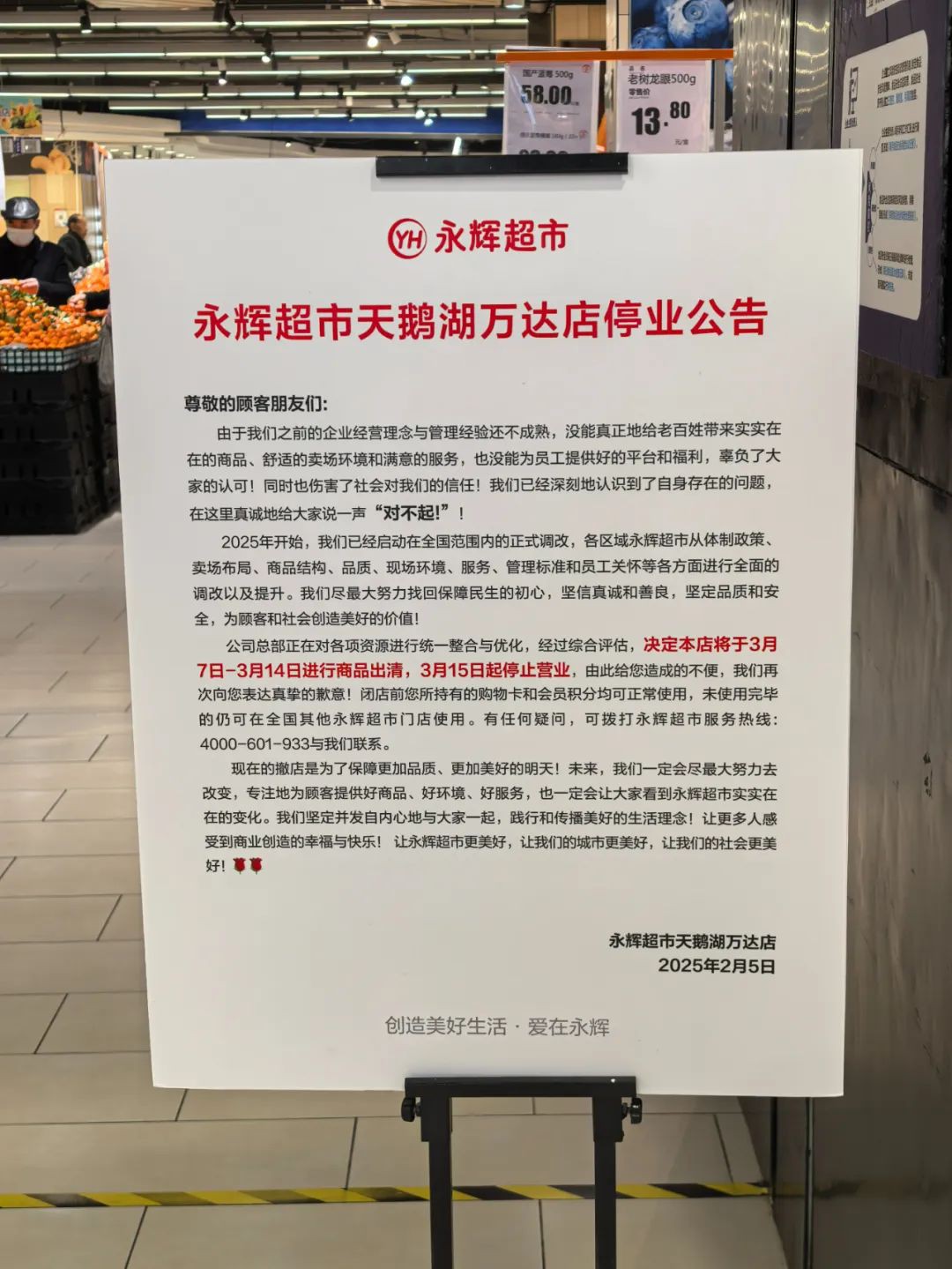 近日,合肥天鵝湖萬達廣場內(nèi)的永輝超市門店發(fā)布了一則停業(yè)公告,宣布該門店將于2025年3月15日正式停止營業(yè)。這家自2017年1月1日開業(yè)以來,已經(jīng)營了8年的超市門店,即將落下帷幕。 公告顯示,在正式停業(yè)前,即3月7日至3月14日期間,該門店將進行為期一周的商品出清活動。顧客可在此期間前來選購心儀的商品,并享受相應的優(yōu)惠。同時,門店也提醒顧客,閉店前所持有的購物卡和會員積分均可正常使用,未使用完畢的部分仍可在全國其他永輝超市門店繼續(xù)使用,確保顧客的權益得到充分保障。 永輝超市方面表示,此次停業(yè)是公司對各項資源進行統(tǒng)一整合與優(yōu)化的結果。經(jīng)過綜合評估,公司決定對部分門店進行調(diào)整,以提升整體經(jīng)營效率和競爭力。雖然合肥天鵝湖萬達廣場門店即將停業(yè),但永輝超市將繼續(xù)在其他門店為顧客提供優(yōu)質(zhì)的商品和服務。 |
