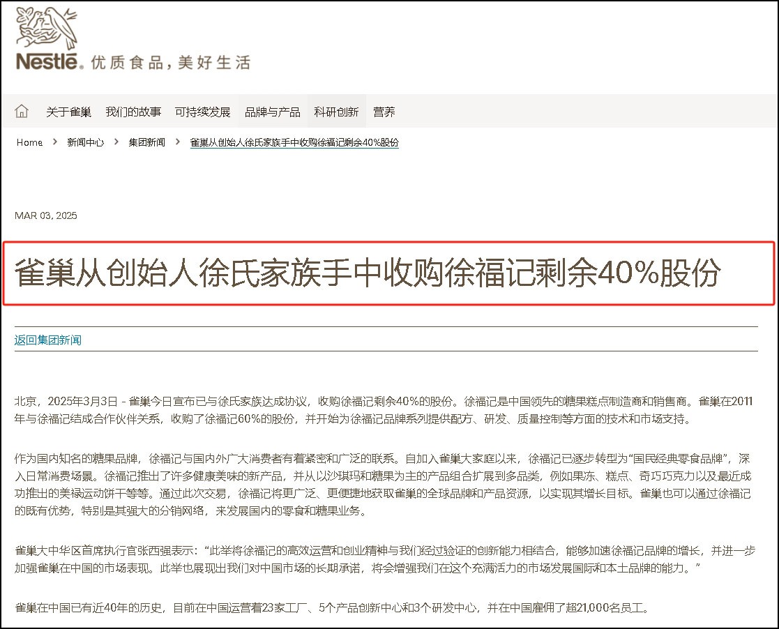 14年前,雀巢以戰(zhàn)略眼光控股徐福記60%,拉開合作帷幕;時光推移,如今成功收購余下股份,徐福記正式步入雀巢全資控股新時代。 3月3日,雀巢集團在官網(wǎng)發(fā)布消息,宣布已與徐氏家族達成協(xié)議,收購徐福記剩余40%的股份,但未透露具體交易金額。此次交易完成后,雀巢將實現(xiàn)對徐福記全資持股。 圖來源:雀巢官網(wǎng)。 官網(wǎng)顯示,徐福記是中國領先的糖果糕點制造商和銷售商,1992年由來自中國臺灣的徐氏四兄弟創(chuàng)立,主要生產(chǎn)基地位于廣東東莞。 2011年,雀巢與徐福記結成合作伙伴關系,以17億美元的價格收購了徐福記60%的股份,成為其控股股東,并開始為徐福記品牌系列提供配方、研發(fā)、質量控制等方面的技術和市場支持。 雀巢中國在官網(wǎng)上介紹,自加入雀巢大家庭以來,徐福記已逐步轉型為“國民經(jīng)典零食品牌”,深入日常消費場景。徐福記推出了許多健康美味的新產(chǎn)品,并從以沙琪瑪和糖果為主的產(chǎn)品組合擴展到多品類,例如果凍、糕點、奇巧巧克力以及最近成功推出的美祿運動餅干等等。 雀巢方面表示,通過此次交易,徐福記將更廣泛、更便捷地獲取雀巢的全球品牌和產(chǎn)品資源,以實現(xiàn)其增長目標。雀巢也可以通過徐福記的既有優(yōu)勢,特別是其強大的分銷網(wǎng)絡,來發(fā)展國內的零食和糖果業(yè)務。 據(jù)悉,目前在雀巢中國的業(yè)務版圖中,徐福記和糖果業(yè)務是兩個獨立的業(yè)務單元,市場上有種猜測認為,未來徐福記和糖果業(yè)務或融合為一個業(yè)務單元,但該說法未獲得雀巢中國的確認。雀巢中國稱,“我們將尋找方法為兩個業(yè)務都帶來最佳增長”。 今年2月,雀巢發(fā)布2024年業(yè)績顯示,該集團銷售額為914億瑞士法郎(折合人民幣約7467億元),有機增長率達到2.2%;在大中華大區(qū),雀巢銷售額為50億瑞士法郎(約合人民幣403億元),同比有機增長率為2.1%。 不僅從集團整體業(yè)績層面來看,咖啡、糖果和寵物護理業(yè)務對集團增長貢獻顯著,而且聚焦到大中華大區(qū),嬰兒營養(yǎng)和糖果業(yè)務同樣表現(xiàn)出色。另據(jù)雀巢中國官網(wǎng)披露,在大中華大區(qū),2024年雀巢嬰兒營養(yǎng)和糖果業(yè)務取得了市場份額的增長,在徐福記和脆脆鯊的穩(wěn)健增長以及新品上市和電商增長的推動下,糖果業(yè)務實現(xiàn)了中個位數(shù)的增長 。 除了整體業(yè)績數(shù)據(jù)亮眼,市場研究數(shù)據(jù)也從側面展現(xiàn)了徐福記的強勁實力。尼爾森零售研究數(shù)據(jù)顯示,在2024年的大賣場超市渠道,徐福記散裝糖、散裝巧克力、散裝糕點三大品類位居市場第一,散裝果凍位居第二,其中散裝糖、散裝巧克力的市場占有率均超過30%。這些數(shù)據(jù)充分展現(xiàn)了徐福記在糖果糕點領域強大的市場競爭力,也為雀巢在華糖果業(yè)務的發(fā)展提供了有力支撐。 財報顯示,盡管大中華大區(qū)消費需求疲軟,且在多個品類均面臨激烈的價格競爭,大中華大區(qū)每個季度的實際內部增長率均為正值,這得益于在關鍵品類中推動更快的創(chuàng)新,并調整深度分銷和渠道策略,以捕捉新的增長機會。 2024年3月,徐福記總裁劉興罡曾在2024年新品戰(zhàn)略發(fā)布會上表示,徐福記已經(jīng)連續(xù)4年實現(xiàn)高位增長,整體營收規(guī)模已超過70億元。他還稱,期望徐福記銷售規(guī)模在2027年能達到百億元。 雀巢大中華區(qū)首席執(zhí)行官張西強于今年2月公開表示,2024年雀巢中國在渠道建設上投入大量精力,這成為推動業(yè)績增長的關鍵因素之一。其中,徐福記發(fā)揮了重要作用,其 2024 年產(chǎn)品分銷覆蓋達200萬個網(wǎng)點,且2025年目標提升至260萬個。不僅如此,徐福記產(chǎn)品 “出! 表現(xiàn)出色。 張西強還指出,此次雀巢全資收購徐福記意義重大,將徐福記的高效運營與創(chuàng)業(yè)精神,和雀巢經(jīng)過驗證的創(chuàng)新能力深度融合,不僅能夠加速徐福記品牌的增長,進一步強化雀巢在中國市場的表現(xiàn),更展現(xiàn)出雀巢對中國市場的長期承諾,有助于增強在這個充滿活力的市場發(fā)展國際和本土品牌的能力。 徐福記官網(wǎng)介紹,徐福記在全國擁有8大分部、58個大區(qū)、超過3500家經(jīng)銷商,服務超過200萬家終端門店,從都市到鄉(xiāng)村,強大銷售網(wǎng)絡覆蓋全國,并遠銷海外。如此強大的銷售網(wǎng)絡,不僅為徐福記自身發(fā)展奠定了堅實基礎,也為雀巢進一步拓展中國市場提供了有力支持。 雀巢在中國已深耕近40年,目前運營著23家工廠、5個產(chǎn)品創(chuàng)新中心和3個研發(fā)中心,并在中國雇傭了超2.1萬名員工。目前,中國是這家瑞士食品巨頭的全球第二大市場,每年貢獻超過400億元收入。雀巢主要經(jīng)營著雀巢咖啡、奈斯派索、惠氏、嘉寶、能恩、太太樂、徐福記、巴黎水、美祿、普瑞納、雀巢健康科學、雀巢專業(yè)餐飲等眾多品牌和業(yè)務單元。 談及雀巢在中國市場的投資布局,張西強近期在接受記者群訪時表示,“雀巢在中國的投資不會停歇,未來將持續(xù)加大在寵物食品、咖啡和嬰兒奶粉這三大領域的投資力度,消費者需求的產(chǎn)品、契合流行消費趨勢的產(chǎn)品,就是我們投資的方向! 自2020年以來,集團公司對中國市場新增投資已超20億元。 |