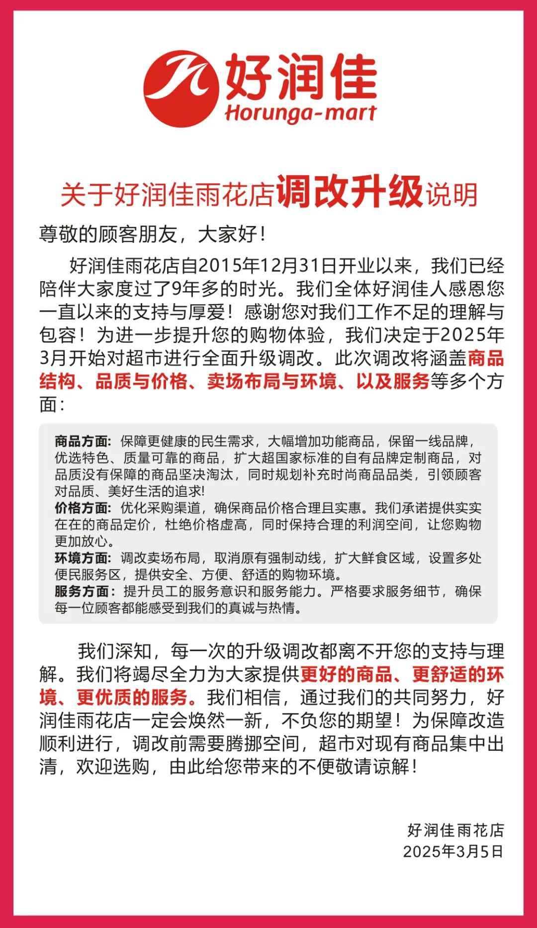 《職業(yè)零售網(wǎng)》獲悉,3月5日,湖南豐彩投資有限公司旗下好潤(rùn)佳雨花店宣布,將于2025年3月7日啟動(dòng)全面升級(jí)調(diào)改計(jì)劃,旨在為消費(fèi)者提供更優(yōu)質(zhì)、更舒適的購(gòu)物體驗(yàn)。這也是繼橋南店和財(cái)富店之后,好潤(rùn)佳再次啟動(dòng)的調(diào)改計(jì)劃。 在商品結(jié)構(gòu)方面,門(mén)店將大幅增加功能商品,保留一線品牌,并引入更多特色、質(zhì)量可靠的商品。同時(shí),還將擴(kuò)大自有品牌定制商品的范圍,淘汰品質(zhì)無(wú)保障的商品,確保消費(fèi)者能夠購(gòu)買(mǎi)到更高品質(zhì)的商品。 在價(jià)格方面,好潤(rùn)佳將優(yōu)化采購(gòu)渠道,確保商品價(jià)格合理且實(shí)惠。好潤(rùn)佳承諾提供實(shí)實(shí)在在的商品定價(jià),杜絕價(jià)格虛高,同時(shí)保持合理的利潤(rùn)空間,讓消費(fèi)者購(gòu)物更加放心。 在購(gòu)物環(huán)境方面,門(mén)店將調(diào)改賣(mài)場(chǎng)布局,取消原有強(qiáng)制動(dòng)線,擴(kuò)大鮮食區(qū)域,并設(shè)置多處便民服務(wù)區(qū)。通道寬度將從原有的1米擴(kuò)展至3-4米,使購(gòu)物空間更加寬敞、舒適。 在服務(wù)質(zhì)量方面,門(mén)店將提升員工的服務(wù)意識(shí)和服務(wù)能力,嚴(yán)格要求服務(wù)細(xì)節(jié)。新增40項(xiàng)服務(wù)內(nèi)容,包括水果區(qū)免費(fèi)去皮切塊裝盒、冷凍品提供冰袋、免費(fèi)禮品打包、滿(mǎn)額免費(fèi)停車(chē)以及免費(fèi)上門(mén)水電維修等,致力于打造便民的、像家一樣的購(gòu)物環(huán)境。 官網(wǎng)資料顯示,好潤(rùn)佳隸屬于湖南豐彩實(shí)業(yè)發(fā)展有限公司旗下品牌,成立于1998年,總部位于長(zhǎng)沙。目前,好潤(rùn)佳擁有超過(guò)21家大型連鎖超市,這些門(mén)店遍布長(zhǎng)沙、常德、益陽(yáng)、岳陽(yáng)、張家界、吉首六個(gè)地州市。此外,公司還配備兩個(gè)專(zhuān)業(yè)的物流配送中心,并下轄一家四星級(jí)商務(wù)酒店和一家房地產(chǎn)開(kāi)發(fā)公司。 此前,好潤(rùn)佳橋南店和財(cái)富店經(jīng)過(guò)精心調(diào)改升級(jí)后,已以全新面貌迎接顧客。調(diào)整內(nèi)容包括優(yōu)化購(gòu)物環(huán)境、更新商品體系、提升服務(wù)質(zhì)量等,獲得了消費(fèi)者的廣泛好評(píng)。 好潤(rùn)佳雨花店此次調(diào)改升級(jí),將借鑒橋南店的成功經(jīng)驗(yàn),全方位優(yōu)化購(gòu)物體驗(yàn)。好潤(rùn)佳方面表示,此次升級(jí)不僅是對(duì)門(mén)店硬件設(shè)施的改造,更是對(duì)服務(wù)理念和服務(wù)質(zhì)量的全面提升。希望通過(guò)調(diào)改,能為消費(fèi)者帶來(lái)更優(yōu)質(zhì)、更便捷的購(gòu)物體驗(yàn)。 對(duì)于好潤(rùn)佳雨花店后續(xù)調(diào)改的進(jìn)展,《職業(yè)零售網(wǎng)》將持續(xù)關(guān)注。 |