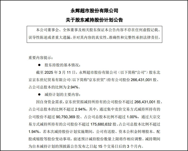 3月11日,永輝超市公告,因自身資金需求,其股東京東世貿(mào)擬減持所持有的永輝超市股份不超過2.66億股、占永輝超市總股本的比例不超過2.94%。 根據(jù)公告,京東世貿(mào)擬通過集中競價交易方式減持不超過9075萬股,通過大宗交易方式減持不超過1.76億股。減持期間為本減持計劃預(yù)披露公告發(fā)布之日起15個交易日后的3個月內(nèi)。 截至2025年3月11日,京東世貿(mào)持有永輝超市股份2.66億股,占總股本的比例為2.94%。如果按計劃完成,京東世貿(mào)將徹底退出永輝超市的股東行列。 回顧永輝與京東合作,2015年8月,京東以每股9元人民幣的價格,總計43.1億元人民幣(約合7億美元)入股永輝超市,獲得其10%的股份。雙方計劃在采購、倉儲物流、金融等領(lǐng)域展開深度合作。 然而,隨著時間推移,雙方的合作逐漸面臨挑戰(zhàn)。盡管在O2O業(yè)務(wù)上取得了一定成效,但在供應(yīng)鏈整合和數(shù)據(jù)共享等方面進展有限。此外,京東自身在生鮮領(lǐng)域的布局逐漸完善,減少了對永輝超市的依賴。 2024年9月,京東世貿(mào)曾與牛奶有限公司、宿遷涵邦投資管理有限公司拋售該永輝超市29.40%股權(quán),廣東駿才國際商貿(mào)有限公司(名創(chuàng)優(yōu)品對其100%控股)以62.7億元進行收購。轉(zhuǎn)讓完成后,永輝超市第一大股東變更為駿才國際,名創(chuàng)優(yōu)品正式入主永輝超市。 永輝超市近年來一直在努力轉(zhuǎn)型,學(xué)習(xí)胖東來的調(diào)改經(jīng)驗,優(yōu)化門店布局,提升運營效率。雖然短期內(nèi)業(yè)績面臨挑戰(zhàn),但調(diào)改后的門店客流量和銷售額都有顯著提升,未來值得期待! |