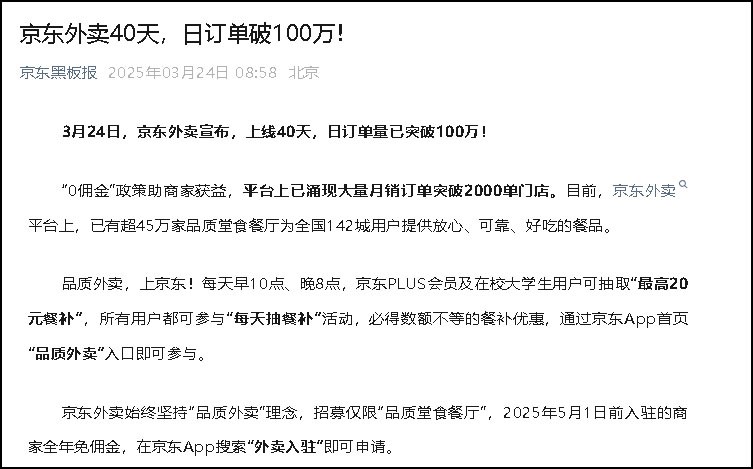 據(jù)京東黑板報消息,3月24日,京東外賣宣布,上線40天,日訂單量已突破100萬。 京東外賣平臺上已涌現(xiàn)大量月銷訂單突破2000單門店。目前,已有超45萬家品質(zhì)堂食餐廳為全國142城用戶提供放心、可靠、好吃的餐品。 2月11日,京東宣布京東外賣上線,并啟動“品質(zhì)堂食餐飲商家”招募,2025年5月1日前入駐的商家,全年免傭金。 |