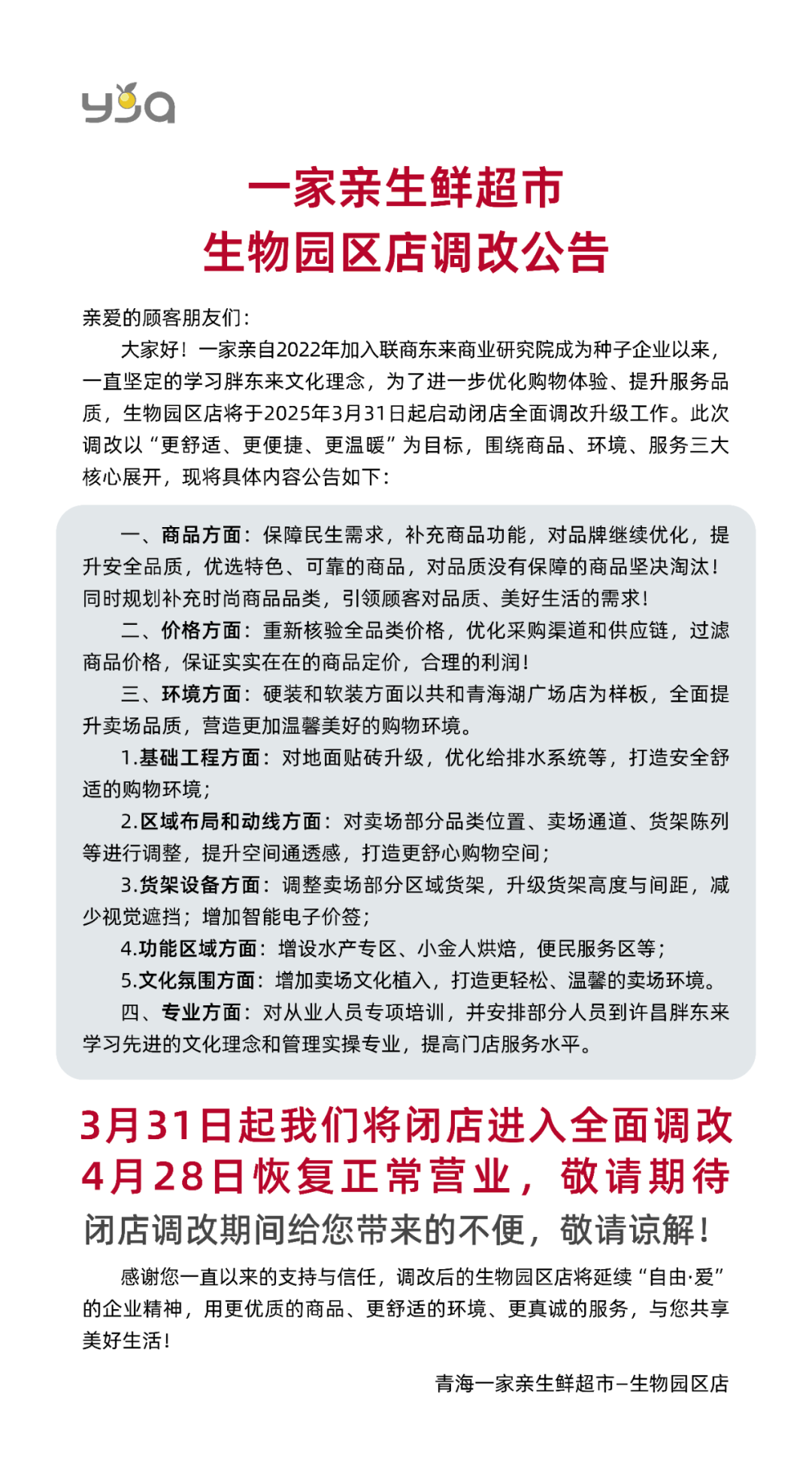 《職業(yè)零售網(wǎng)》獲悉,3月27日,青海一家親生鮮超市生物園區(qū)店發(fā)布《閉店調(diào)改公告》稱,將于3月31日起啟動(dòng)閉店閉店調(diào)改,預(yù)計(jì)4月28日恢復(fù)正常營(yíng)業(yè)。此次調(diào)改旨在進(jìn)一步優(yōu)化購(gòu)物體驗(yàn)、提升服務(wù)品質(zhì),以“更舒適、更便捷、更溫暖”為目標(biāo),圍繞商品、價(jià)格、環(huán)境、專業(yè)四大核心展開(kāi)。 商品升級(jí):保障民生需求,優(yōu)化品牌選擇,提升商品安全品質(zhì),淘汰無(wú)保障商品,補(bǔ)充時(shí)尚品類,滿足顧客對(duì)品質(zhì)生活的追求。 價(jià)格優(yōu)化:重新核驗(yàn)全品類價(jià)格,優(yōu)化采購(gòu)渠道和供應(yīng)鏈,確保商品定價(jià)實(shí)在合理。 環(huán)境提升:以共和青海湖廣場(chǎng)店為樣板,全面提升賣(mài)場(chǎng)品質(zhì),包括地面貼磚升級(jí)、優(yōu)化給排水系統(tǒng)、調(diào)整區(qū)域布局、升級(jí)貨架設(shè)備、增設(shè)功能區(qū)域、增強(qiáng)文化氛圍等,營(yíng)造溫馨美好的購(gòu)物環(huán)境。 專業(yè)服務(wù):對(duì)從業(yè)人員進(jìn)行專項(xiàng)培訓(xùn),并安排部分人員到許昌胖東來(lái)學(xué)習(xí)先進(jìn)理念和管理經(jīng)驗(yàn),提升服務(wù)水平。 一家親生鮮超市表示,調(diào)改后的生物園區(qū)店將延續(xù)“自由·愛(ài)”的企業(yè)精神,為顧客提供更優(yōu)質(zhì)的商品、更舒適的環(huán)境和更真誠(chéng)的服務(wù)。 |