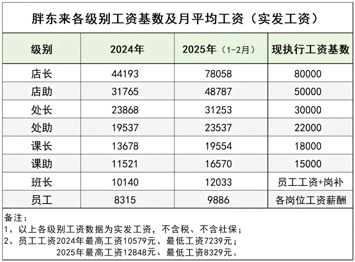 最近兩天,被胖東來(lái)公布的員工各級(jí)別工資表刷屏了。 據(jù)大象新聞報(bào)道,3月28日,胖東來(lái)創(chuàng)始人于東來(lái)在“2025中國(guó)超市周”演講,他展示的胖東來(lái)最新各級(jí)別員工工資表顯示,胖東來(lái)有店長(zhǎng)、店助、員工等八個(gè)級(jí)別。2025年1至2月份,在交完社保以后,胖東來(lái)員工工資是9886元,店長(zhǎng)平均月薪78058元,高管層工資普遍上調(diào)。 此外,于東來(lái)還透露,2025年胖東來(lái)管理層的工資跟2024年相比也有很大的變化!拔覀円_(kāi)夢(mèng)之城,要投資大概50億,甚至再加上物流(要到)70億,所以我們這幾年就不分錢了,那我們還得讓我們的管理層過(guò)得好,怎么辦,就給管理層漲工資。” 于東來(lái)還表示,今年3個(gè)月賣了62個(gè)億,今年銷售額盡量控制在200億以內(nèi),就是10億的凈利潤(rùn)!盎ú煌暝趺崔k?讓那些資本去建更好的店,來(lái)造福社會(huì)! 1月8日,于東來(lái)曾透露,2024年胖東來(lái)集團(tuán)整體銷售近170億元,稅收6億多元、利潤(rùn)8億多元,其中提到員工平均月收入9000多元。 去年12月13日,于東來(lái)在社交平臺(tái)發(fā)文稱,胖東來(lái)未來(lái)幾年要追求實(shí)現(xiàn)的目標(biāo)是每周工作時(shí)間36小時(shí)以內(nèi),星期六閉店休息,實(shí)現(xiàn)讓員工與家人一起享受周末的美好時(shí)光;每年40至60天的休假,員工最低月到手純收入保持在8000元以上。 值得注意的是,近日,胖東來(lái)官網(wǎng)公開(kāi)了集團(tuán)在許昌、新鄉(xiāng)兩地不同業(yè)態(tài)的人員流失率情況、文明價(jià)值獎(jiǎng)勵(lì)情況等數(shù)據(jù)。 統(tǒng)計(jì)數(shù)據(jù)顯示,2025年2月胖東來(lái)在許昌和新鄉(xiāng)兩地共流失員工10人,其中許昌流失8人,新鄉(xiāng)流失2人,集團(tuán)合計(jì)離職率為0.12%;管理人員未有流失。今年1-2月,許昌和新鄉(xiāng)兩地共流失28人,其中包括管理人員2人,人員流失率為0.33%。 2024年,胖東來(lái)集團(tuán)合計(jì)流失171人,其中包括3名管理人員及168名員工,人員流失率僅為2.01%。其中,許昌地區(qū)超市業(yè)務(wù)部門流失人員數(shù)量最多,共計(jì)99人,人員流失率為2.78%;許昌地區(qū)醫(yī)藥業(yè)務(wù)部門人員流失率最高,為6.58%,共流失10名員工。 |