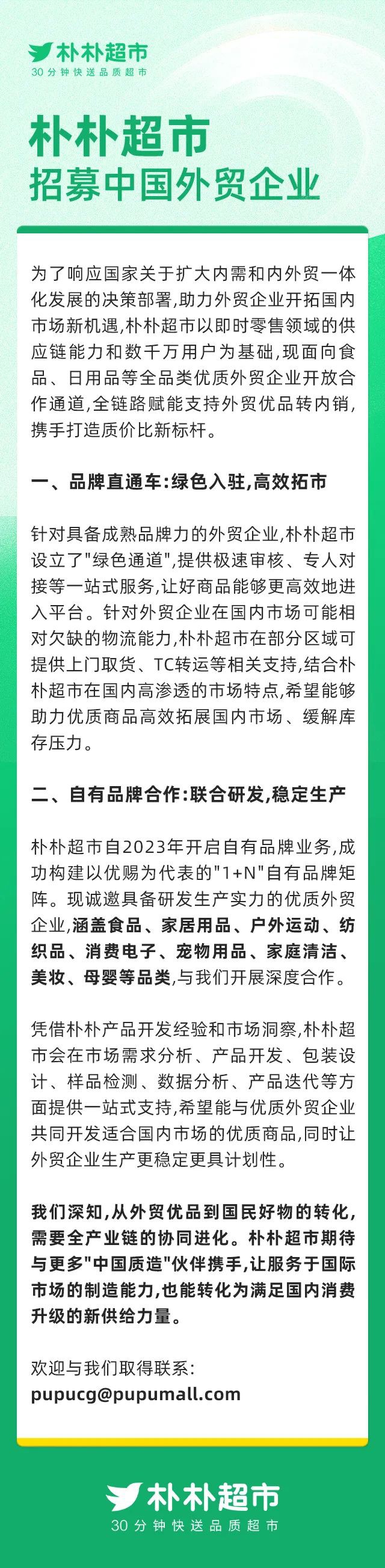 4月13日,樸樸超市發(fā)文招募中國外貿企業(yè)。 為了助力外貿企業(yè)開拓國內市場新機遇,樸樸超市以即時零售領域的供應鏈能力和數千萬用戶為基礎,現面向食品、日用品等全品類優(yōu)質外貿企業(yè)開放合作通道,全鏈路賦能支持外貿優(yōu)品轉內銷,攜手打造質價比新標桿。 一、品牌直通車:設立“綠色通道”,提供極速審核、專人對接等一站式服務,助力成熟品牌高效入駐。在部分區(qū)域提供上門取貨、TC轉運支持,結合樸樸超市高滲透的市場特點,助力優(yōu)質商品拓展國內市場,緩解庫存壓力。 二、自有品牌合作:樸樸超市自2023年開啟自有品牌業(yè)務,構建了以“優(yōu)賜”為代表的“1+N”自有品牌矩陣。誠邀具備研發(fā)生產實力的外貿企業(yè)(涵蓋食品、家居用品、戶外運動、紡織品、消費電子、寵物用品、家庭清潔、美妝、母嬰等品類)開展深度合作。樸樸超市將提供市場需求分析、產品開發(fā)、包裝設計、樣品檢測、數據分析、產品迭代等一站式支持,共同開發(fā)適合國內市場的優(yōu)質商品,助力外貿企業(yè)穩(wěn)定生產。 |