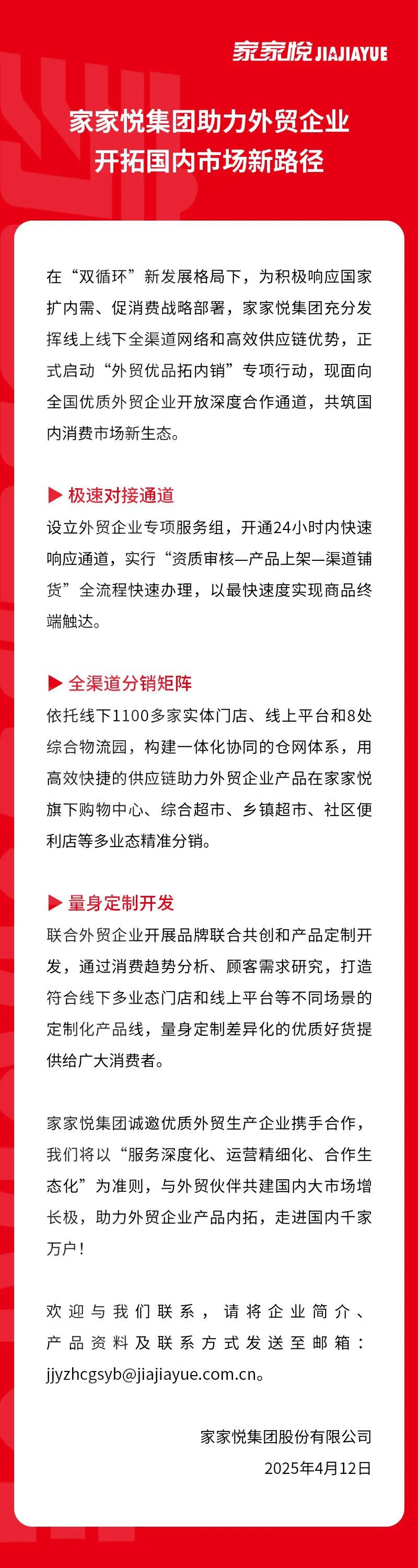 4月12日,家家悅集團(tuán)宣布正式啟動“外貿(mào)優(yōu)品拓內(nèi)銷”專項行動,現(xiàn)面向全國優(yōu)質(zhì)外貿(mào)企業(yè)開放深度合作通道,共筑國內(nèi)消費(fèi)市場新生態(tài)。 1、極速對接通道:設(shè)立外貿(mào)企業(yè)專項服務(wù)組,開通24小時內(nèi)快速響應(yīng)通道,實行“資質(zhì)審核-產(chǎn)品上架一渠道鋪貨”全流程快速辦理,以最快速度實現(xiàn)商品終端觸達(dá)。 2、全渠道分銷矩陣:依托線下1100多家實體門店、線上平臺和8處綜合物流園,構(gòu)建一體化協(xié)同的倉網(wǎng)體系,用高效快捷的供應(yīng)鏈助力外貿(mào)企業(yè)產(chǎn)品在家家悅旗下購物中心、綜合超市、鄉(xiāng)鎮(zhèn)超市、社區(qū)便利店等多業(yè)態(tài)精準(zhǔn)分銷。 3、量身定制開發(fā):聯(lián)合外貿(mào)企業(yè)開展品牌聯(lián)合共創(chuàng)和產(chǎn)品定制開發(fā),通過消費(fèi)趨勢分析、顧客需求研究,打造符合線下多業(yè)態(tài)門店和線上平臺等不同場景的定制化產(chǎn)品線,量身定制差異化的優(yōu)質(zhì)好貨提供給廣大消費(fèi)者。 |