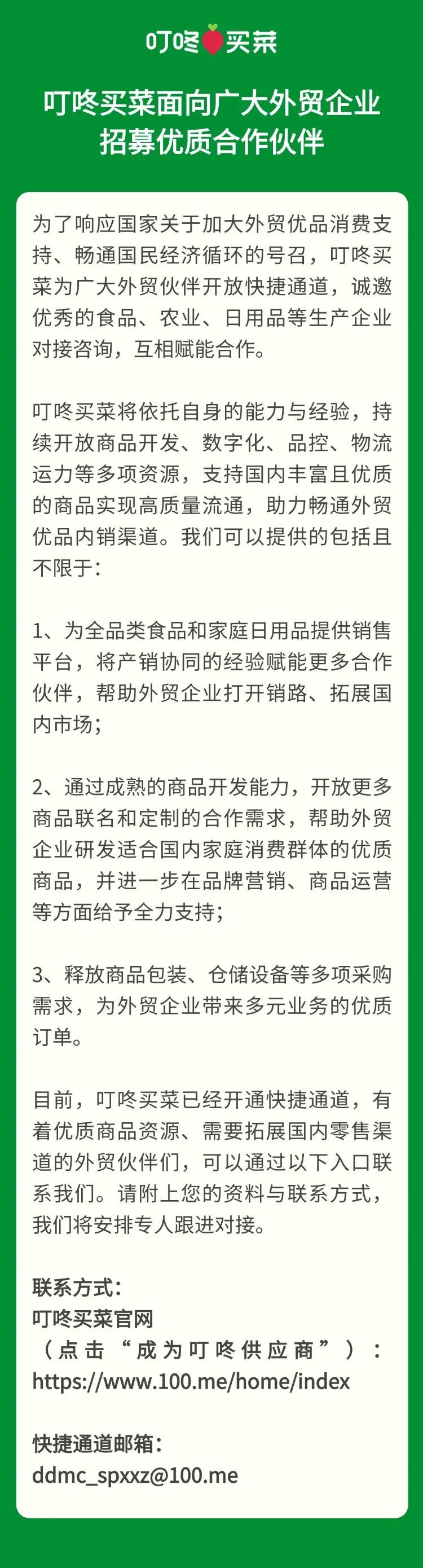 4月11日,叮咚買菜為廣大外貿(mào)伙伴開放快捷通道,誠邀優(yōu)秀的食品、農(nóng)業(yè)、日用品等生產(chǎn)企業(yè)對接咨詢,互相賦能合作。 叮咚買菜稱,將依托自身的能力與經(jīng)驗,持續(xù)開放商品開發(fā)、數(shù)字化、品控、物流運力等多項資源,支持國內(nèi)豐富且優(yōu)質(zhì)的商品實現(xiàn)高質(zhì)量流通,助力暢通外貿(mào)優(yōu)品內(nèi)銷渠道。目前,叮咚買菜已經(jīng)開通快捷通道,有著優(yōu)質(zhì)商品資源、需要拓展國內(nèi)零售渠道的外貿(mào)伙伴可與其聯(lián)系。 聯(lián)系方式: 叮咚買菜官網(wǎng):點擊“成為叮咚供應(yīng)商”https://www.100.me/home/index 快捷通道郵箱:ddmc_spxxz@100.me |