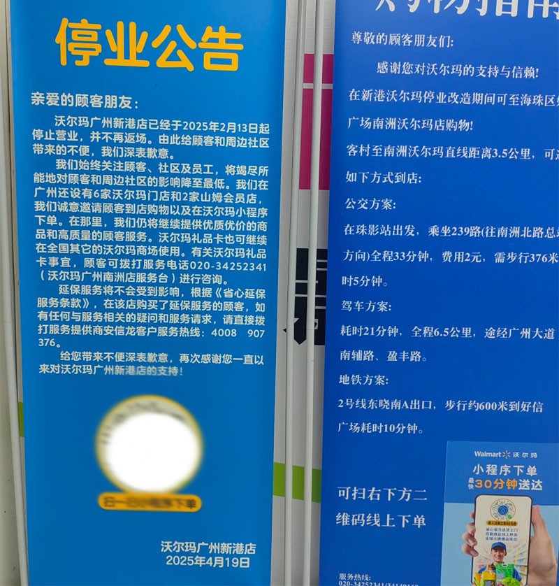 4月19日,沃爾瑪廣州新港店再次發(fā)布停業(yè)公告,確認(rèn)該店已于2月13日正式停止?fàn)I業(yè),并且不再重新開業(yè)。 此前,2月份的停業(yè)公告曾提到,短暫停業(yè)是由于商圈整體改造。當(dāng)時(shí),工作人員表示,改造完成后,是否繼續(xù)合作以及合作方式將與商場產(chǎn)權(quán)人進(jìn)行磋商。改造期間,門店將關(guān)閉進(jìn)行裝修,預(yù)計(jì)10月份左右重新營業(yè)。然而,最新的公告表明,該店將不再返場。 |