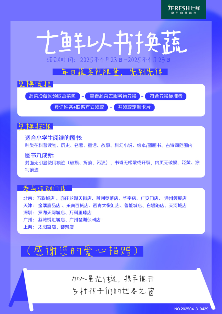 今年4月23日是第三十個世界讀書日,京東七鮮攜手京東公益品牌項目“星光傳遞計劃”,在全國多地門店開展“以書換蔬”活動,旨在通過閑置書籍兌換蔬菜包的形式,用舊書點亮星光,溫暖童心,助力改善鄉(xiāng)村兒童閱讀條件,更好地滿足孩子們的閱讀需要,實現(xiàn)知識與健康的“雙向奔赴”。 活動期間,消費者只需攜帶3本適合小學(xué)生閱讀的閑置書籍至京東七鮮線下指定門店,即可兌換一份內(nèi)含三種蔬菜的“蔬菜包”,可兌換的圖書類別可以是科普讀物、歷史、名著、童話、故事、繪本、科幻小說以及古詩詞等,同時書籍封面、書脊以及內(nèi)頁等保持完好。 為保障活動有序開展,京東七鮮在北京、天津、上海、廣州、深圳多地門店設(shè)立“以書換蔬”主題展臺,配備專業(yè)書籍捐贈處和有機(jī)蔬菜包樣品展示區(qū)。值得一提的是,消費者送出的所有書籍將均由京東公益“星光傳遞計劃”定向捐贈給合作福利院、鄉(xiāng)村學(xué)校圖書館,有效解決鄉(xiāng)村兒童閱讀資源匱乏的問題;顒咏Y(jié)束后,京東七鮮還會發(fā)布此次活動最終的捐書數(shù)量、門店現(xiàn)場照片及受益機(jī)構(gòu)名單,讓每一份愛心都落到實處。 京東七鮮的這一舉措不僅讓閑置書籍煥發(fā)新生,更讓城市居民在享受健康食材的同時,為鄉(xiāng)村兒童的教育貢獻(xiàn)一份愛和力量。 一直以來,京東七鮮在公益領(lǐng)域的探索從未止步,此次聯(lián)手“星光傳遞計劃”便是雙方在公益領(lǐng)域的一次創(chuàng)新探索,通過“以物易物”的形式,實現(xiàn)公益資源的有效整合。未來,京東七鮮將繼續(xù)在公益領(lǐng)域深耕細(xì)作,不斷探索創(chuàng)新公益模式,承擔(dān)起企業(yè)應(yīng)有的社會責(zé)任,持續(xù)為消費者帶來更多又好又便捷的公益活動選擇。從4月23日起,消費者即可前往全國七鮮指定門店,參與本次“以書換蔬”活動,用閑置舊書換取愛心鮮蔬! |