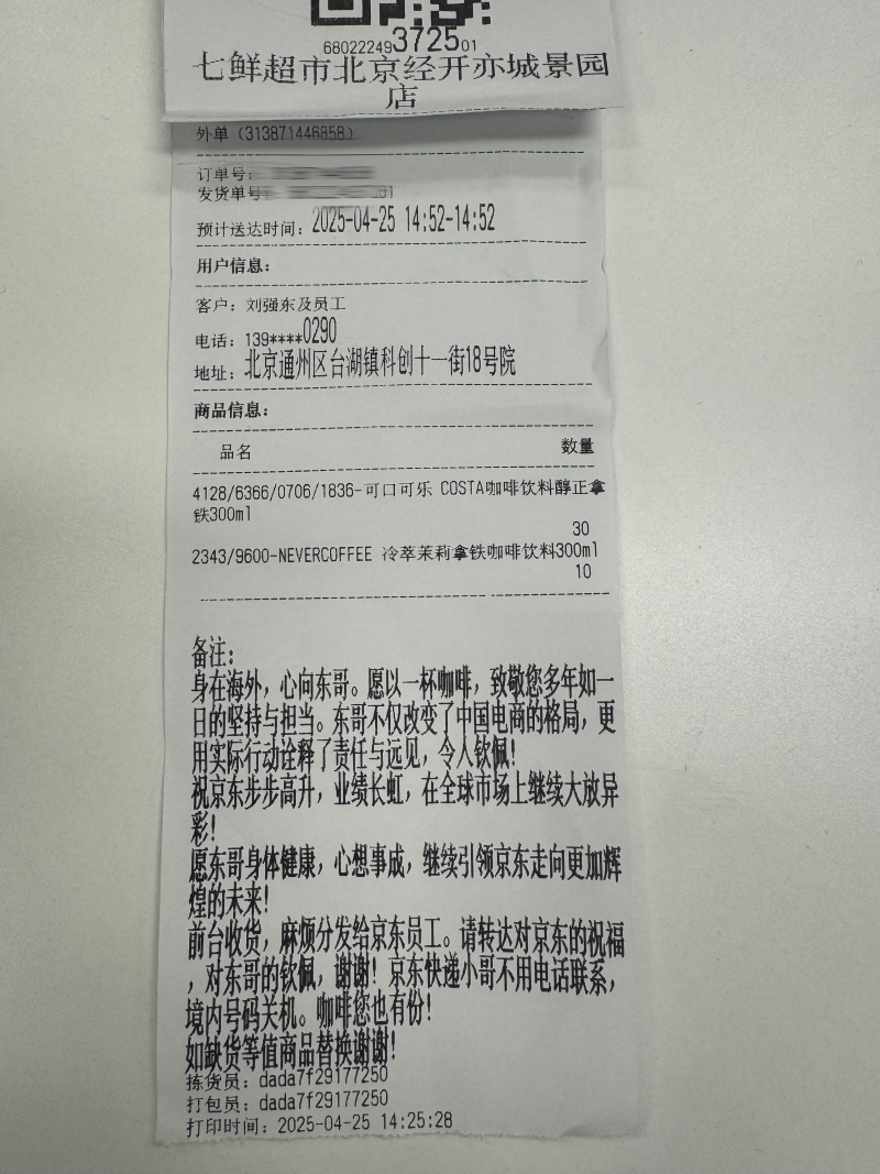 4月25日,北京市經(jīng)開區(qū)京東七鮮亦城景園店后臺接到了一份特殊的訂單,一位遠(yuǎn)在海外的匿名用戶下單了85瓶咖啡,向京東集團(tuán)創(chuàng)始人劉強(qiáng)東及京東員工致敬,并附上情真意切的祝福。 在訂單備注中,該用戶高度贊揚(yáng)劉強(qiáng)東以責(zé)任與遠(yuǎn)見引領(lǐng)中國電商發(fā)展的格局,“愿以一杯咖啡,致敬您多年如一日的堅(jiān)持與擔(dān)當(dāng)”,并祝福京東“步步高升,業(yè)績長虹,在全球市場大放異彩”。此外,用戶特別叮囑配送小哥不用聯(lián)系其本人,并暖心表示:“咖啡您也有份!”并在留言末尾貼心地允許缺貨時替換等值商品。 接到訂單后,京東七鮮團(tuán)隊(duì)迅速響應(yīng),確保咖啡在第一時間送達(dá)。目前,滿載愛心的85瓶咖啡已全部送到京東外賣騎士、快遞小哥、客服人員及京東七鮮超市揀貨員等一線員工手中,讓這份跨國關(guān)懷化作實(shí)實(shí)在在的溫暖。 與此同時,這份來自異國他鄉(xiāng)的問候迅速在京東內(nèi)部引發(fā)熱議,員工們親切地稱這位匿名用戶為“愛心咖啡俠”,京東官方回應(yīng),向這位“愛心咖啡俠”用戶表達(dá)謝意,為其準(zhǔn)備了終身京東PLUS會員權(quán)益,希望愛心一直被傳遞下去。 從海外用戶的85瓶愛心咖啡,到京東回贈的終身PLUS會員權(quán)益,這場溫暖的雙向奔赴,恰是京東企業(yè)價值觀的生動注腳。相信這份跨越山海的溫暖,將化作更多人前行的力量,愿每一份善意都能被真誠以待。 |