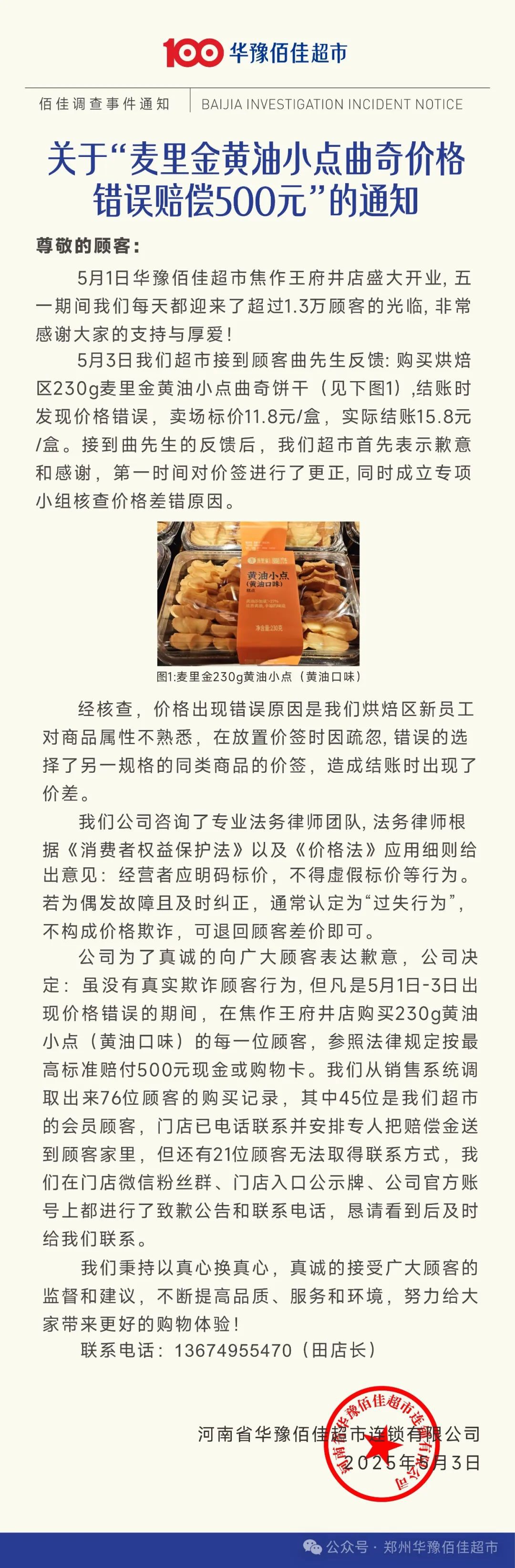 5月6日,華豫佰佳超市焦作店發(fā)布了一則關(guān)于烘焙產(chǎn)品價格錯誤賠償?shù)耐ㄖ?/div> 通知顯示,5月1日,華豫佰佳超市焦作王府井店盛大開業(yè),五一期間吸引了大量顧客前來購物。然而,5月3日,一位姓曲的顧客反饋稱,其在烘焙區(qū)購買的230g麥里金黃油小點(diǎn)曲奇餅干,標(biāo)價與實(shí)際結(jié)賬價格不符。經(jīng)超市核查,該價格錯誤是由于烘焙區(qū)新員工對商品屬性不熟悉,放置價簽時疏忽所致。 華豫佰佳超市焦作店在接到反饋后,立即對價簽進(jìn)行了更正,并成立專項(xiàng)小組調(diào)查原因。公司咨詢專業(yè)法務(wù)律師團(tuán)隊(duì)后,根據(jù)《消費(fèi)者權(quán)益保護(hù)法》和《價格法》相關(guān)規(guī)定,雖然此次事件屬于偶發(fā)的過失行為,不構(gòu)成價格欺詐,但超市仍決定向受影響的顧客進(jìn)行賠償。 超市決定,凡是在5月1日至3日期間,在焦作王府井店購買230g黃油小點(diǎn)(黃油口味)的顧客,將按照最高標(biāo)準(zhǔn)賠付500元現(xiàn)金或購物卡。目前,超市已通過銷售系統(tǒng)調(diào)取了76位顧客的購買記錄,其中45位會員顧客已由門店專人聯(lián)系并安排賠償金送到家中。對于剩余21位無法取得聯(lián)系的顧客,超市已在門店微信粉絲群、門店入口公示牌及公司官方賬號上發(fā)布公告,懇請顧客看到后及時聯(lián)系。 華豫佰佳超市焦作店表示,此次事件是由于超市管理不善所致,他們將加強(qiáng)員工培訓(xùn),完善商品價格管理流程,避免類似事件再次發(fā)生。同時,超市也向廣大顧客表達(dá)了誠摯的歉意,并感謝顧客的理解與支持。 |