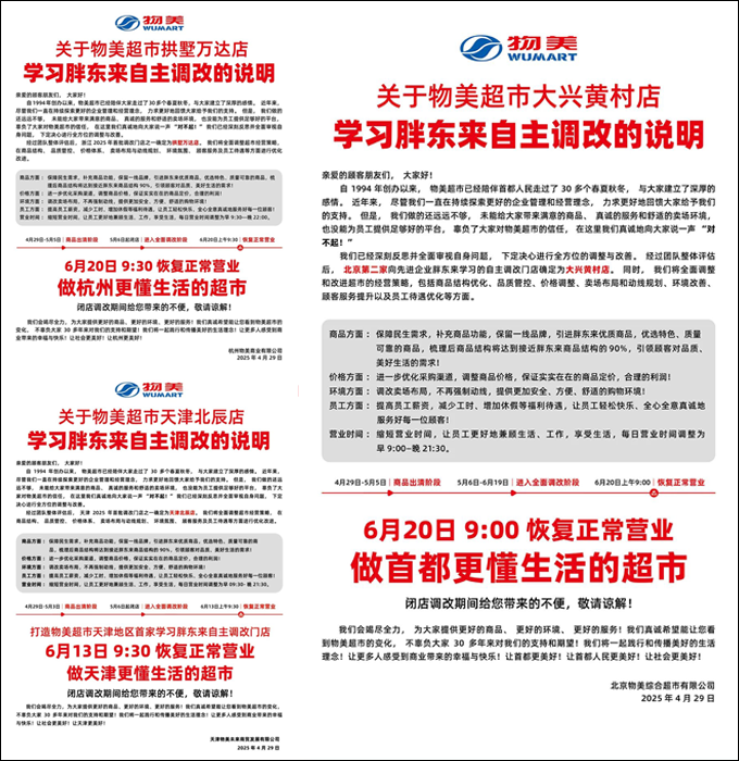 近日,物美發(fā)布消息稱,經(jīng)過團(tuán)隊(duì)整體評(píng)估后,向胖東來學(xué)習(xí)的自主調(diào)改的3家新增門店,分別為北京物美大興黃村店、天津物美北辰店和杭州物美拱墅萬達(dá)店。 具體來看,大興黃村店為北京物美第二家學(xué)習(xí)胖東來自主調(diào)改店,門店于5月6日-6月19日進(jìn)入全面調(diào)改階段,并將于6月20日9:00恢復(fù)正常營業(yè),要做首都更懂生活的超市。 天津北辰店為天津物美首家學(xué)習(xí)胖東來自主調(diào)改店,門店于5月6日起閉店,進(jìn)入全面調(diào)改階段,6月13日9:30恢復(fù)正常營業(yè),要做天津更懂生活的超市。 杭州拱墅萬達(dá)店為浙江物美首家學(xué)習(xí)胖東來自主調(diào)改店,門店于5月6日起閉店,進(jìn)入全面調(diào)改階段,將于6月20日9:30恢復(fù)正常營業(yè),要做杭州更懂生活的超市。 物美稱,目前3家門店正處于商品出清階段,未來會(huì)以更好的商品、更舒適的環(huán)境、更真誠的服務(wù),與消費(fèi)者雙向奔赴。 同時(shí), 物美將全面調(diào)整和改進(jìn)超市的經(jīng)營策略,包括商品結(jié)構(gòu)優(yōu)化、品質(zhì)管控、價(jià)格調(diào)整、賣場(chǎng)布局和動(dòng)線規(guī)劃、環(huán)境改善、顧客服務(wù)提升以及員工待遇優(yōu)化等方面。 |