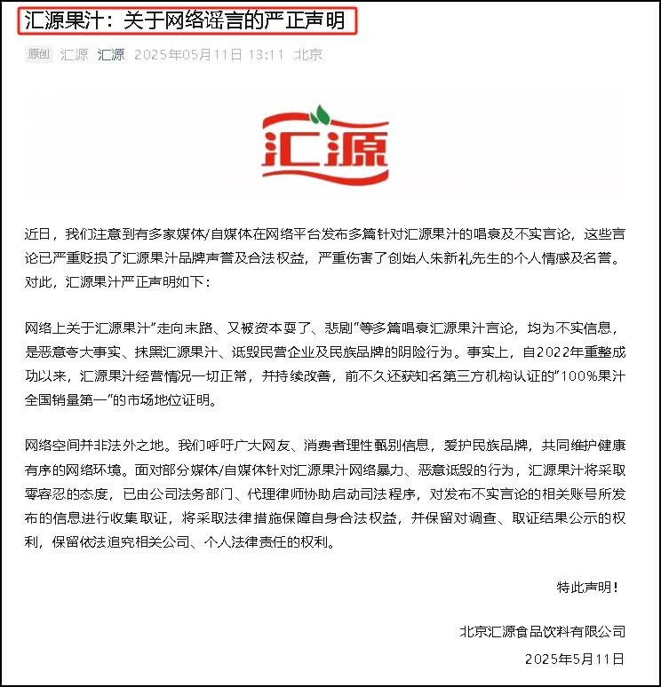 5月11日,匯源果汁官方發(fā)布《關(guān)于網(wǎng)絡(luò)謠言的嚴(yán)正聲明》,針對(duì)近期市場(chǎng)流傳的“走向末路、又被資本耍了、悲劇”等多篇言論進(jìn)行澄清。 聲明指出,此類不實(shí)信息是惡意夸大事實(shí)、抹黑匯源果汁、詆毀民營(yíng)企業(yè)及民族品牌的行為。這些言論已嚴(yán)重貶損了匯源果汁品牌聲譽(yù)及合法權(quán)益,嚴(yán)重傷害了創(chuàng)始人朱新禮先生的個(gè)人情感及名譽(yù)。事實(shí)上,自2022年重整成功以來(lái),匯源果汁經(jīng)營(yíng)情況一切正常,并持續(xù)改善。 匯源果汁指出,網(wǎng)絡(luò)空間并非法外之地,并呼吁廣大網(wǎng)友、消費(fèi)者理性甄別信息,愛(ài)護(hù)民族品牌,共同維護(hù)健康有序的網(wǎng)絡(luò)環(huán)境。 匯源果汁表示,面對(duì)部分媒體/自媒體針對(duì)匯源果汁網(wǎng)絡(luò)暴力、惡意詆毀的行為,將采取零容忍的態(tài)度,已由公司法務(wù)部門(mén)、代理律師協(xié)助啟動(dòng)司法程序,對(duì)發(fā)布不實(shí)言論的相關(guān)賬號(hào)所發(fā)布的信息進(jìn)行收集取證,將采取法律措施保障自身合法權(quán)益,并保留對(duì)調(diào)查、取證結(jié)果公示的權(quán)利,保留依法追究相關(guān)公司、個(gè)人法律責(zé)任的權(quán)利。 |