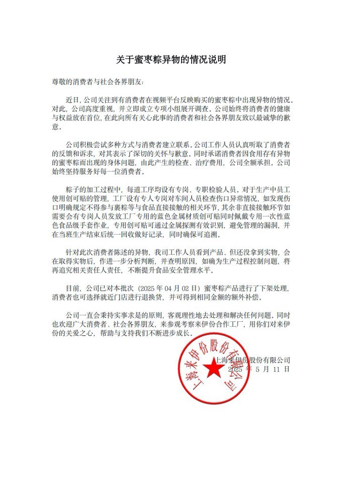 5月11日,上海來(lái)伊份股份有限公司針對(duì)近日消費(fèi)者反映的蜜棗粽中出現(xiàn)創(chuàng)可貼異物事件,發(fā)布官方情況說(shuō)明,積極回應(yīng)社會(huì)關(guān)切。 來(lái)伊份在聲明中表示,公司高度重視此事件,已立即成立專(zhuān)項(xiàng)小組展開(kāi)調(diào)查,并向所有關(guān)心此事的消費(fèi)者和社會(huì)各界朋友致以誠(chéng)摯的歉意。公司始終將消費(fèi)者的健康與權(quán)益放在首位,事件發(fā)生后,積極嘗試多種方式與消費(fèi)者建立聯(lián)系,認(rèn)真聽(tīng)取消費(fèi)者的反饋和訴求,對(duì)其表示了深切的關(guān)懷與歉意,并承諾承擔(dān)因食用存有異物蜜棗粽而產(chǎn)生的檢查、治療費(fèi)用,且始終堅(jiān)持服務(wù)好每一位消費(fèi)者。 在粽子加工過(guò)程中,來(lái)伊份強(qiáng)調(diào)每道工序均設(shè)有專(zhuān)崗、專(zhuān)職檢驗(yàn)人員。對(duì)于生產(chǎn)中員工使用創(chuàng)可貼的管理,工廠設(shè)有專(zhuān)人專(zhuān)崗檢查車(chē)間人員手部異常情況,明確規(guī)定有傷口者不得參與裹粽等與食品直接接觸的環(huán)節(jié),其余非直接接觸環(huán)節(jié)如有需要?jiǎng)t發(fā)放專(zhuān)用藍(lán)色金屬材質(zhì)創(chuàng)口貼并要求佩戴藍(lán)色食品級(jí)手套作業(yè),且創(chuàng)口貼可經(jīng)金屬探測(cè)有效識(shí)別,當(dāng)班生產(chǎn)結(jié)束后統(tǒng)一回收并做好記錄,確?勺匪。 目前,來(lái)伊份已對(duì)本批次蜜棗粽產(chǎn)品進(jìn)行下架處理,消費(fèi)者可就近門(mén)店退換貨,并獲得相同金額的額外補(bǔ)償。公司秉持實(shí)事求是、客觀理性的態(tài)度處理解決問(wèn)題,也歡迎消費(fèi)者和社會(huì)各界朋友參觀考察來(lái)伊份合作工廠,以關(guān)愛(ài)與支持助力其不斷進(jìn)步成長(zhǎng)。 來(lái)伊份將以此為契機(jī),進(jìn)一步強(qiáng)化產(chǎn)品質(zhì)量管控體系,提升食品安全管理水平,持續(xù)為消費(fèi)者提供優(yōu)質(zhì)、放心的產(chǎn)品與服務(wù)。 |