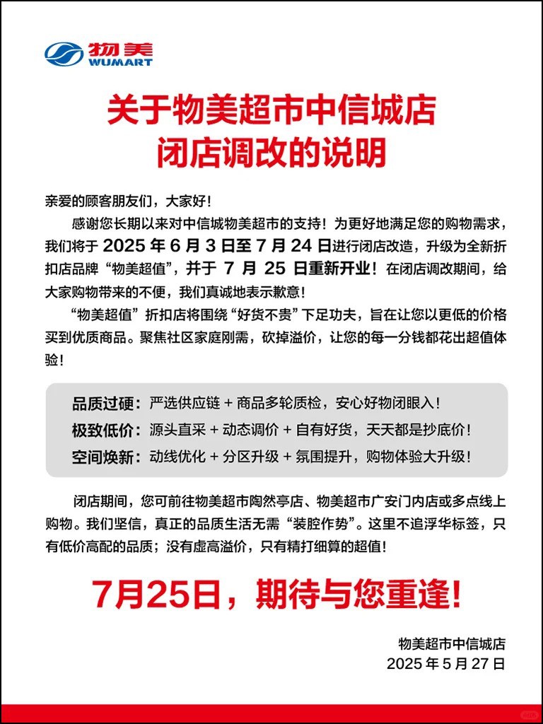 繼學習胖東來后,老牌超市物美調改又有新動作,推出折扣店品牌“物美超值”搶占社區(qū)市場。 01 首批6家折扣店落地 聚焦“好貨不貴”社區(qū)剛需 5月28日,物美宣布將北京6家門店閉店調改為全新折扣品牌 “物美超值”,這是繼今年3月學習胖東來調改門店后,企業(yè)在業(yè)態(tài)創(chuàng)新上的又一次大膽嘗試。 根據(jù)物美超市的調改說明顯示,首批“物美超值”折扣店包括中信城店、西山楓林店、麗澤橋店、朗清園店、和平新城店和豐臺新業(yè)廣場店。這六家門店都將于6月3日—7月24日進行閉店改造,并在7月25日恢復營業(yè)。 據(jù)悉,“物美超值”折扣店將圍繞“好貨不貴”下足功夫,旨在讓您以更低的價格買到優(yōu)質商品。聚焦社區(qū)家庭剛需,砍掉溢價,讓您的每一分錢都花出超值體驗! 圖示:中信城店公告。 從調改方向來看,“物美超值”在多方面下足功夫。品質把控上,采用嚴選供應鏈結合商品多輪質檢的模式,讓消費者對商品質量安心無憂;價格策略上,通過源頭直采、動態(tài)調價以及自有商品開發(fā),確保天天都是抄底價;購物環(huán)境方面,將對門店動線進行優(yōu)化、分區(qū)升級,并提升整體氛圍,全方位實現(xiàn)購物體驗大升級。 此外,從物美公布的概念圖可見,“物美超值” 門店將以藍色和黃色作為主題色,與沃爾瑪煥新門店的主題色不謀而合,同時采用1.99、29.99等極具吸引力的價格展示方式,進一步強化低價心智。 02 雙線調改并行 此次推出折扣店,標志著物美 “雙線調改” 戰(zhàn)略全面落地:一方面 “學習胖東來” 調改煥新,一方面發(fā)力社區(qū)折扣店賽道。 今年3月,物美曾推出首家“學習胖東來”自主調改店——北京學清路店。開業(yè)首日客流量爆棚,銷售額突破了100萬元。 該店通過一個多月的閉店調改,在商品結構優(yōu)化、品質管控、價格調整、賣場布局和動線規(guī)劃、環(huán)境改善、顧客服務提升以及員工待遇優(yōu)化等方面進行了全面升級。比如商品結構與胖東來相似度達90%,引入68款胖東來直供商品;現(xiàn)制加工區(qū)擴容50%,烘焙、熟食品類占比提升至20%;增設免費縫紉、家電清洗等8 項便民服務;基層員工平均薪資上漲 50%,最低月薪達6000元,帶薪年假增至10天起。 彼時,物美集團相關發(fā)言人表示,作為30年老牌商超(始于1994年),近年來,盡管我們一直在持續(xù)探索更好的企業(yè)管理和經(jīng)營理念,但我們做得還遠遠不夠。公司表示,已下定決心進行全方位調整與改善,未來,將以首家學習胖東來自主調改店為模板,在年內完成全國30余家重點門店的調改升級,帶給顧客更好的體驗。 5月,物美宣布新增3家“學習胖東來”調改門店,分別是北京大興黃村店、天津北辰店和杭州拱墅萬達店,預計6月13日和6月20日陸續(xù)恢復營業(yè),標志著調改進入規(guī);A段。 此次推出的“物美超值”被視為2022年“美淘折扣店”的升級版。與學清路店的學習胖東來調改不同,新折扣店更側重以供應鏈效率驅動性價比。 其定位與沃爾瑪深圳社區(qū)店高度重合——后者今年1月、4月已新開2家門店,6月還將推出第3家,均以“小而精”模式聚焦家庭日常消費。與此同時,奧樂齊、盒馬 NB等折扣品牌加速下沉,奧樂齊無錫首店首日銷售額突破百萬元,展現(xiàn)出該業(yè)態(tài)的市場爆發(fā)力。 【總結】 隨著電商沖擊與行業(yè)競爭加劇,傳統(tǒng)商超的業(yè)態(tài)調整已進入深水區(qū)。一方面,物美、步步高等傳統(tǒng)商超加速推進 “學習胖東來”的門店調改;另一方面,沃爾瑪重啟社區(qū)店、奧樂齊與盒馬NB發(fā)力折扣店并加速下沉。 在此背景下,物美推出“物美超值”折扣業(yè)態(tài)能否為行業(yè)轉型探索新路徑,仍需市場檢驗。今年7月,首批 “物美超值” 折扣店的落地表現(xiàn)如何?值得持續(xù)關注。 |