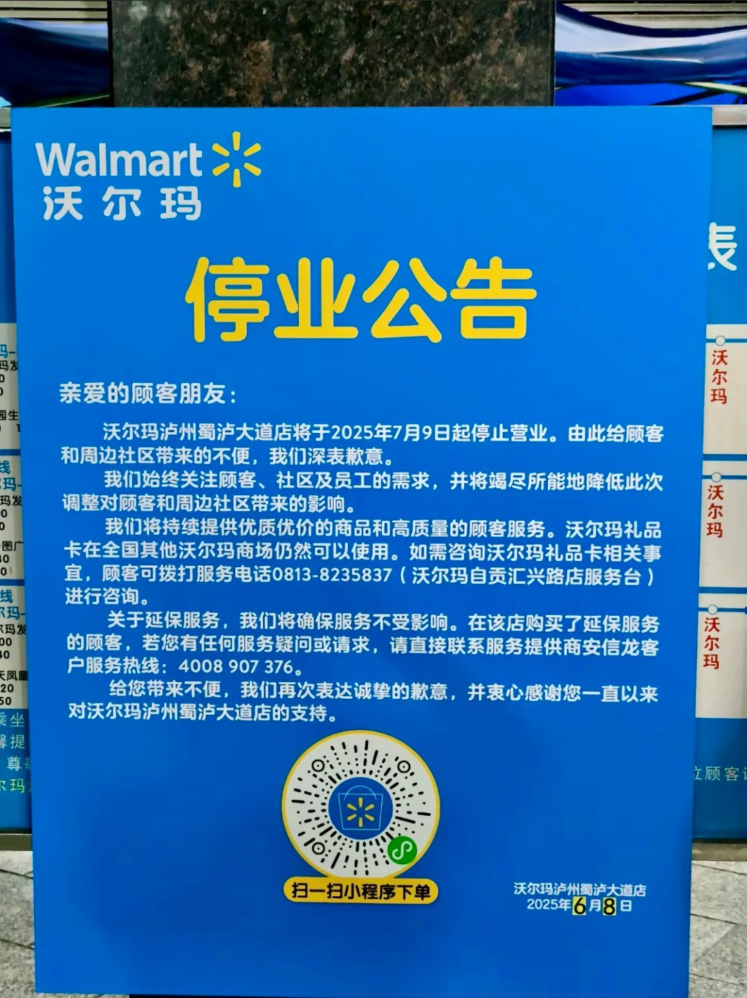 6月9日消息,職業(yè)零售網(wǎng)獲悉,沃爾瑪瀘州蜀瀘大道店宣布將于2025年7月9日起停止?fàn)I業(yè)。公告稱,自6月9日起至7月9日,門店?duì)I業(yè)時(shí)間將變更為9:00-17:00,并在規(guī)定時(shí)間及條件下對(duì)賣場(chǎng)內(nèi)大部分商品進(jìn)行處理。 對(duì)于閉店原因,有網(wǎng)友留言透露稱,自2019年12月26日開業(yè)至今一直處于虧損狀態(tài),門店稱虧損原因包括疫情、地理位置、客群、成本等多重因素。 同時(shí)公告中還表示,將持續(xù)提供優(yōu)質(zhì)優(yōu)價(jià)的商品和高質(zhì)量顧客服務(wù),沃爾瑪禮品卡在全國(guó)其他沃爾瑪商場(chǎng)仍可使用。 |