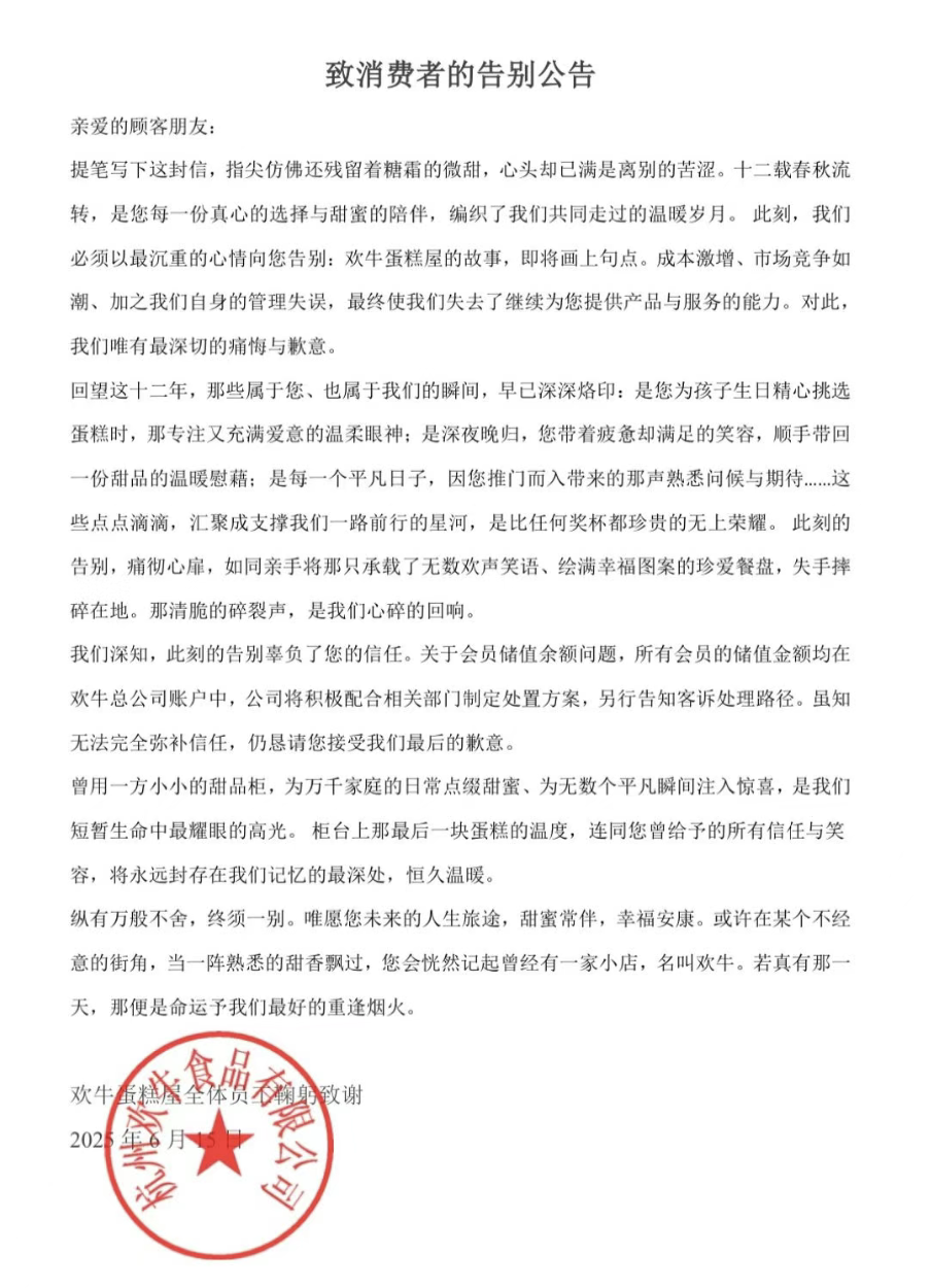 6月15日,歡牛蛋糕屋發(fā)布“致消費者的告別公告”稱,成本激增、市場競爭如潮、加之自身的管理失誤,最終使企業(yè)失去了繼續(xù)為顧客提供產(chǎn)品與服務的能力。關于會員儲值余額問題,歡牛蛋糕屋稱,所有會員的儲值金額均在歡?偣举~戶中,公司將積極配合相關部門制定處置方案,另行告知客訴處理路徑。 不過,有知情人士透露,歡牛蛋糕屋即將啟動破產(chǎn)程序。 此前,歡牛蛋糕屋所屬公司歡牛(杭州)餐飲管理有限公司被列為被執(zhí)行人,執(zhí)行總標的為111.42萬元,申請人為上海蓉鮮供應鏈科技有限公司。6月6日,該公司法定代表人徐浩被限制高消費。 公開資料顯示,歡牛蛋糕屋是2013年創(chuàng)立于浙江杭州的原創(chuàng)甜品烘焙連鎖品牌,以“健康+品質(zhì)+創(chuàng)新”為核心理念,瞄準新一代年輕消費者推出甜品西點、小蛋糕、手工面包、干貨點心、節(jié)日限定飲品等產(chǎn)品,以及提供下午茶企業(yè)定制、婚禮甜品臺定制、企事業(yè)蛋糕定制等服務。 2022年,歡牛蛋糕屋曾完成近千萬美元A輪融資,由順為資本獨家投資,所得資金用于門店開拓和品牌升級。 企查查APP顯示,歡牛(杭州)餐飲管理有限公司共涉及5起司法案件,有4起集中發(fā)生在2025年,包括3起買賣合同糾紛和1起運輸合同糾紛。 |