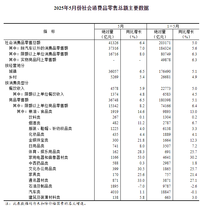 6月17日,據(jù)國家統(tǒng)計(jì)局消息,5月份,社會消費(fèi)品零售總額41326億元,同比增長6.4%。其中,除汽車以外的消費(fèi)品零售額37316億元,增長7.0%。1-5月份,社會消費(fèi)品零售總額203171億元,增長5.0%。其中,除汽車以外的消費(fèi)品零售額184324億元,增長5.6%。 按經(jīng)營單位所在地分,5月份,城鎮(zhèn)消費(fèi)品零售額36057億元,同比增長6.5%;鄉(xiāng)村消費(fèi)品零售額5269億元,增長5.4%。1-5月份,城鎮(zhèn)消費(fèi)品零售額176490億元,增長5.1%;鄉(xiāng)村消費(fèi)品零售額26681億元,增長4.9%。 按消費(fèi)類型分,5月份,商品零售額36748億元,同比增長6.5%;餐飲收入4578億元,增長5.9%。1-5月份,商品零售額180398億元,增長5.1%;餐飲收入22773億元,增長5.0%。 1-5月份,全國網(wǎng)上零售額60402億元,同比增長8.5%。其中,實(shí)物商品網(wǎng)上零售額49878億元,增長6.3%,占社會消費(fèi)品零售總額的比重為24.5%;在實(shí)物商品網(wǎng)上零售額中,吃類、穿類、用類商品分別增長14.5%、1.2%、6.1%。 |