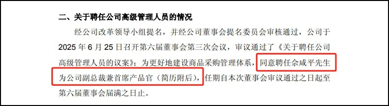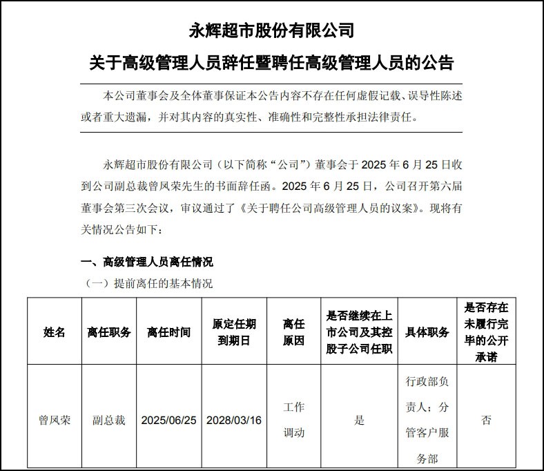 6月25日消息,永輝超市公告稱,公司董事會于近日收到副總裁曾鳳榮先生的書面辭任函,曾鳳榮先生因工作調(diào)動原因辭去副總裁職務(wù),辭任自送達(dá)董事會時(shí)生效,其原定任期至 2028 年3月16 日。值得注意的是,盡管不再擔(dān)任副總裁,曾鳳榮仍將繼續(xù)在公司及控股子公司任職,擔(dān)任行政部負(fù)責(zé)人并分管客戶服務(wù)部。 目前公司已完成相關(guān)交接工作,曾鳳榮不存在未履行完畢的公開承諾。 圖來源:永輝公告。 同日,永輝超市召開第六屆董事會第三次會議,審議通過了《關(guān)于聘任公司高級管理人員的議案》。經(jīng)公司改革領(lǐng)導(dǎo)小組提名,并經(jīng)董事會提名委員會審核通過,公司決定聘任佘咸平先生為公司副總裁兼首席產(chǎn)品官,任期自董事會審議通過之日起至第六屆董事會屆滿之日止。 圖來源:永輝公告。 公開資料顯示,佘咸平生于1978 年7月,中國國籍,畢業(yè)于中國人民大學(xué)商學(xué)院,本科學(xué)歷,2025年5月入職永輝。其職業(yè)生涯履歷豐富,曾先后擔(dān)任沃爾瑪山姆會員店全國生鮮采購總監(jiān)、阿里巴巴盒馬鮮生生鮮采購總監(jiān),2022 年加入阿里巴巴大潤發(fā)會員店項(xiàng)目并擔(dān)任采購總經(jīng)理。 事實(shí)上6 月初已有媒體報(bào)道稱,原大潤發(fā)M會員店商品負(fù)責(zé)人佘咸平離職后轉(zhuǎn)任永輝CMO(首席產(chǎn)品官),接替此前離職的黃林。 永輝此前并無“首席產(chǎn)品官”或“CMO”崗位設(shè)置,這一全新職位的設(shè)立及山姆背景管理者的引入,被外界視為其推進(jìn)組織變革、對標(biāo)行業(yè)標(biāo)桿的重要信號,也彰顯了企業(yè)對人才的重視與戰(zhàn)略轉(zhuǎn)型的決心。 早在6月13日永輝全國門店調(diào)改突破100家時(shí),佘咸平便已以CMO身份首次公開發(fā)聲,回應(yīng)商品策略的“胖東來模式”調(diào)改方向:“永輝將全面對標(biāo)胖東來的商品品質(zhì)與價(jià)格體系,從品質(zhì)與情感維度構(gòu)建高質(zhì)價(jià)比、多元化的特色商品矩陣! 他表示,永輝將復(fù)制胖東來的優(yōu)質(zhì)供應(yīng)鏈體系,大力提升自有商品開發(fā)能力,今年計(jì)劃推出至少60款自有品牌商品,2026年圍繞“超級質(zhì)價(jià)比、嚴(yán)選干凈配方、趨勢潮流創(chuàng)新”三大方向持續(xù)迭代,同時(shí)增加區(qū)域特色商品,打造主題化陳列,強(qiáng)化商品的情感價(jià)值輸出。 在品質(zhì)層面,永輝將重點(diǎn)學(xué)習(xí)胖東來“干凈的配料表、豐富的進(jìn)口商品選擇、與國內(nèi)知名品牌聯(lián)合定制”等經(jīng)驗(yàn),同步筑牢食品安全防線;價(jià)格策略上,則借鑒胖東來 “去除中間成本、避免頻繁促銷、以長期穩(wěn)定最優(yōu)價(jià)格服務(wù)消費(fèi)者” 的理念。 圖片 據(jù)永輝超市透露,預(yù)計(jì)到7月底,永輝全國調(diào)改門店將突破150家,2026年農(nóng)歷春節(jié)前計(jì)劃完成300家門店調(diào)改目標(biāo),通過持續(xù)的商品體系升級,夯實(shí) “國民超市 品質(zhì)永輝” 的品牌定位。 這一系列動作背后,既是永輝應(yīng)對零售市場競爭的主動變革,也折射出其通過高端人才引入與商品力提升重塑核心競爭力的戰(zhàn)略布局。 |