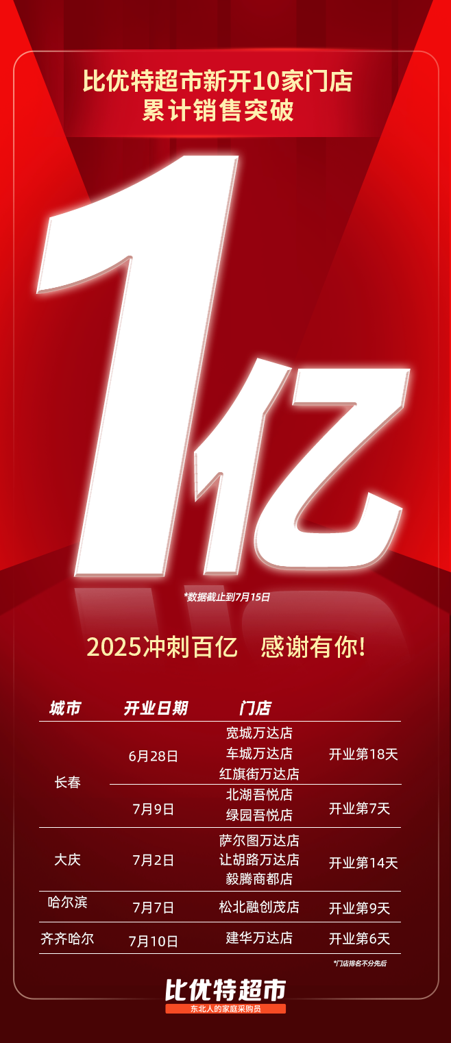 7月17日消息,比優(yōu)特超市近期新開10家門店,累計銷售額已突破1億元。 這10家新店分布于長春、大慶、哈爾濱、齊齊哈爾四城,具體包括寬城萬達(dá)店、車城萬達(dá)店、紅旗街萬達(dá)店、北湖吾悅店、綠園吾悅店、薩爾圖萬達(dá)店、讓胡路萬達(dá)店、毅騰商都店、松北融創(chuàng)茂店及建華萬達(dá)店。從開業(yè)時長來看,運營最久的門店已達(dá)18天,最短的為6天。 |