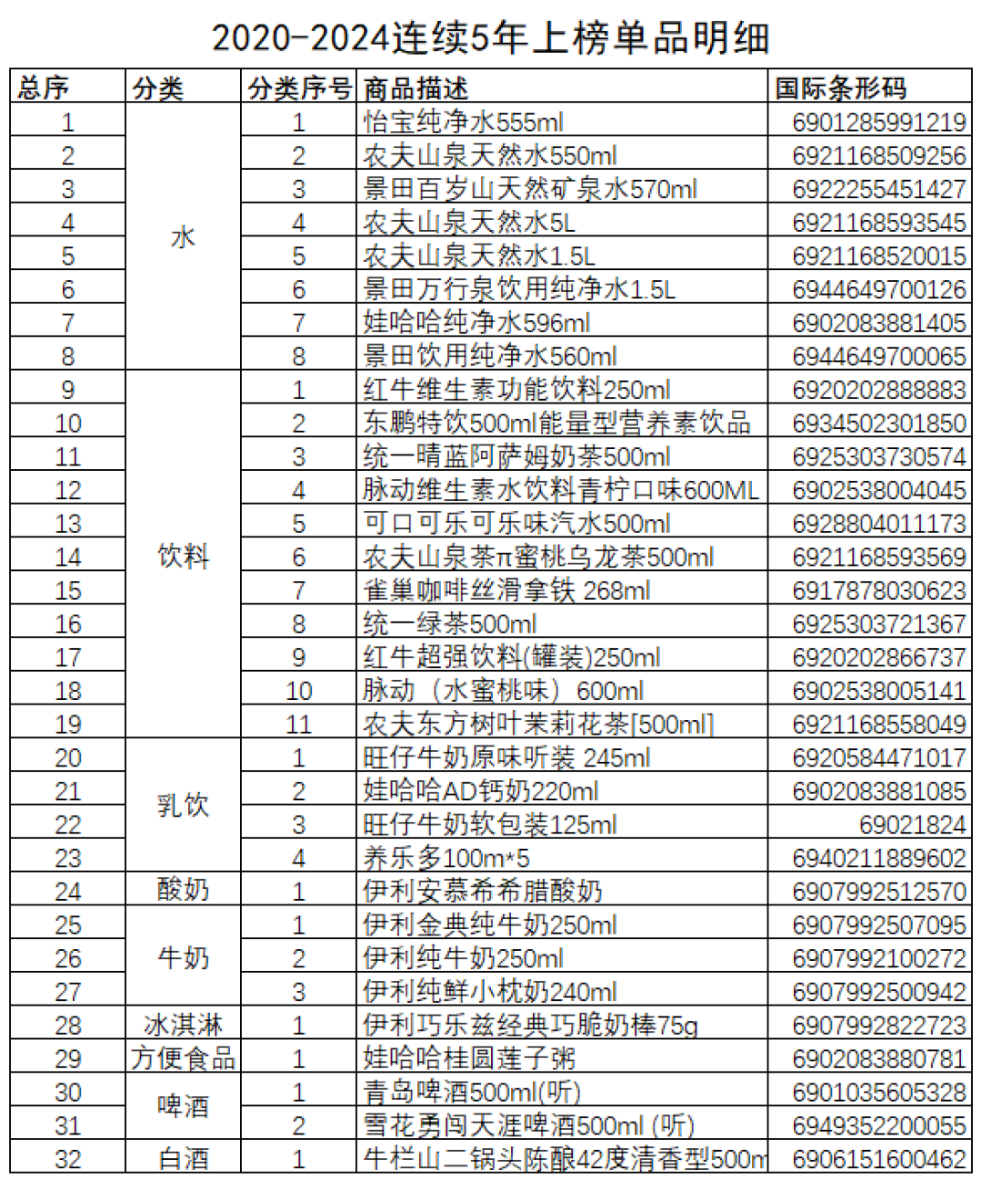 7月1日17日,中國連鎖經(jīng)營協(xié)會發(fā)布中國便利店五年暢銷商品名單。 從五年銷售統(tǒng)計名單看,水、牛奶單品數(shù)保持穩(wěn)定,飲料、白酒和啤酒品項數(shù)比前兩年增多,酸奶、乳飲料、冰淇淋、方便速食、休閑食品比前兩年品項數(shù)下降。 基于連續(xù)5年發(fā)布的銷售統(tǒng)計,共有32個單品持續(xù)出現(xiàn)在名單中。水有8個單品,飲料有11個單品,乳飲料有4個,牛奶有3個,啤酒有2個,酸奶、冰激凌、方便食品和白酒各有1個單品。 縱觀5年各品類表現(xiàn),可以看出:暢銷商品更加集中于某些品牌;暢銷商品的汰換率漸漸趨緩。 |