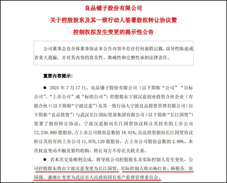 7月17日晚間,良品鋪子發(fā)布公告稱,公司控股股東寧波漢意創(chuàng)業(yè)投資合伙企業(yè)(有限合伙)及其一致行動人寧波良品投資管理有限公司與武漢長江國際貿(mào)易集團有限公司簽署了股份轉(zhuǎn)讓協(xié)議。 寧波漢意擬向長江國貿(mào)轉(zhuǎn)讓其持有的上市公司7223.988萬股股份,占上市公司股份總數(shù)的18.01%;良品投資擬向長江國貿(mào)轉(zhuǎn)讓其持有的上市公司1197.012萬股股份,占上市公司股份總數(shù)的2.99%。 本次權(quán)益變動不觸及要約收購。若本次交易順利完成,長江國貿(mào)將成為公司控股股東,武漢金融控股為全資股東,將成為實際控制人。公司股票將于2025年7月18日(星期五)開市起復(fù)牌。 長江國貿(mào)系武漢金融控股(集團)有限公司,背后是國資。作為武漢市屬大型國際貿(mào)易平臺企業(yè),長江國貿(mào)聚焦供應(yīng)鏈綜合服務(wù)、國際及國內(nèi)貿(mào)易、現(xiàn)代倉儲物流、涉外經(jīng)貿(mào)交流等,秉承“引金融‘活水’,提升供應(yīng)鏈價值”理念:通過供應(yīng)鏈服務(wù)與金融工具創(chuàng)新深度協(xié)同,降低全鏈條運營成本,提升產(chǎn)業(yè)鏈綜合效能,為良品鋪子的戰(zhàn)略轉(zhuǎn)型注入新動能,以“長期資本”“耐心資本”賦能本土特色實體產(chǎn)業(yè)發(fā)展。 據(jù)悉,依托國資資源,良品鋪子將聚焦產(chǎn)品創(chuàng)新與供應(yīng)鏈整合,實現(xiàn)兩個關(guān)鍵轉(zhuǎn)型:從“品質(zhì)零食”向“品質(zhì)食品”擴容,從產(chǎn)品商向產(chǎn)業(yè)生態(tài)組織者進化,加快發(fā)展成為產(chǎn)品特色化、渠道多元化、供應(yīng)鏈高效化、品牌國際化的食品領(lǐng)軍企業(yè)。 “這不是一次簡單的股權(quán)交易,而是為下個十年的發(fā)展,提前布局核心競爭力。”良品鋪子方面表示,此次控制權(quán)變更,正是控股股東基于公司長遠發(fā)展做出的審慎選擇,通過優(yōu)化股權(quán)結(jié)構(gòu),引入產(chǎn)業(yè)與資本資源,為公司高質(zhì)量發(fā)展注入核心動力,是良品鋪子應(yīng)對行業(yè)發(fā)展新階段、主動尋求變革的戰(zhàn)略升級,以更好地回饋廣大消費者與投資者。 據(jù)良品鋪子方面表示,本次控制權(quán)轉(zhuǎn)讓系良品鋪子股東與長江國貿(mào)基于長期戰(zhàn)略協(xié)同的市場化選擇,交易嚴格遵循監(jiān)管規(guī)則,將依法履行信息披露,確保中小股東權(quán)益。 同時,據(jù)相關(guān)方表示,創(chuàng)始人楊紅春并未“離場”,將留任高管并保留重要股東身份。 7月15日,良品鋪子發(fā)布了2025年中期業(yè)績預(yù)告,預(yù)告顯示,良品鋪子上半年預(yù)計實現(xiàn)凈利潤為-1.05億元到-0.75億元(未經(jīng)審計),扣非凈利潤分別為-1.30億元到-1.00億元。 |