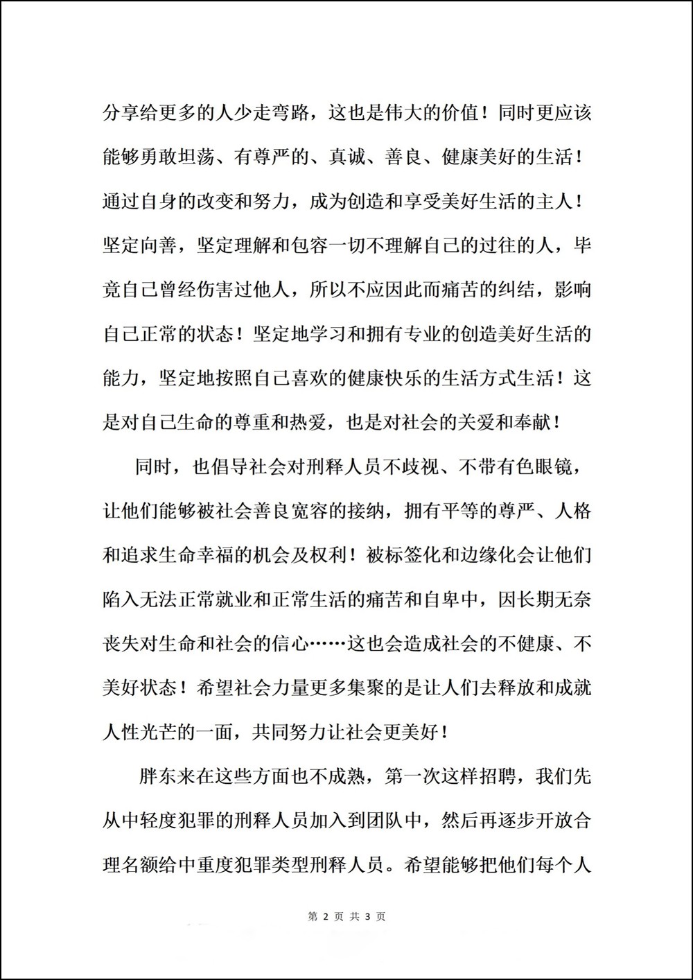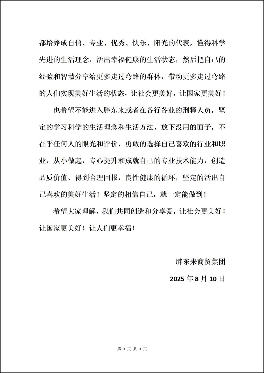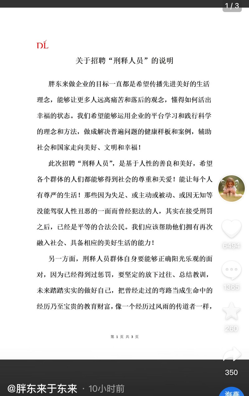 近日,胖東來(lái)擬招聘刑釋人員一事引發(fā)熱議。8月10日晚,胖東來(lái)創(chuàng)始人于東來(lái)在社交平臺(tái)發(fā)布關(guān)于招聘“刑釋人員”的說(shuō)明,進(jìn)一步對(duì)此事作出回應(yīng)。 胖東來(lái)表示,此次招聘“刑釋人員”,是基于人性的善良和美好,希望各個(gè)群體的人們都能夠得到社會(huì)的尊重和關(guān)愛(ài),能讓每個(gè)人有尊嚴(yán)的生活。那些曾經(jīng)犯法的人,其實(shí)在接受刑罰之后,已經(jīng)是平等的合法公民!拔覀儜(yīng)該幫助他們擁有再次融入社會(huì)、具備相應(yīng)的美好生活的能力! 胖東來(lái)倡導(dǎo)社會(huì)對(duì)刑釋人員不歧視、不帶有色眼鏡,讓他們能夠被社會(huì)善良寬容的接納,擁有平等的尊嚴(yán)、人格和追求生命幸福的機(jī)會(huì)及權(quán)利。 胖東來(lái)強(qiáng)調(diào),公司在這些方面也不成熟,第一次這樣招聘,先從中輕度犯罪的刑釋人員加入到團(tuán)隊(duì)中,然后再逐步開(kāi)放合理名額給中重度犯罪類型刑釋人員。 同時(shí),胖東來(lái)還表示,也希望不能進(jìn)入胖東來(lái)或者在各行各業(yè)的刑釋人員,堅(jiān)定的學(xué)習(xí)科學(xué)的生活理念和生活方法,放下沒(méi)用的面子,不在乎任何人的眼光和評(píng)價(jià),勇敢地選擇自己喜歡的行業(yè)和職業(yè)。 此前(8月8日),于東來(lái)發(fā)布曾消息稱,新鄉(xiāng)胖東來(lái)“三胖”啟動(dòng)招工,預(yù)計(jì)招聘名額約1000人。其中,20%的名額將預(yù)留出來(lái),面向?yàn)閲?guó)家作出巨大奉獻(xiàn)的新疆、西藏高原艱苦地區(qū)退伍邊防軍人;同時(shí)設(shè)置2%的名額,面向有犯罪史的服刑人員,目的是讓這一曾走過(guò)彎路的群體獲得尊重與關(guān)愛(ài),成為創(chuàng)造和享受美好生活的一份子。 |