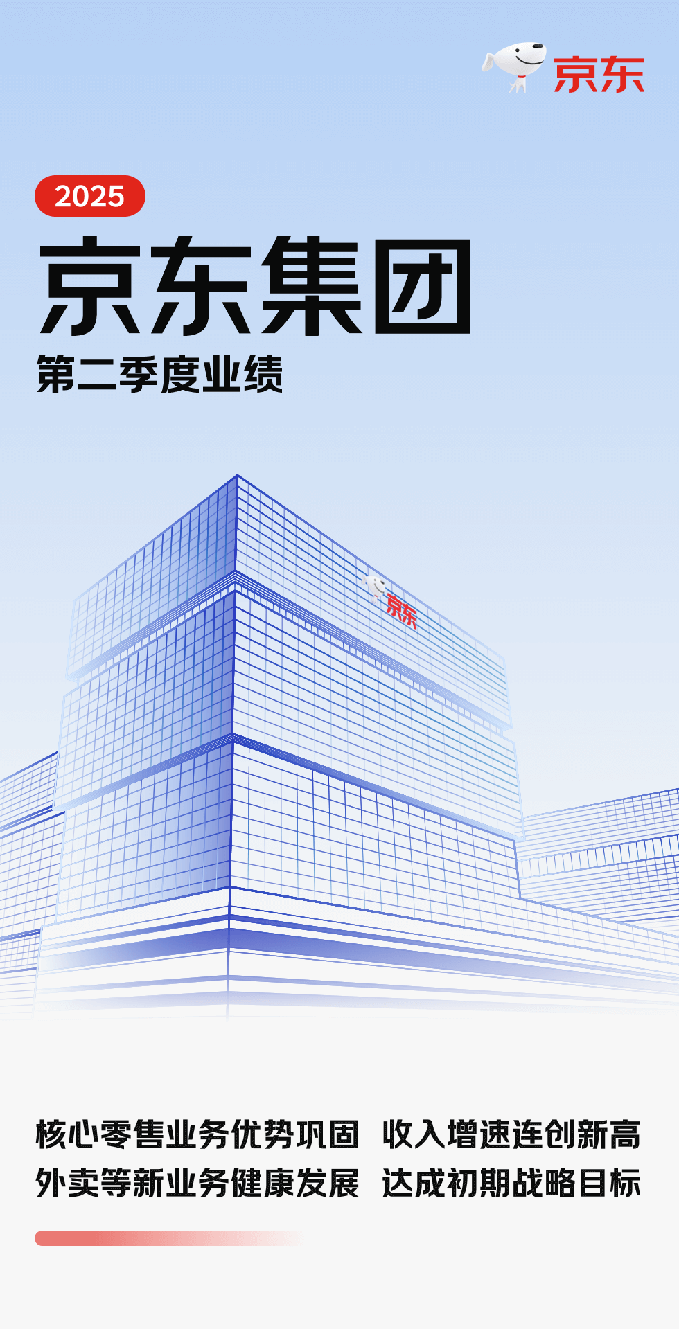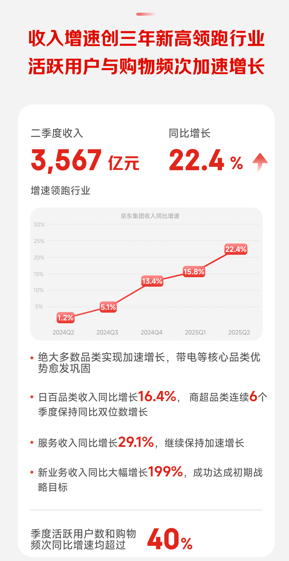 8月14日,京東集團發(fā)布2025年第二季度財報。京東集團收入繼續(xù)保持加速增長態(tài)勢,核心零售業(yè)務(wù)持續(xù)加速增長,市場優(yōu)勢地位進一步鞏固,新業(yè)務(wù)健康發(fā)展并已達成初期戰(zhàn)略目標(biāo)。 二季度,京東集團收入為3567億元人民幣(約498億美元),同比增長22.4%,遠超市場預(yù)期,再次刷新近三年來同比增速的紀錄。 二季度,京東集團絕大多數(shù)品類實現(xiàn)加速增長,帶電等核心品類優(yōu)勢愈發(fā)鞏固。日百品類收入同比加速增長16.4%,其中商超品類連續(xù)6個季度保持收入同比雙位數(shù)增長。服務(wù)收入同比加速增長29.1%。京東外賣帶動新業(yè)務(wù)的收入同比大幅增長199%。 二季度,得益于核心零售業(yè)務(wù)和外賣等新業(yè)務(wù)的發(fā)展勢頭,京東集團的季度活躍用戶數(shù)和購物頻次均實現(xiàn)超過40%的同比增長,季度活躍用戶數(shù)實現(xiàn)了連續(xù)7個季度的同比雙位數(shù)增長。 “二季度,京東平臺的用戶流量、季度活躍用戶數(shù)以及用戶購買頻次等均取得顯著增長,這主要得益于核心京東零售業(yè)務(wù)和外賣等新業(yè)務(wù)的持續(xù)發(fā)展勢頭,”京東集團首席執(zhí)行官許冉女士表示。“本季度,京東零售收入同比增長20.6%,表現(xiàn)強勁,經(jīng)營利潤率達到4.5%,創(chuàng)下公司歷史上所有大促季度的最高紀錄。同期,京東外賣業(yè)務(wù)也取得健康發(fā)展,不僅在訂單量增長、商家數(shù)量擴大、全職騎手招聘等方面穩(wěn)步推進,更重要的是與京東零售以及其他現(xiàn)有業(yè)務(wù)形成有效協(xié)同,成功達成我們的初期戰(zhàn)略目標(biāo)。展望未來,隨著我們持續(xù)聚焦用戶體驗、成本和效率,我們相信核心零售業(yè)務(wù)將始終是京東業(yè)務(wù)版圖的基石,同時我們也將按照長期戰(zhàn)略規(guī)劃,持續(xù)布局新增長領(lǐng)域! 以創(chuàng)新模式提升用戶體驗 今年的“京東618”再創(chuàng)新高,下單用戶數(shù)同比增長超100%領(lǐng)跑行業(yè),京東零售線上業(yè)務(wù)、線下業(yè)態(tài)及京東外賣整體訂單量超22億單。京東618期間,京東APP的日活躍用戶創(chuàng)歷史新高,3C、家電品類的規(guī)模、增速穩(wěn)居行業(yè)第一,服飾美妝、日百品類增速領(lǐng)跑行業(yè)。 截至二季度末,包括京東之家、京東手機數(shù)碼專賣店、京東電腦數(shù)碼專賣店等京東3C數(shù)碼門店突破3,000家;京東MALL累計開業(yè)門店24家,成為京東在線下的新潮產(chǎn)品展示中心、用戶體驗互動中心和城市級服務(wù)中心;京東養(yǎng)車全國門店數(shù)量突破2,500家,80%的城市門店實現(xiàn)100%盈利。 京東超市依托自營供應(yīng)鏈優(yōu)勢,推出了包括211毫升裝的大品牌牛奶和酸奶,以及211毫升裝和618毫升裝的白酒等一系列京東“標(biāo)簽”商品。京東服飾全面上線“安心品質(zhì)標(biāo)”,護航服飾消費,率先涵蓋防曬衣、羽絨服、羊絨羊毛衫、保暖內(nèi)衣、沖鋒衣等品質(zhì)商品。 二季度,京東成為“蘇超”官方戰(zhàn)略合作伙伴,助力賽事進一步擴大影響力,更幫助江蘇特產(chǎn)熱銷全國。同時,京東也成為“蘇超”宿遷足球隊頂級戰(zhàn)略合作伙伴,依托于供應(yīng)鏈能力更好地向全國推薦宿遷地道美食、風(fēng)味特產(chǎn)!疤K超”官方旗艦店也已落地京東,帶來海量“蘇超”官方特許商品。 今年廣東荔枝大豐收,京東發(fā)揮“產(chǎn)地直采+源頭直發(fā)+高效物流+全渠道銷售”的供應(yīng)鏈能力,發(fā)起行業(yè)內(nèi)最大規(guī)模的助銷廣東荔枝專項行動,不僅讓廣東荔枝“鮮”達包括新疆在內(nèi)的全國各地,還用不到48小時送至歐洲消費者手中,今年荔枝季,廣東荔枝在京東銷量同比增長超4倍。 京喜自營在江蘇宿遷啟動“廠貨百補”計劃,以全鏈路服務(wù)能力驅(qū)動商家高質(zhì)量增長;產(chǎn)業(yè)帶爆品計劃將依托京東出口轉(zhuǎn)內(nèi)銷2,000億計劃,扶持10萬個外貿(mào)工廠轉(zhuǎn)內(nèi)銷。 京東借助完善的跨境供應(yīng)鏈能力,啟動了“百億千品新增長計劃”,未來三年內(nèi)將通過跨境模式引入1,000個海外新品牌,并助力其達成累計100億元的銷售增長。 京東物流在沙特推出海外快遞品牌JoyExpress,當(dāng)?shù)叵M者的電商購物也可以享受最快當(dāng)日達、次日達。 堅決抵制“0元購” 京東外賣堅持反內(nèi)卷立場,堅決杜絕不正當(dāng)競爭,堅決抵制“0元購”等惡性補貼,“比品質(zhì)”、“比服務(wù)”,堅守品質(zhì)定位和食品安全底線,以技術(shù)賦能、供應(yīng)鏈創(chuàng)新等打造核心競爭力。二季度,京東外賣業(yè)務(wù)日單量突破2500萬單,京東絕不為體現(xiàn)市場地位惡意沖單量、制造市場泡沫。目前,京東外賣業(yè)務(wù)覆蓋全國350個城市,超150萬家品質(zhì)餐飲門店入駐,構(gòu)建起較為完善的服務(wù)網(wǎng)絡(luò),已有近200個餐飲品牌銷量破百萬,京東與超15萬名全職騎手直簽勞動合同、為其繳納五險一金。京東外賣還與眾多行業(yè)頭部企業(yè)展開合作,為其帶來多場景、高品質(zhì)的企業(yè)用餐解決方案,覆蓋重點企業(yè)數(shù)量超15000家。 七鮮小廚定位“品質(zhì)餐飲合營制作平臺”,堅決不讓合伙商家虧損,堅決摒棄“二房東”模式,是京東以供應(yīng)鏈創(chuàng)新推動餐飲外賣行業(yè)