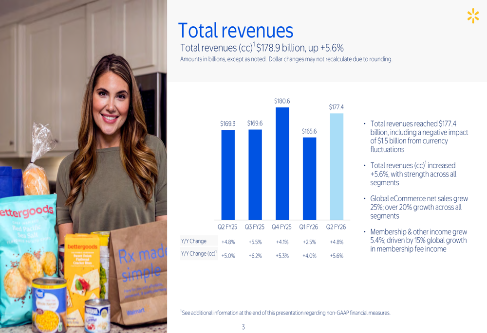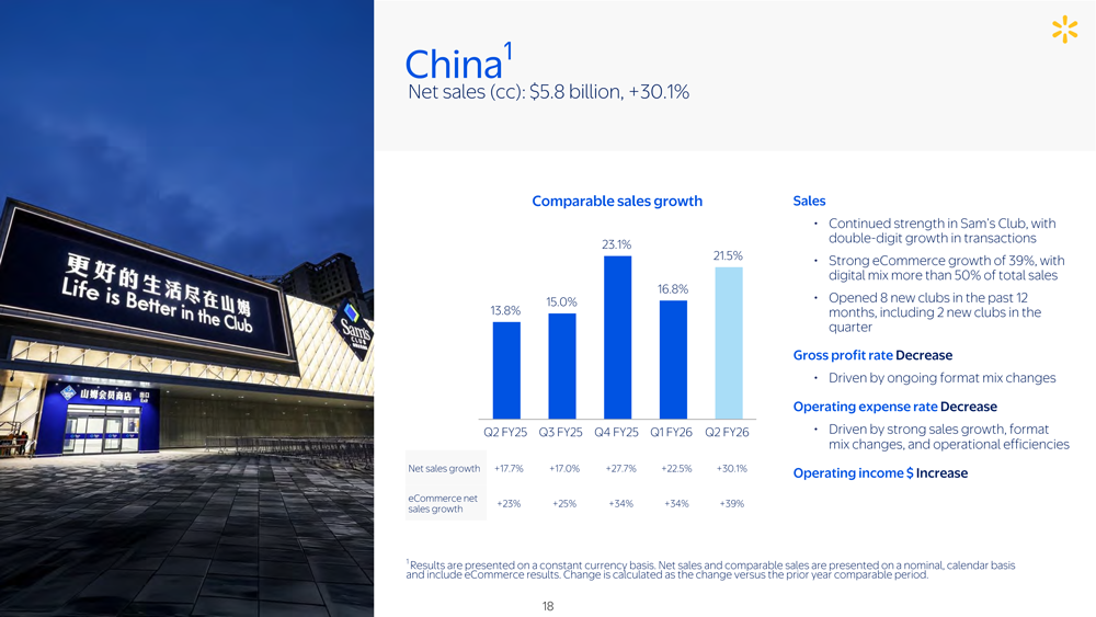 8月21日,沃爾瑪公司公布了2026財(cái)年第二季度(截至2025年7月31日)業(yè)績(jī),整體營(yíng)收為1774億美元,同比增長(zhǎng)4.8%,高于市場(chǎng)預(yù)估的 1761.6億美元;按固定匯率計(jì)算,增幅達(dá)5.6%。 公司營(yíng)業(yè)利潤(rùn)下降8.2%至73億美元,但按固定匯率調(diào)整后微增0.4%;全球電商銷(xiāo)售額飆升25%,成為拉動(dòng)收入的核心動(dòng)力。 不過(guò),其二季度調(diào)整后每股收益為0.68美元,低于市場(chǎng)預(yù)估的0.74美元,受此影響,沃爾瑪股價(jià)下跌4.4%,創(chuàng)5月15日以來(lái)最大盤(pán)中跌幅。 作為沃爾瑪國(guó)際業(yè)務(wù)的核心增長(zhǎng)引擎,中國(guó)市場(chǎng)表現(xiàn)尤為突出。第二季度,沃爾瑪中國(guó)凈銷(xiāo)售額58億美元(約合人民幣416億元),同比增長(zhǎng)30.1%;可比銷(xiāo)售額增長(zhǎng) 21.5%;電商銷(xiāo)售額增幅達(dá)39%,得益于自提與配送服務(wù)以及第三方平臺(tái)共同拉動(dòng),數(shù)字化銷(xiāo)售占比已超總銷(xiāo)售額的50%,線(xiàn)上線(xiàn)下融合態(tài)勢(shì)顯著。 其中,沃爾瑪國(guó)際總裁兼首席執(zhí)行官Kathryn McLay對(duì)中國(guó)電商業(yè)務(wù)的增長(zhǎng)提出了表?yè)P(yáng):“在中國(guó),我們又新開(kāi)了33個(gè)前置倉(cāng)和云倉(cāng),目前總數(shù)已達(dá)455個(gè)。這些倉(cāng)讓我們能在不到一小時(shí)內(nèi)把商品送到顧客手中。因此,我們看到該業(yè)務(wù)持續(xù)走強(qiáng)! 山姆會(huì)員店持續(xù)保持強(qiáng)勁勢(shì)頭,交易筆數(shù)實(shí)現(xiàn)兩位數(shù)增長(zhǎng),高端會(huì)員制模式的市場(chǎng)認(rèn)可度進(jìn)一步提升。 門(mén)店擴(kuò)張節(jié)奏同步提速,過(guò)去12個(gè)月沃爾瑪在中國(guó)新開(kāi)8家門(mén)店,本季度新增2家;結(jié)合規(guī)劃,2025年后每年將平均新開(kāi)8-10家門(mén)店,較此前每年6-7家的速度明顯加快,彰顯對(duì)中國(guó)消費(fèi)市場(chǎng)的長(zhǎng)期深耕決心。 門(mén)店方面,截至季度末,該公司在中國(guó)共有335家門(mén)店,較上季增加1家。其中,山姆新開(kāi)2家門(mén)店達(dá)到56家,大賣(mài)場(chǎng)減少1家至279家。 根據(jù)沃爾瑪2026財(cái)年第一季度(截至2025年4月30日)數(shù)據(jù)顯示,中國(guó)市場(chǎng)凈銷(xiāo)售額達(dá)67億美元(約合人民幣481億元),同比增長(zhǎng)22.5%;可比銷(xiāo)售額增長(zhǎng)16.8%,電商銷(xiāo)售額增幅從去年同期的23%提升至34%,數(shù)字化增長(zhǎng)動(dòng)能持續(xù)釋放。 按此推算,2026財(cái)年上半年中國(guó)市場(chǎng)凈銷(xiāo)售額將達(dá)125億美元(約合人民幣897億元),較去年同期的106億美元(約合人民幣761億元)同比增長(zhǎng)約17.92%,持續(xù)保持亮眼勢(shì)頭。 不過(guò)需注意的是,中國(guó)市場(chǎng)毛利率有所下降,主要受業(yè)態(tài)組合持續(xù)調(diào)整影響;營(yíng)業(yè)費(fèi)用率下降,主要受強(qiáng)勁的銷(xiāo)售增長(zhǎng)、業(yè)態(tài)調(diào)整及運(yùn)營(yíng)效率提升的影響;營(yíng)業(yè)利潤(rùn)獲得增長(zhǎng)。 分其他區(qū)域來(lái)看,沃爾瑪美國(guó)作為最大部門(mén),凈銷(xiāo)售額達(dá)1209億美元,同比增長(zhǎng) 4.8%;可比銷(xiāo)售額增長(zhǎng) 4.6%,其中電商業(yè)務(wù)貢獻(xiàn) 420個(gè)基點(diǎn),在線(xiàn)銷(xiāo)售額飆升 26%,營(yíng)業(yè)利潤(rùn)增長(zhǎng)2.0%至67 億美元,線(xiàn)下客流與線(xiàn)上增量形成互補(bǔ)。 山姆會(huì)員店美國(guó)分店凈銷(xiāo)售額236億美元,同比增長(zhǎng)3.4%(扣除燃油后增長(zhǎng) 6.0%);電商業(yè)務(wù)增長(zhǎng)26%(占凈銷(xiāo)售額18%),會(huì)員收入增長(zhǎng)7.6%,客戶(hù)粘性持續(xù)強(qiáng)化,但營(yíng)業(yè)收入下降15.8%至4.89億美元,部分原因是業(yè)務(wù)重組費(fèi)用。 沃爾瑪國(guó)際業(yè)務(wù)(不含中國(guó))整體表現(xiàn)穩(wěn)健,按固定匯率計(jì)算凈銷(xiāo)售額327億美元,增長(zhǎng) 10.5%,墨西哥和印度市場(chǎng)(Flipkart)為主要增長(zhǎng)極;但受匯率波動(dòng)影響(造成 15 億美元銷(xiāo)售額損失),疊加部分新興市場(chǎng)運(yùn)營(yíng)成本上升,該部門(mén)營(yíng)業(yè)收入12 億美元,同比下降9.8%。加拿大、墨西哥等市場(chǎng)的全球平臺(tái)整合進(jìn)展順利,電商業(yè)務(wù)均錄得雙位數(shù)增幅。 沃爾瑪全球總裁兼首席執(zhí)行官董明倫(Doug McMillon)強(qiáng)調(diào),創(chuàng)新與執(zhí)行力是公司核心競(jìng)爭(zhēng)力,數(shù)字體驗(yàn)和人工智能在驅(qū)動(dòng)業(yè)務(wù)增長(zhǎng)、提升客戶(hù)參與度中發(fā)揮關(guān)鍵作用,公司對(duì)“以人為本+科技賦能”的模式充滿(mǎn)信心。 此外,沃爾瑪管理層已同時(shí)發(fā)布第三季度業(yè)績(jī)指引,預(yù)計(jì)凈銷(xiāo)售額將增長(zhǎng)3.75%至4.75%,營(yíng)業(yè)收入將增長(zhǎng)3.0%至6.0%,均按固定匯率計(jì)算。 對(duì)于2026財(cái)年,沃爾瑪已將凈銷(xiāo)售額增長(zhǎng)預(yù)期上調(diào)至3.75%至4.75%,調(diào)整后每股收益預(yù)期上調(diào)至2.52美元至2.62美元。調(diào)整后營(yíng)業(yè)收入預(yù)期保持不變,仍為3.5%至5.5%。 |