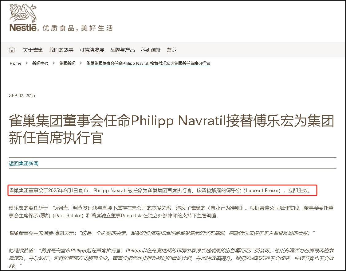 9月2日,從雀巢官網(wǎng)獲悉,雀巢集團(tuán)董事會于2025年9月1日宣布,Philipp Navratil被任命為雀巢集團(tuán)首席執(zhí)行官,接替被解雇的傅樂宏(Laurent Freixe),立即生效。 傅樂宏的突然離任并非常規(guī)人事變動,而是源于一項內(nèi)部調(diào)查 —— 調(diào)查結(jié)果顯示,他與直接下屬存在未公開的戀愛關(guān)系,這一行為已明確違反雀巢集團(tuán)《商業(yè)行為準(zhǔn)則》,成為董事會作出解雇決定的核心原因。 公開資料顯示,傅樂宏于1986年加入雀巢,工作時間超過40年,歷任歐洲大區(qū)負(fù)責(zé)人、美洲大區(qū)首席執(zhí)行官、拉丁美洲大區(qū)首席執(zhí)行官等職務(wù)。 2024年9月,傅樂宏接任雀巢集團(tuán)CEO一職。在接棒擔(dān)任雀巢CEO后,傅樂宏改變了雀巢的策略,從此前通過出售和并購改善業(yè)務(wù)結(jié)構(gòu),轉(zhuǎn)變?yōu)樾碌木劢箲?zhàn)略—— “數(shù)量更少、規(guī)模更大、效果更好(fewer, bigger, better)”。 在傅樂宏主導(dǎo)下,今年3月,雀巢宣布收購了徐福記剩余40%的股份,完成對其全資控股。2011年,雀巢曾收購徐福記60%的股份。此次收購,也是近年來雀巢在中國較大規(guī)模的一次并購動作。 據(jù)雀巢官網(wǎng)介紹,Philipp于2001年加入雀巢,擔(dān)任內(nèi)部審計員。在中美洲承擔(dān)多個商業(yè)角色后,他于2009年被任命為雀巢洪都拉斯市場負(fù)責(zé)人。2013年,Philipp負(fù)責(zé)墨西哥的咖啡和飲料業(yè)務(wù),在增強(qiáng)雀巢咖啡品牌方面發(fā)揮了關(guān)鍵作用。 2020年,他轉(zhuǎn)任雀巢咖啡戰(zhàn)略業(yè)務(wù)部門,負(fù)責(zé)制定全球戰(zhàn)略并推動雀巢咖啡和星巴克咖啡品牌的創(chuàng)新。他于2024年7月開始領(lǐng)導(dǎo)奈斯派索,加速了品牌增長并打造了強(qiáng)勁的增長勢頭。Philipp于2025年1月1日加入雀巢集團(tuán)執(zhí)行董事會。 雀巢集團(tuán)首席執(zhí)行官Philipp表示:“我非常榮幸能得到董事會的信任,而肩負(fù)起引領(lǐng)雀巢走向未來的責(zé)任,對我而言更是一份榮耀。我完全支持公司的戰(zhàn)略方向,以及現(xiàn)有的業(yè)績提升行動計劃。我期待與集團(tuán)全體領(lǐng)導(dǎo)層密切合作,與集團(tuán)董事會、董事會主席保羅·薄凱和候任董事會主席Pablo Isla保持一致,共同加速執(zhí)行并全力推進(jìn)價值創(chuàng)造計劃! 對于再次更換CEO,雀巢董事會主席保羅·薄凱表示:“這是一個必要的決定。雀巢的價值觀和治理是雀巢集團(tuán)的堅實基礎(chǔ)。感謝傅樂宏多年來為雀巢所做的貢獻(xiàn)! 同時他也強(qiáng)調(diào),“我很高興宣布Philipp擔(dān)任首席執(zhí)行官。Philipp以在充滿挑戰(zhàn)的環(huán)境中取得卓越成果的出色履歷而廣受認(rèn)可。他以充滿活力的領(lǐng)導(dǎo)風(fēng)格激勵團(tuán)隊,并以協(xié)作、包容的管理方式領(lǐng)導(dǎo)企業(yè)。董事會相信他將推動我們的增長計劃,并加快效率提升。我們的戰(zhàn)略方向不會改變,業(yè)績節(jié)奏也不會放緩! 從業(yè)績表現(xiàn)來看,2025年上半年財報顯示,受匯率影響,雀巢集團(tuán)銷售額下降1.8%至442.28億瑞士法郎;有機(jī)增長率為2.9%,其中實際內(nèi)部增長率為0.2%,定價貢獻(xiàn)率為2.7%,反映出消費(fèi)需求疲軟以及消費(fèi)者和客戶在適應(yīng)價格上漲過程中產(chǎn)生的短期影響。 報告期內(nèi),雀巢在大中華區(qū)的有機(jī)增長率為-4.2%。其中,實際內(nèi)部增長率為-1.5%,定價貢獻(xiàn)率為-2.7%,這是由于雀巢開始調(diào)整業(yè)務(wù)模式,轉(zhuǎn)向以拉動消費(fèi)者需求為核心,第二季度銷售額出現(xiàn)下滑。雀巢在中國有近40年歷史,目前運(yùn)營著23家工廠、5個產(chǎn)品創(chuàng)新中心和3個研發(fā)中心等。 |