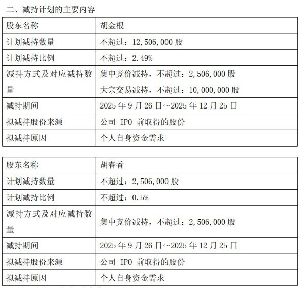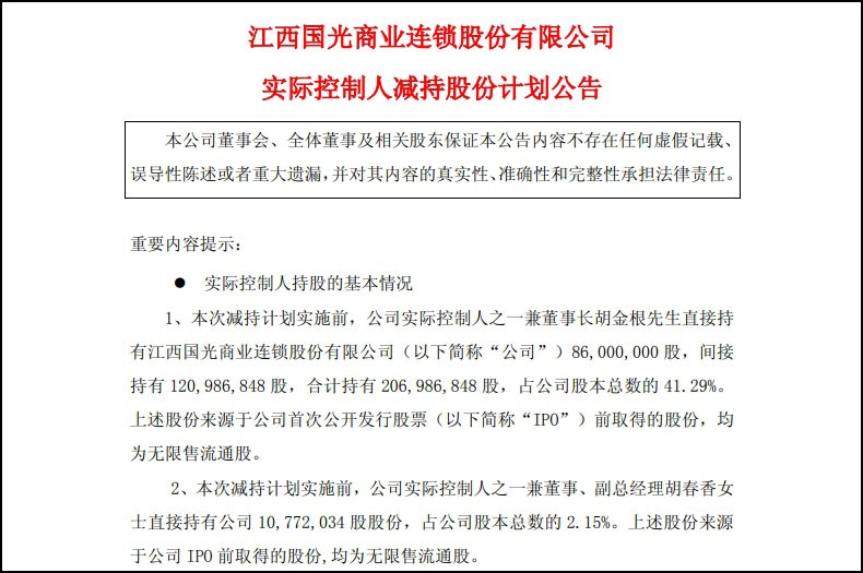 9月4日,國光連鎖發(fā)布公告稱,公司實際控制人之一、董事長胡金根,擬通過集中競價或大宗交易方式減持公司股份,減持數(shù)量不超過1250.6萬股,占公司總股本的比例不超過2.49%。 同時,公司另一實際控制人、董事兼副總經(jīng)理胡春香,計劃在同一期間通過集中競價交易方式減持股份,減持數(shù)量不超過250.6萬股,占公司總股本的0.50%。綜上,二人合計擬減持股份比例不超過公司總股本的2.99%。 公告顯示,胡金根和胡春香二人為兄妹關(guān)系,減持原因均是“個人自身資金需求”,減持期間為2025年9月26日—12月25日。國光連鎖同時強調(diào),本次減持計劃實施不會導(dǎo)致公司控制權(quán)發(fā)生變更,不會對公司治理結(jié)構(gòu)、持續(xù)經(jīng)營等產(chǎn)生重大影響。值得關(guān)注的是,此次披露的減持計劃,是胡金根、胡春香自國光連鎖上市以來首次提出的減持計劃。 若以國光連鎖9月4日21.95元的收盤價計算,若二人在減持計劃期間全額實施減持(合計1501.2萬股),預(yù)計將合計套現(xiàn)近3.3億元。 或受減持計劃消息影響,國光連鎖股價在短期內(nèi)出現(xiàn)明顯波動。9月4日公司股價收于21.95元,創(chuàng)下歷史新高;但 9月5日股價直接跌停,截至收盤報19.76元/股,總市值為99.07億元。 公開資料顯示,國光連鎖成立于2005 年11月,總部位于江西省吉安市,主營業(yè)務(wù)為連鎖超市與百貨商場的經(jīng)營,門店主要分布在吉安市、贛州市及宜春市,于 2020年7月在上海證券交易所主板上市。 2025年一季度,國光連鎖曾出現(xiàn)凈利潤下滑。該季度實現(xiàn)營業(yè)總收入7.96億元,同比增長5.23%;歸屬于上市公司股東的凈利潤2174.9 萬元,同比下降18.07%;扣除非經(jīng)常性損益后的凈利潤1986.28萬元,同比下降21.55%。 不過,國光連鎖上半年業(yè)績已扭轉(zhuǎn)一季度的下滑態(tài)勢。2025年上半年財報顯示,公司實現(xiàn)營業(yè)收入14.48億元,同比增長6.50%;歸屬于上市公司股東的凈利潤1989.79萬元,同比增長4.15%。 報告期內(nèi),國光連鎖推進門店優(yōu)化調(diào)整,關(guān)閉5家門店;截至2025年半年報期末,公司共擁有41家門店,仍主要集中在江西吉安市、贛州市、宜春市等區(qū)域。 |