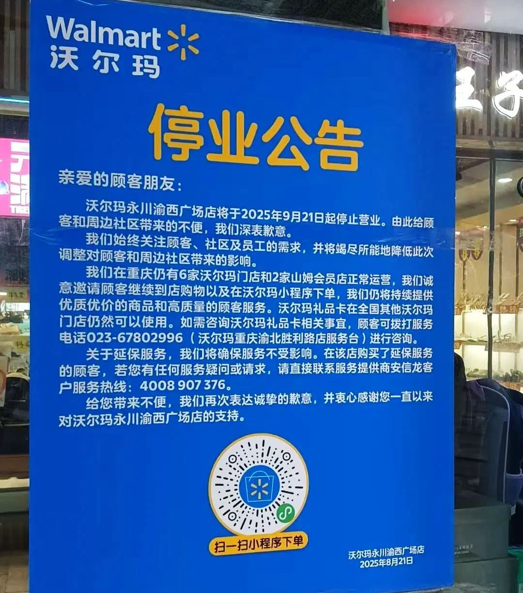 近日,沃爾瑪永川渝西廣場(chǎng)店發(fā)布停業(yè)公告稱,該店將于2025年9月21日起停止?fàn)I業(yè)。 該店關(guān)閉后,沃爾瑪在重慶仍有6家大賣場(chǎng)和2家山姆會(huì)員店正常運(yùn)營(yíng),消費(fèi)者可繼續(xù)到店購(gòu)物,或在沃爾瑪小程序下單。 據(jù)悉,永川渝西廣場(chǎng)店于2010年12月開業(yè),至今已有近15年時(shí)間。如今突然宣布關(guān)停,令人唏噓不已,有網(wǎng)友表示:‘這里曾是我最喜歡逛的超市,太可惜了! |