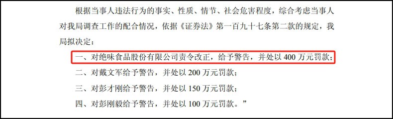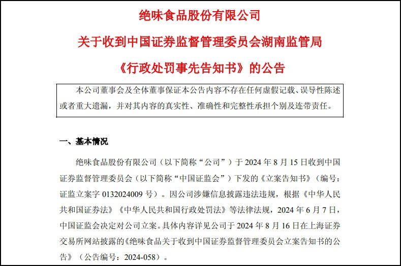 因涉嫌信息披露違法違規(guī),絕味食品及其董事長(zhǎng)等被處罰,公司股票擬被ST。 01 絕味食品被罰400萬(wàn) 日前,絕味食品發(fā)布公告稱(chēng),因涉嫌信息披露違法違規(guī),去年6月7日, 中國(guó)證監(jiān)會(huì)決定對(duì)絕味食品立案。今年9月19日,公司收到中國(guó)證監(jiān)會(huì)湖南監(jiān)管局下發(fā)的《行政處罰事先告知書(shū)》。 《告知書(shū)》顯示,2017年至2021年期間,絕味食品未確認(rèn)加盟門(mén)店裝修業(yè)務(wù)收入,導(dǎo)致年度報(bào)告少計(jì)營(yíng)業(yè)收入,占對(duì)應(yīng)年度公開(kāi)披露營(yíng)業(yè)收入的比例分別為5.48%、3.79%、2.20%、2.39%、1.64%。公司2017年至2021年各年年度報(bào)告未如實(shí)披露營(yíng)業(yè)收入。 中國(guó)證監(jiān)會(huì)湖南監(jiān)管局認(rèn)為,絕味食品上述行為涉嫌違反《證券法》等相關(guān)法律規(guī)定。為此,該局決定對(duì)絕味食品責(zé)令改正,給予警告,并處以400萬(wàn)元罰款;對(duì)時(shí)任董事長(zhǎng)兼總經(jīng)理戴文軍給予警告,并處以200萬(wàn)元罰款;對(duì)時(shí)任財(cái)務(wù)總監(jiān)彭才剛給予警告,并處以150萬(wàn)元罰款;對(duì)時(shí)任董事會(huì)秘書(shū)彭剛毅給予警告,并處以100萬(wàn)元罰款。此次處罰共計(jì)850萬(wàn)元。 絕味食品公告稱(chēng),公司A股股票簡(jiǎn)稱(chēng)由“絕味食品”變更為“ST 絕味”; 證券代碼仍為603517;實(shí)施風(fēng)險(xiǎn)警示的起始日為2025年9月23日。 該公司股票今天(9月22日)停牌1天,2025年9月23日起實(shí)施其他風(fēng)險(xiǎn)警示。實(shí)施其他風(fēng)險(xiǎn)警示后,該公司股票將在風(fēng)險(xiǎn)警示板交易,股票價(jià)格的日漲跌幅限制為5%。 02 近兩年業(yè)績(jī)下滑明顯 門(mén)店數(shù)量減少了4244家 去年全年,該公司歸母凈利潤(rùn)2.27億元,同比減少34%。今年上半年,該公司營(yíng)業(yè)收入約28.2億元,同比減少15.57%;歸屬于上市公司股東的凈利潤(rùn)約1.75億元,同比減少40.71%。報(bào)告稱(chēng),公司上半年?duì)I收下降主要系報(bào)告期內(nèi)銷(xiāo)量下降。 鹵制食品銷(xiāo)售是絕味食品收入的主要來(lái)源。今年上半年,該公司鹵制食品銷(xiāo)售收入為23.40億元,占到同期主營(yíng)業(yè)務(wù)收入的84.88%。 官網(wǎng)資料顯示,絕味食品公司成立于2005年4月15日,注冊(cè)資本6億元。該公司于2017年3月17日上市。其中,鹵制品絕味鴨脖是其拳頭產(chǎn)品,絕味食品也因此被外界稱(chēng)為“鴨脖大王”。數(shù)據(jù)顯示,其鴨脖原料消耗達(dá)到1萬(wàn)噸,零售規(guī)模超過(guò)60億元。 窄門(mén)數(shù)據(jù)顯示,2022年以來(lái),絕味鴨脖門(mén)店開(kāi)店數(shù)量開(kāi)始減少。截至目前,絕味鴨脖門(mén)店數(shù)量為10725家。據(jù)絕味財(cái)報(bào)顯示,截至2024年6月底,絕味食品內(nèi)地門(mén)店總數(shù)為14969家。照此計(jì)算,近一年多來(lái),其門(mén)店數(shù)量減少了4244家。 03 鴨脖賣(mài)不動(dòng)了 近年,鹵味三巨頭仍未能擺脫“魔咒”,絕味食品、周黑鴨、煌上煌三家公司的營(yíng)收、凈利潤(rùn)均出現(xiàn)下滑,“最差業(yè)績(jī)”距離高光時(shí)刻越來(lái)越遠(yuǎn)。 據(jù)新京報(bào)貝殼財(cái)經(jīng)梳理,極速擴(kuò)張后,三家公司2024年開(kāi)始收縮版圖,其中,煌上煌和周黑鴨一年時(shí)間關(guān)店七八百家。相比之下,絕味食品收縮的步子邁得更大,門(mén)店總數(shù)從2023年底的15950家滑落至目前的10725家。 近年來(lái),市場(chǎng)競(jìng)爭(zhēng)加劇、消費(fèi)環(huán)境變化、門(mén)店布局調(diào)整等原因,導(dǎo)致鹵味行業(yè)市場(chǎng)增速放緩。在業(yè)內(nèi)看來(lái),醬鹵肉制品行業(yè)正經(jīng)歷從“規(guī)模擴(kuò)張”向“質(zhì)量競(jìng)爭(zhēng)”的轉(zhuǎn)型期,供應(yīng)鏈整合能力、食品安全管理及差異化創(chuàng)新能力將成為企業(yè)突圍的核心要素。 |