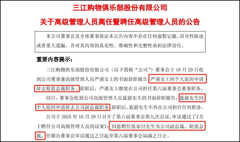 10月29日,三江購(gòu)物發(fā)布公告,宣布公司高級(jí)管理人員的變動(dòng)情況。 公告顯示,嚴(yán)謹(jǐn)女士因個(gè)人原因辭去輪值總裁職務(wù),同時(shí)繼續(xù)擔(dān)任公司董事;藍(lán)蔚先生因個(gè)人原因辭去副總裁職務(wù),并將不再在公司及其控股子公司任職。 此次變動(dòng)中,張家付先生被聘任為公司副總裁及輪值總裁,任期至第六屆董事會(huì)屆滿之日止。張家付先生具備相應(yīng)任職資格,不存在不適宜擔(dān)任該職務(wù)的情形。 資料顯示,張家付先生,中國(guó)國(guó)籍,1988年10月18日出生,本科學(xué)歷。曾任三江購(gòu)物門店店長(zhǎng)、區(qū)域總經(jīng)理、農(nóng)產(chǎn)品基地開發(fā)總經(jīng)理,現(xiàn)任三江購(gòu)物生鮮業(yè)務(wù)總監(jiān)。 同日,三江購(gòu)物還發(fā)布三季度財(cái)報(bào)。報(bào)告顯示,2025年第三季度營(yíng)業(yè)收入10億元,同比下降0.81%;歸屬于上市公司股東的凈利潤(rùn)為2312.08萬元,同比下降46.64%。前三季度營(yíng)業(yè)收入為29.88億元,同比增長(zhǎng)0.59%;歸屬于上市公司股東的凈利潤(rùn)為1.14億元,同比下降5.42%。 期內(nèi),三江購(gòu)物新開門店2家,關(guān)閉門店3家。截至期末,三江購(gòu)物門店總數(shù)為184家,寧波市內(nèi)社區(qū)店數(shù)量為102家(盒馬店7家、鄰里店60家),寧波以外地區(qū)社區(qū)店11家(鄰里店4家)。 |