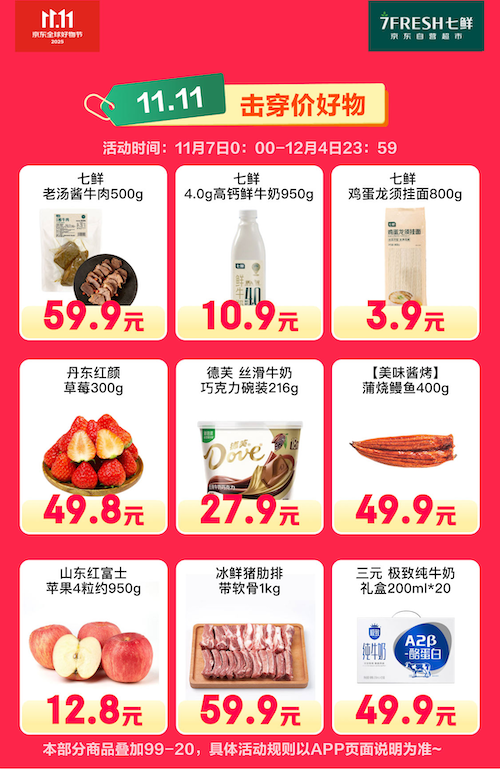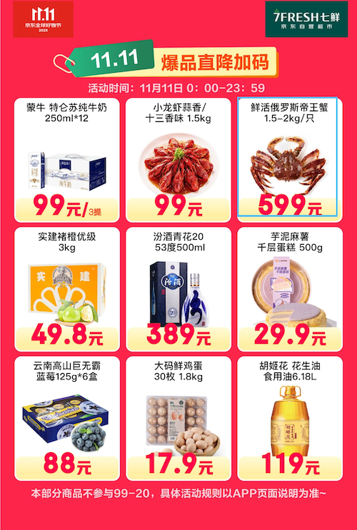 京東七鮮11.11今日啟動“終極放價”,全線商品價格再度擊穿,全時間段火力全開!11月11日,消費者不僅可享多款人氣爆品直接降價,更有全品類、近萬種商品加入“滿99減20”優(yōu)惠行列。每位用戶可領取三張即時到賬的優(yōu)惠券,線上線下通用,輕松湊單,立減無套路,實現“加購即省、暢快囤貨”的購物體驗。 多款熱門爆品今日迎來價格直降:家庭聚餐寵兒鮮活波士頓龍蝦,單只(規(guī)格8兩至1斤)僅需88元,肉質緊實品,蝦肉滿滿,品質與性價比兼具;高端海鮮的代表——鮮活俄羅斯帝王蟹(單只重約3-4斤),更以599元的驚爆價登場,擊穿秋冬高端海鮮市場價,為饕客帶來難得嘗鮮良機。云南高山巨無霸藍莓125g*6盒,果徑超22mm,整箱僅需88元。青花20汾酒53度500ml,聚餐與自飲絕佳選擇,價格同步直降至389元。 從應季水果到鮮活水產,從品質肉禽到日用百貨,即刻下單,即刻鎖定京東七鮮終極放價福利!打開京東APP自營秒送、七鮮APP或微信小程序,疊加最快30分鐘送達的履約服務,新鮮、美味與實惠速速帶回家!新用戶專享商品低至0.01元,前4單返券優(yōu)惠最高可減77元。 |